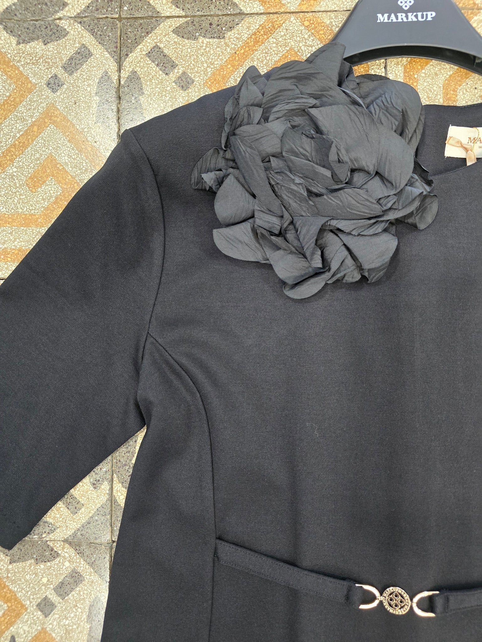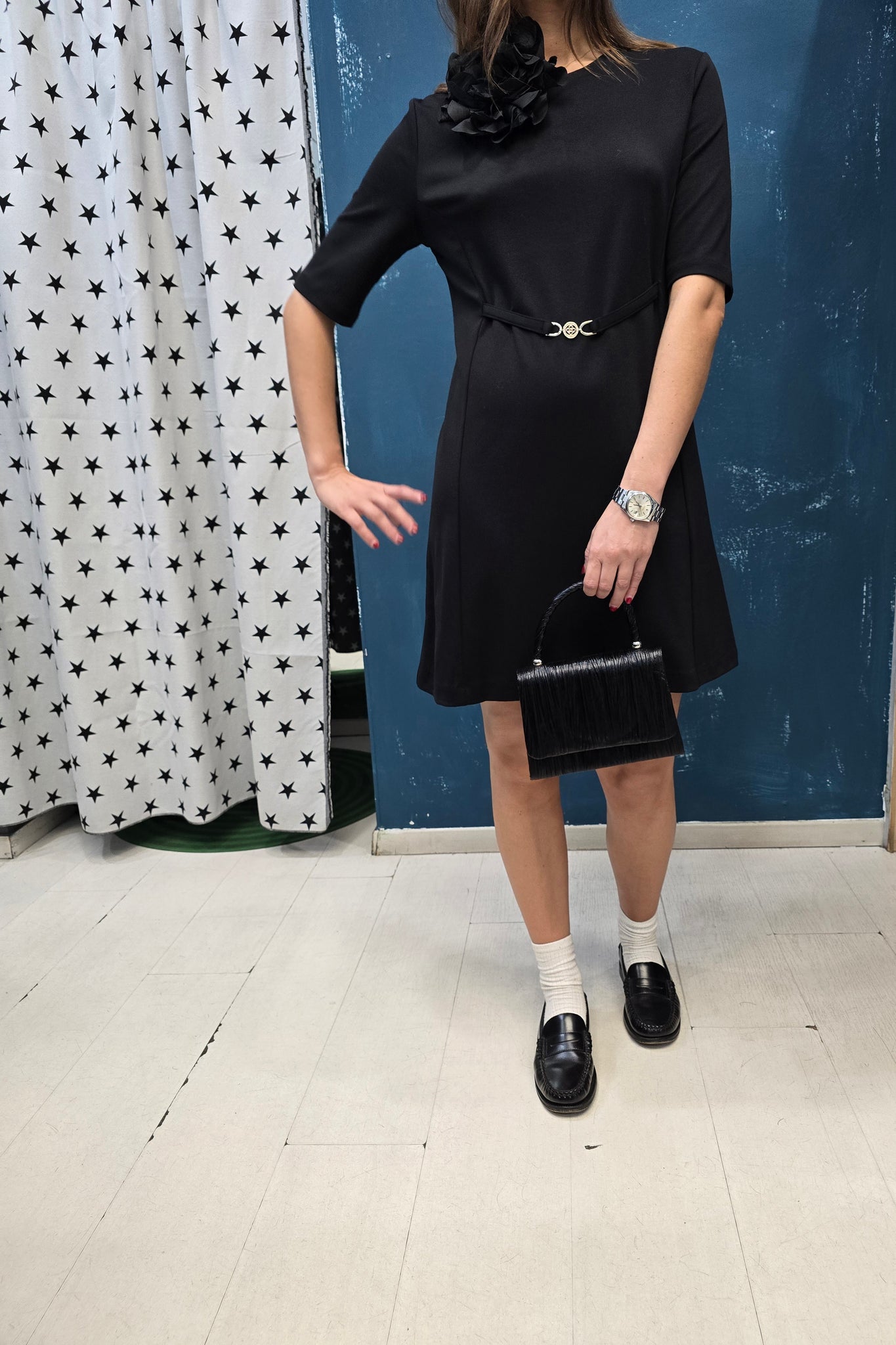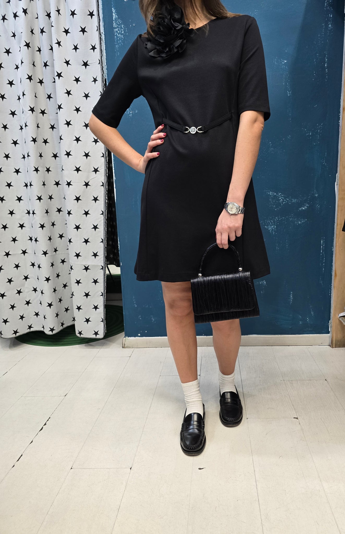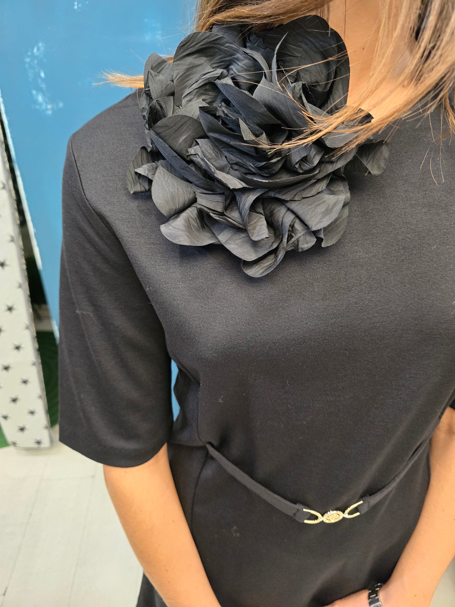 Eleganza milanese con dettaglio prezioso! Questo abito in punto Milano nero con spilla fiore è perfetto per look casual eleganti e femminili.