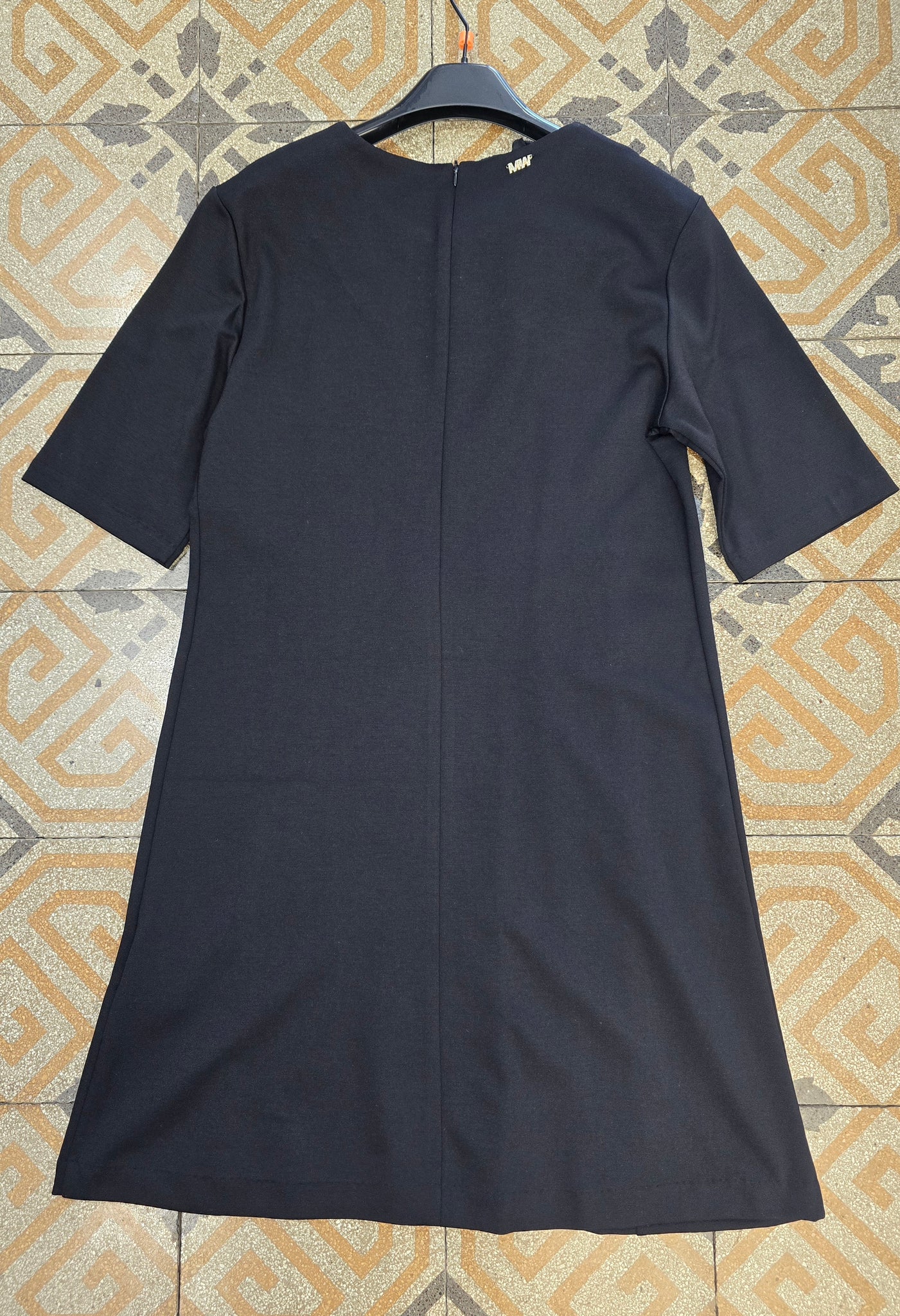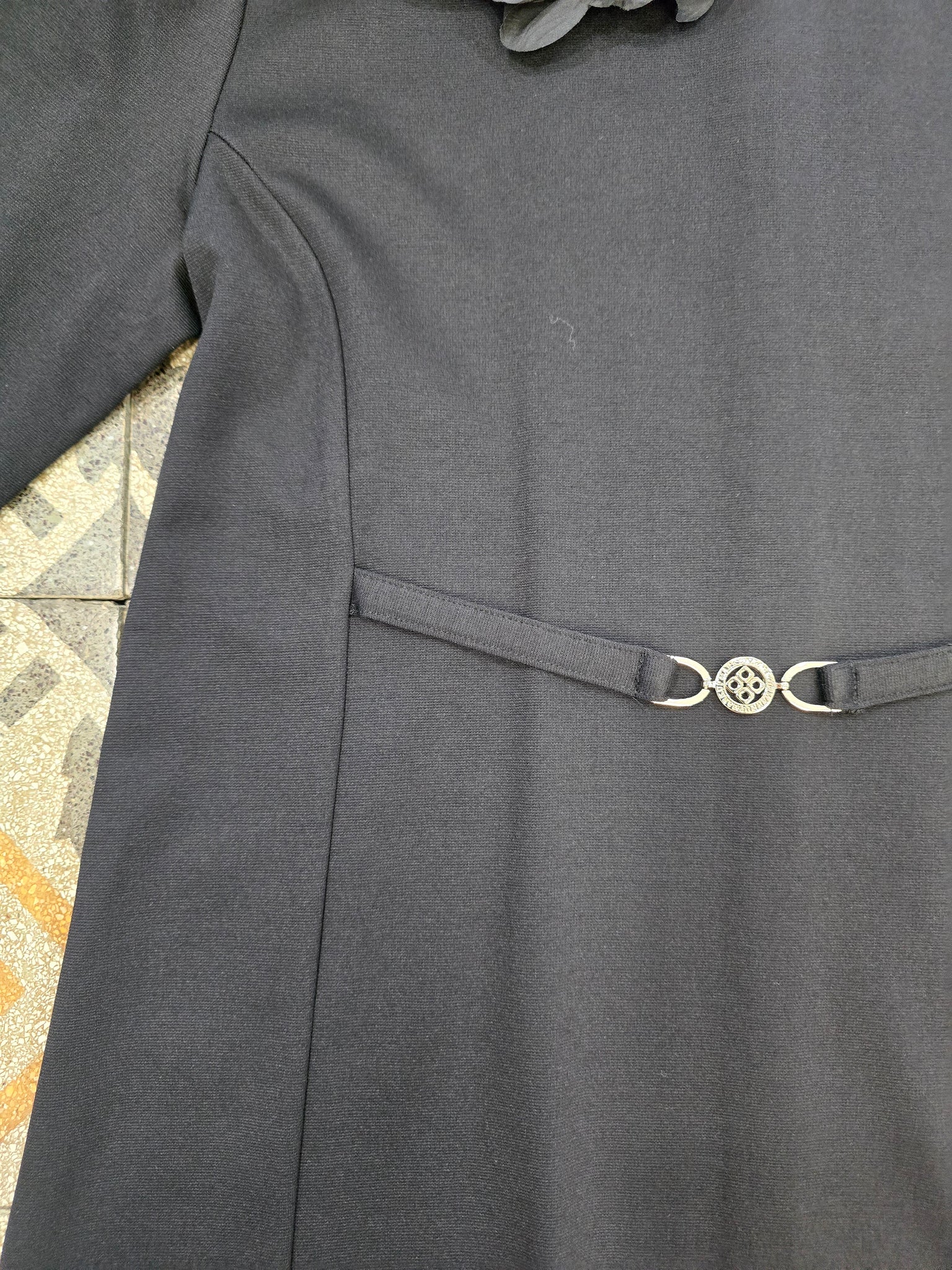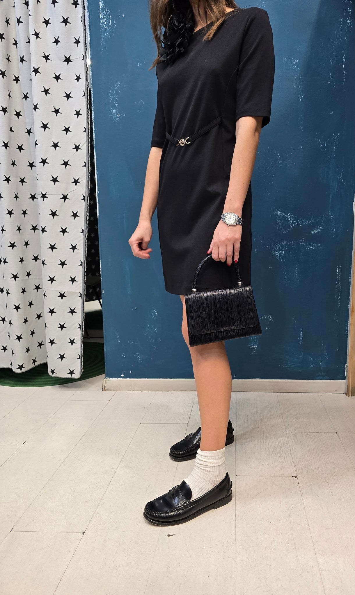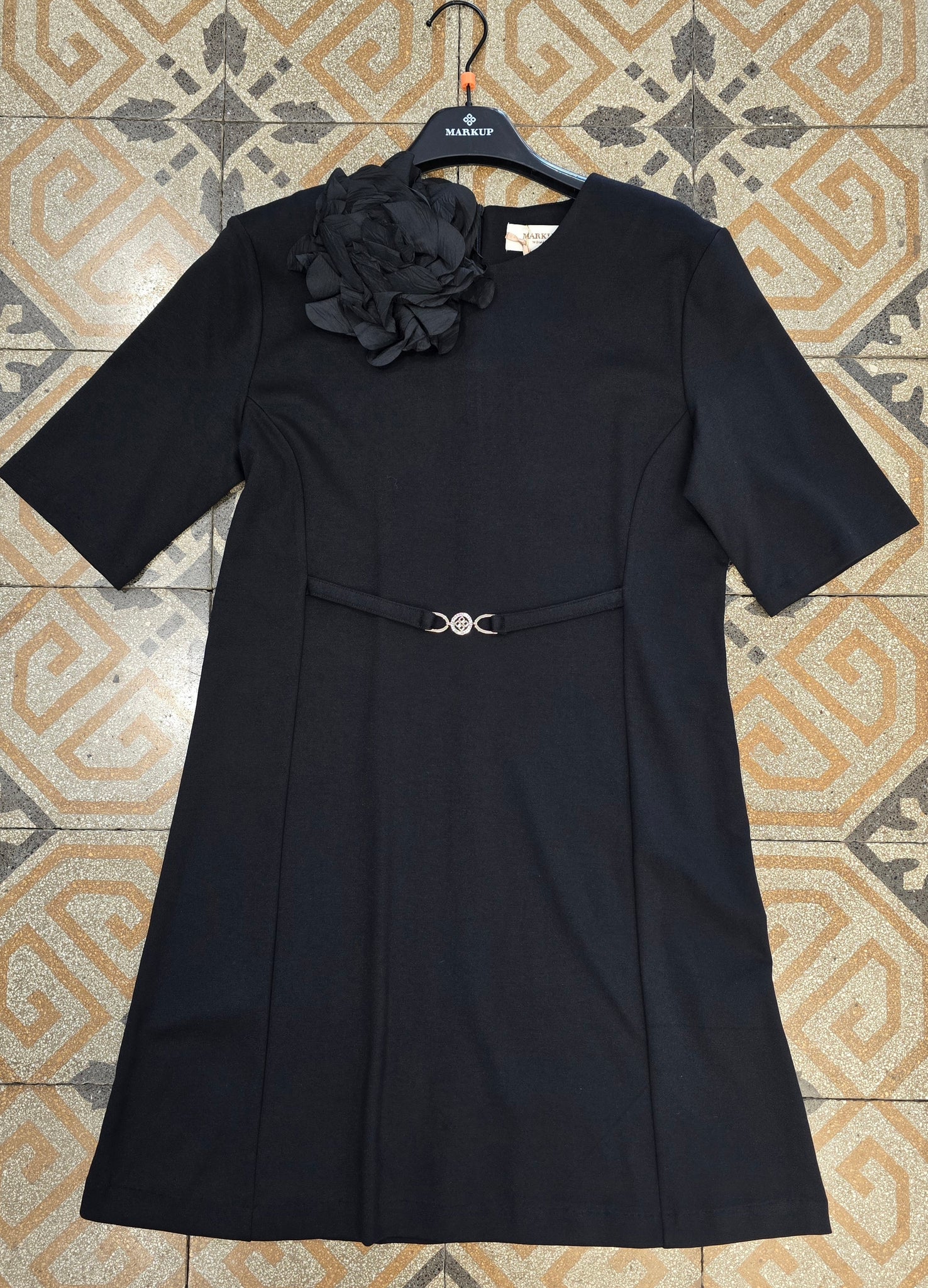 Eleganza milanese con dettaglio prezioso! Questo abito in punto Milano nero con spilla fiore è perfetto per look casual eleganti e femminili.