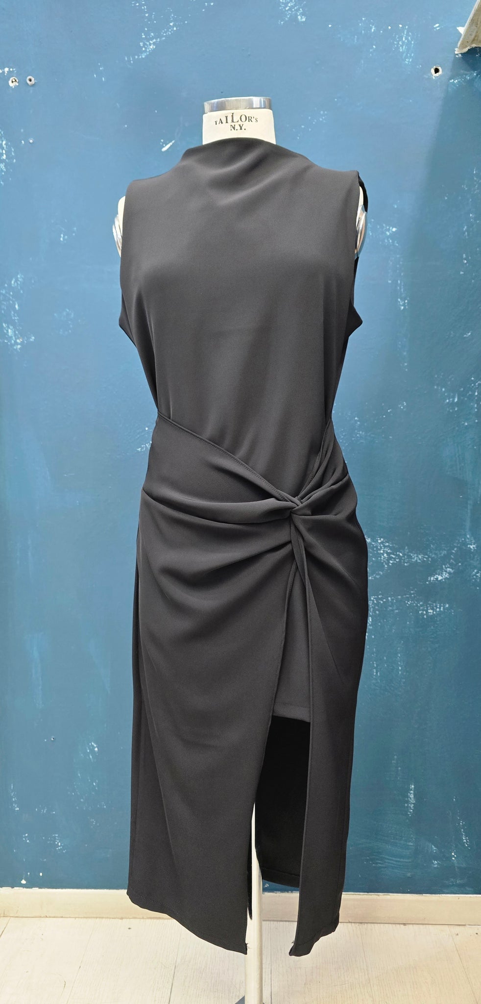 Abito Crepe Smanicato Drappeggio Spacco Nero