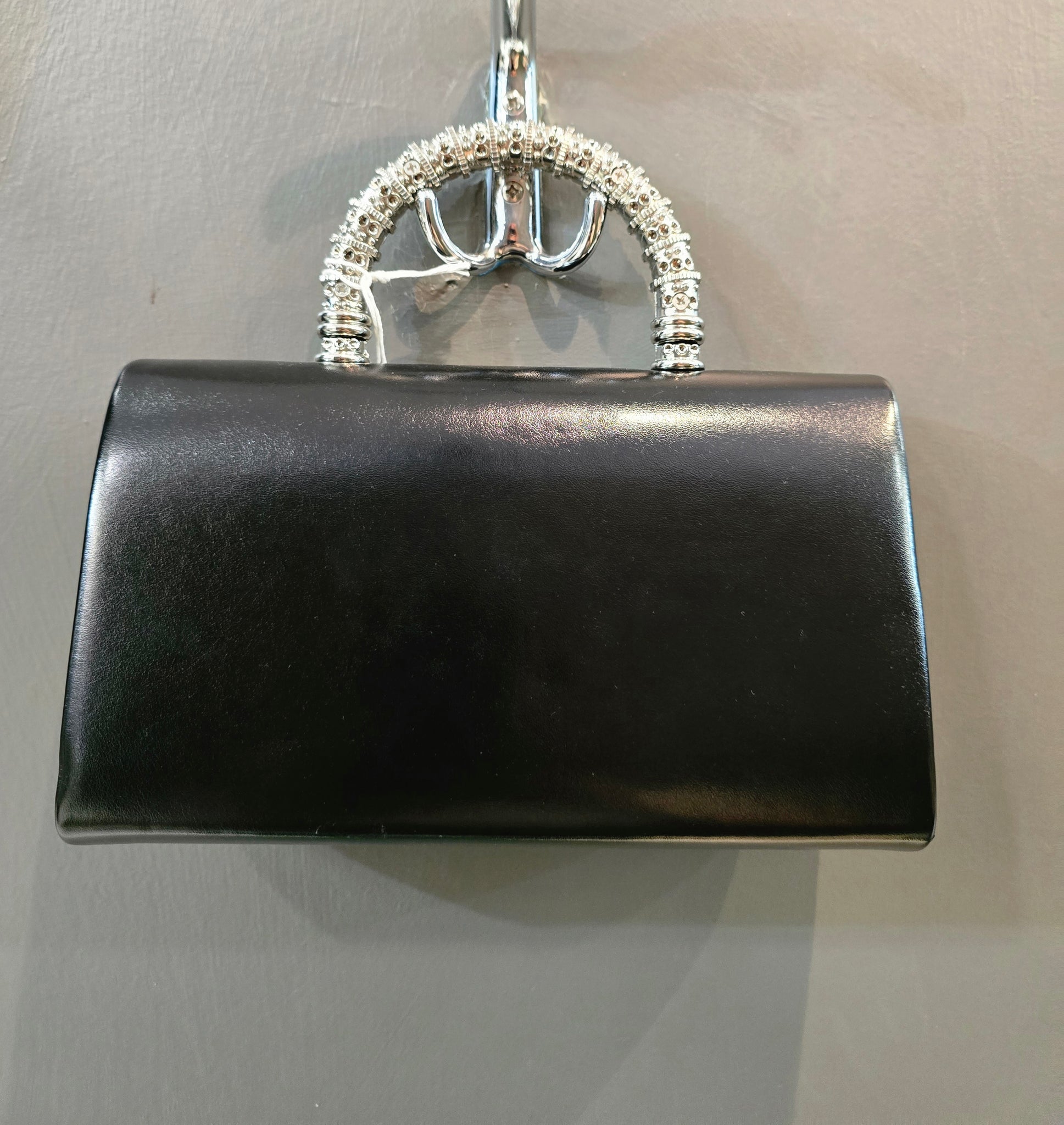 Mini luxury con dettagli preziosi! Questa borsa mini rigida nera con fibbia a pietre e manico traforato è perfetta per feste eleganti e raffinate.