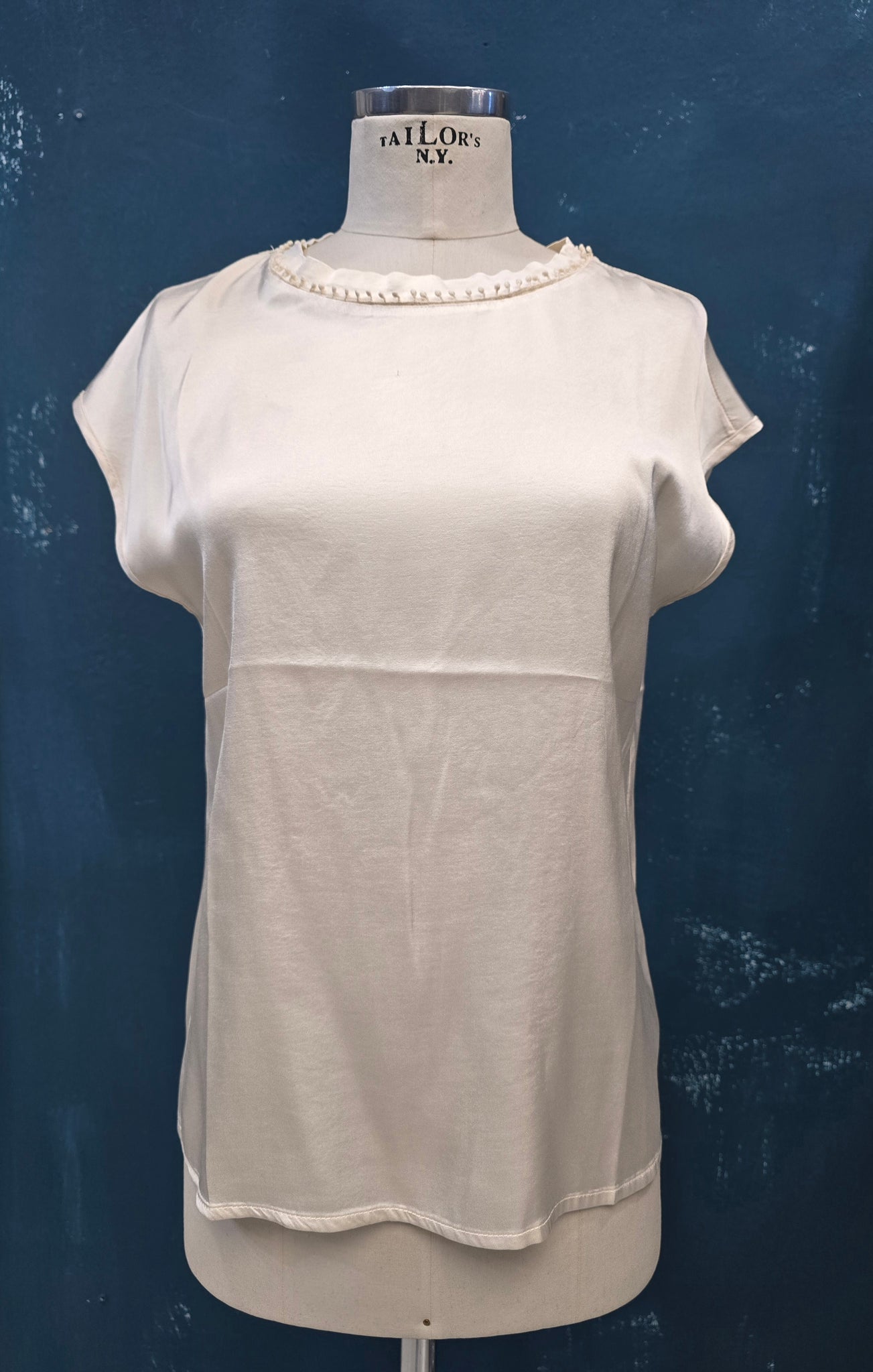Eleganza luminosa che non tramonta! Questa blusa in raso avorio paricollo con mezze maniche è l'essenziale luxury per look casual raffinati e luminosi.