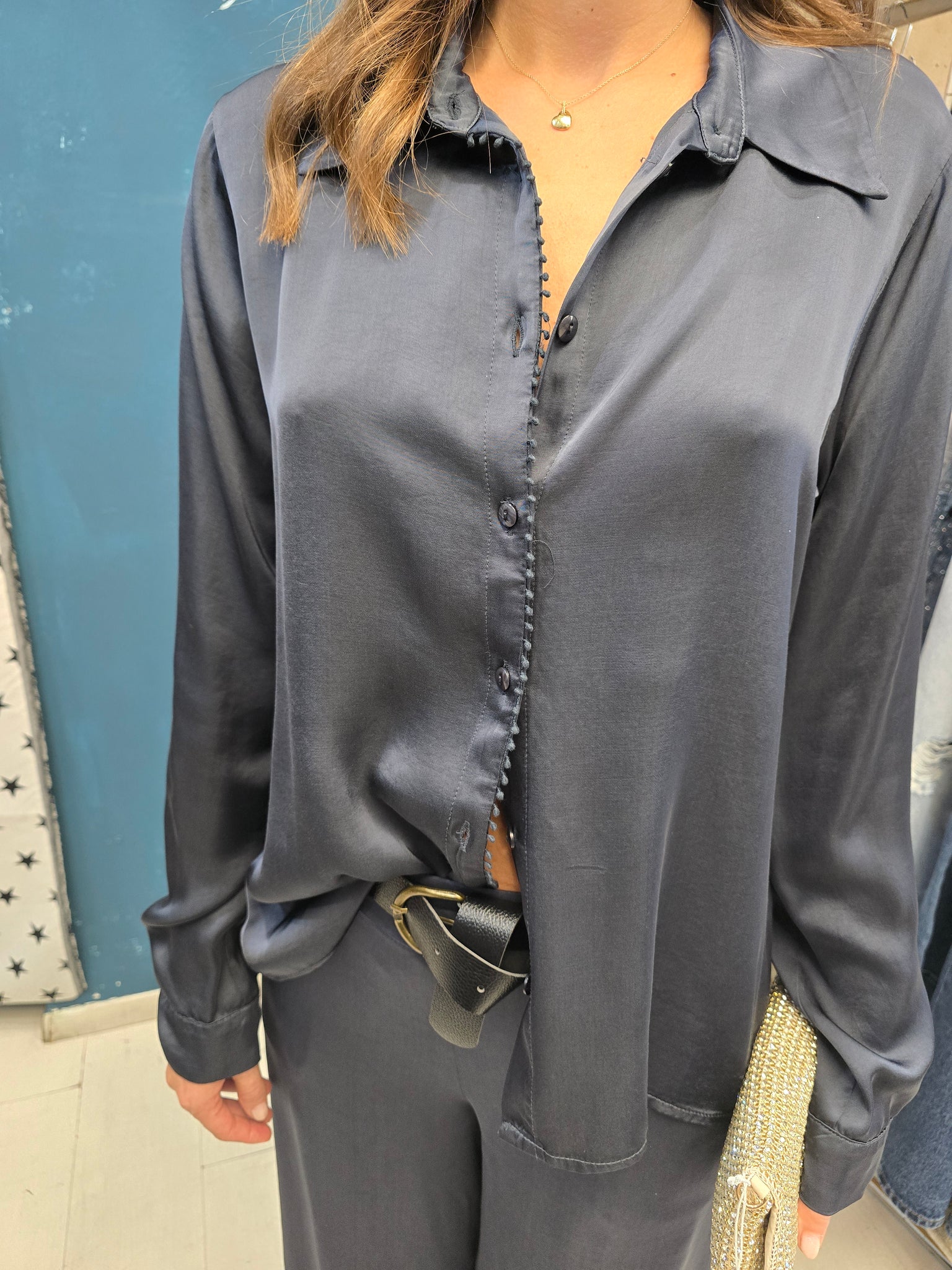 Eleganza setosa che illumina! Questa camicia in raso blu taglia M è perfetta per aggiungere luminosità e carattere ai look di festa eleganti.