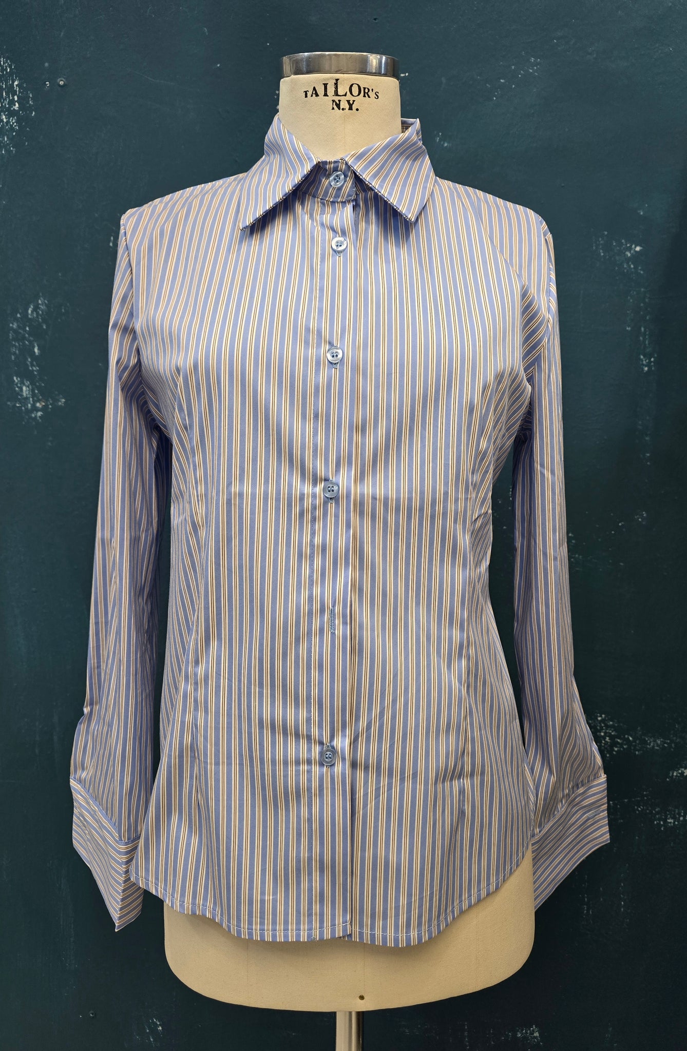 Perfetta per l'ufficio estivo, ideale con pantaloni per eleganza fresca, o con gonne per femminilità marina. Le righe celesti sono sempre chic.