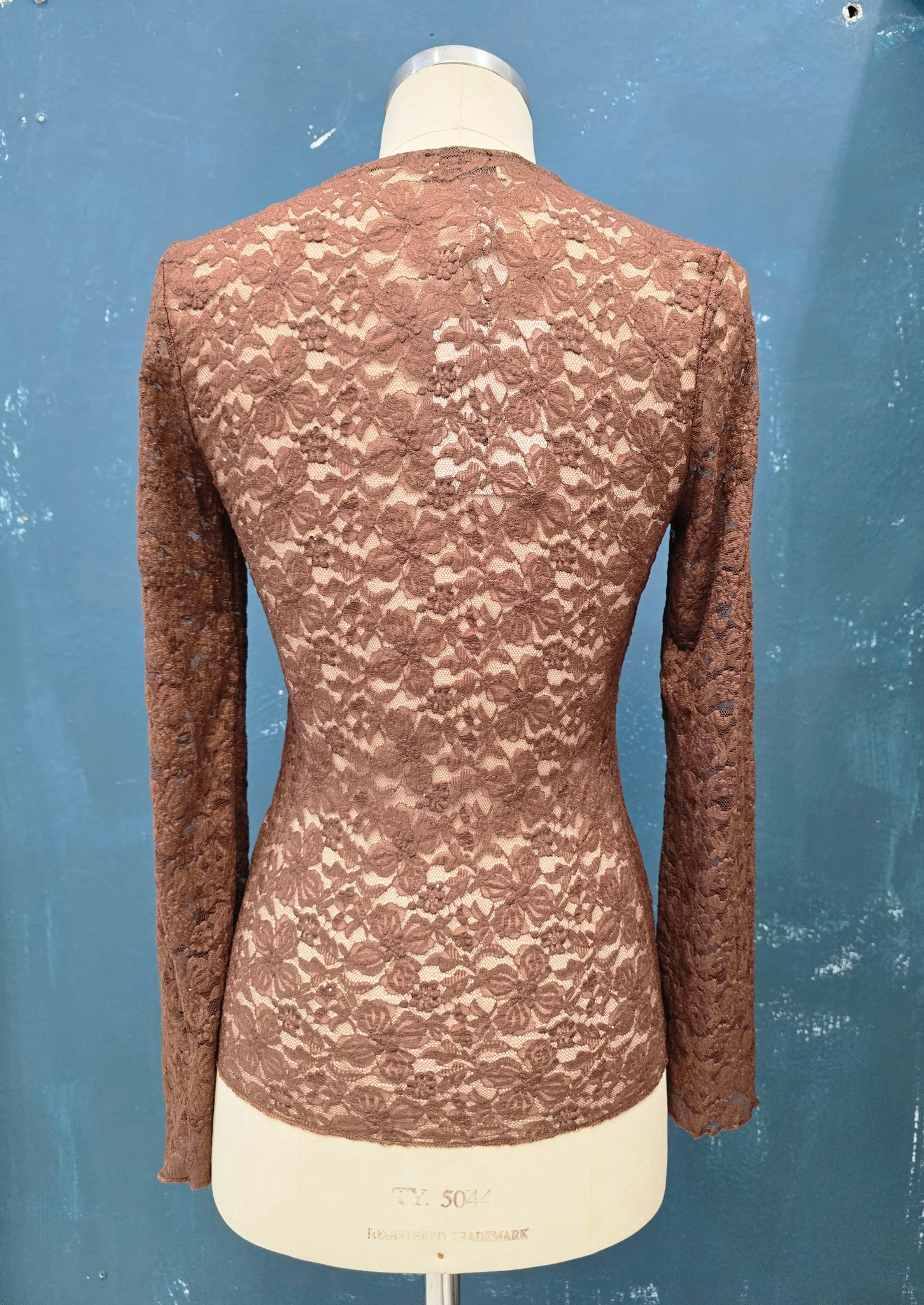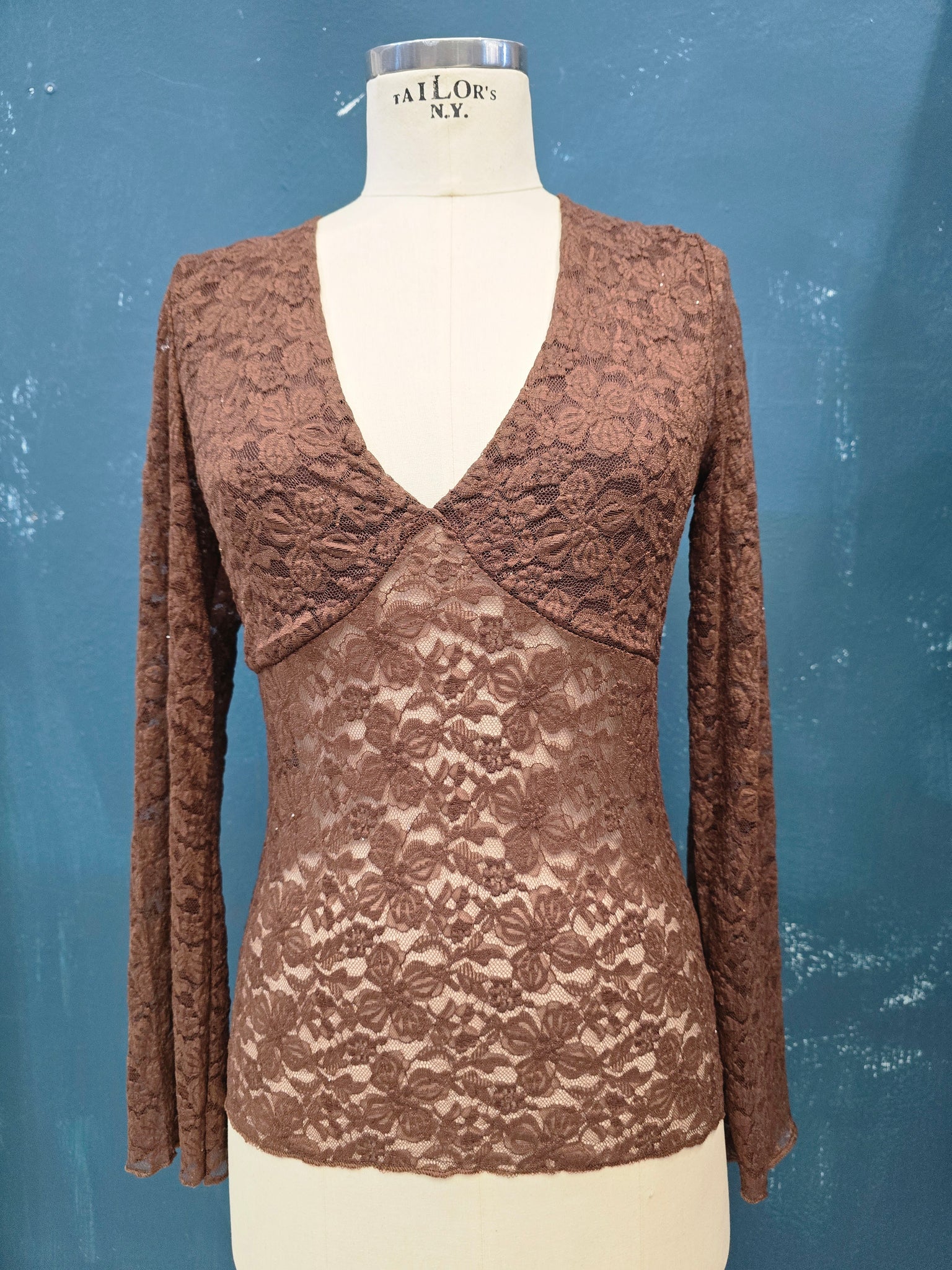 Romanticismo che danza! Questa maglia in pizzo elasticizzata con scollo V e manica svasata caffè è perfetta per aggiungere femminilità poetica ai look.