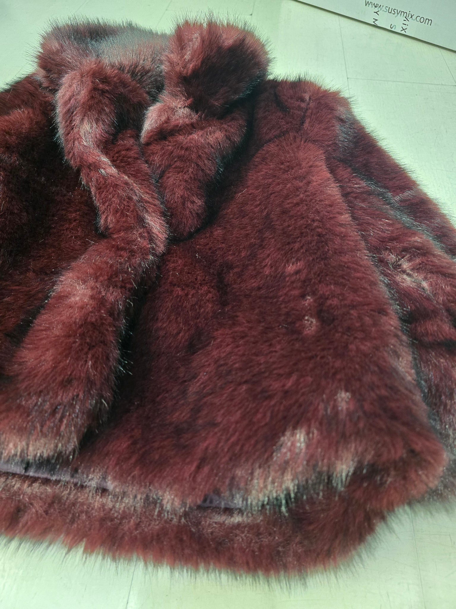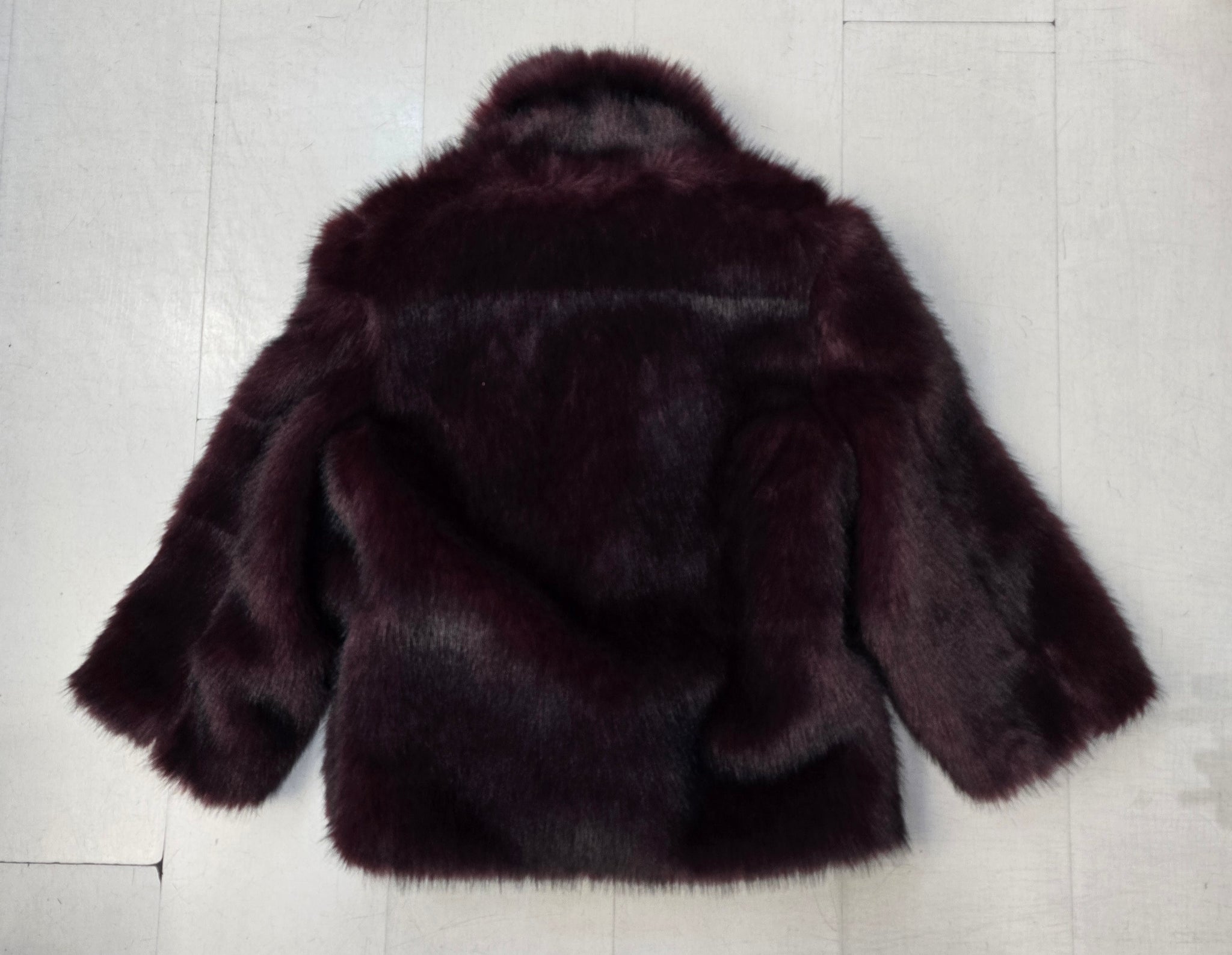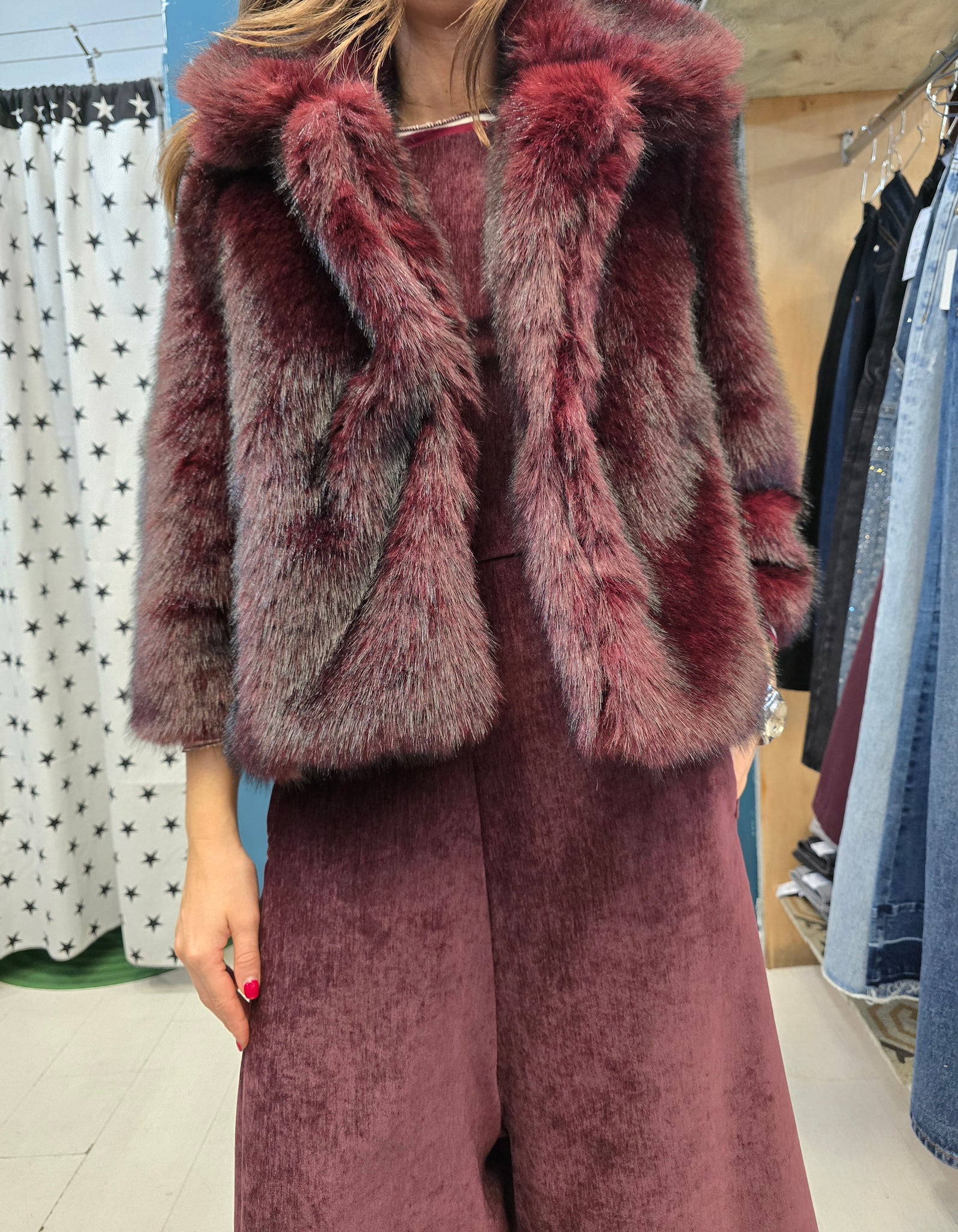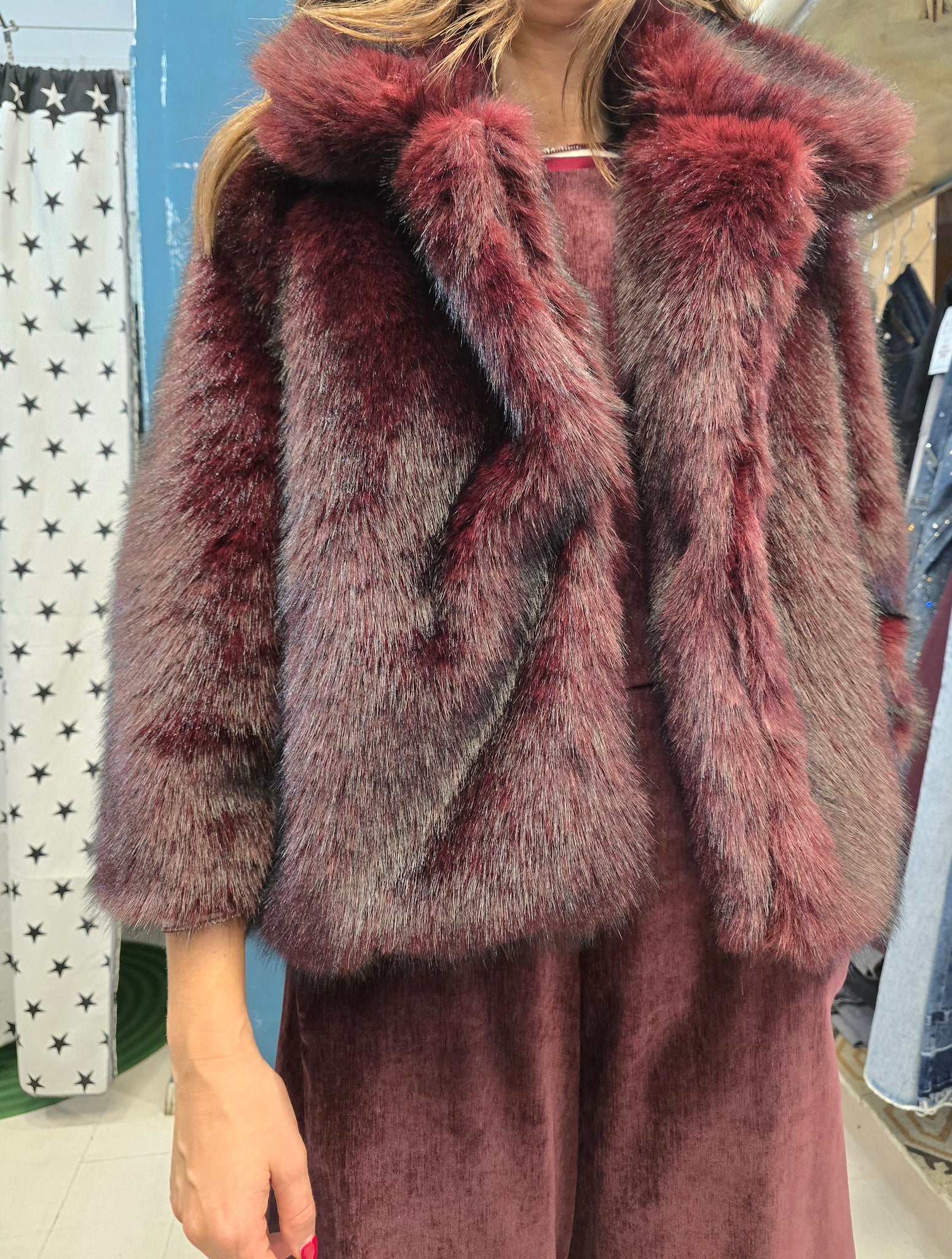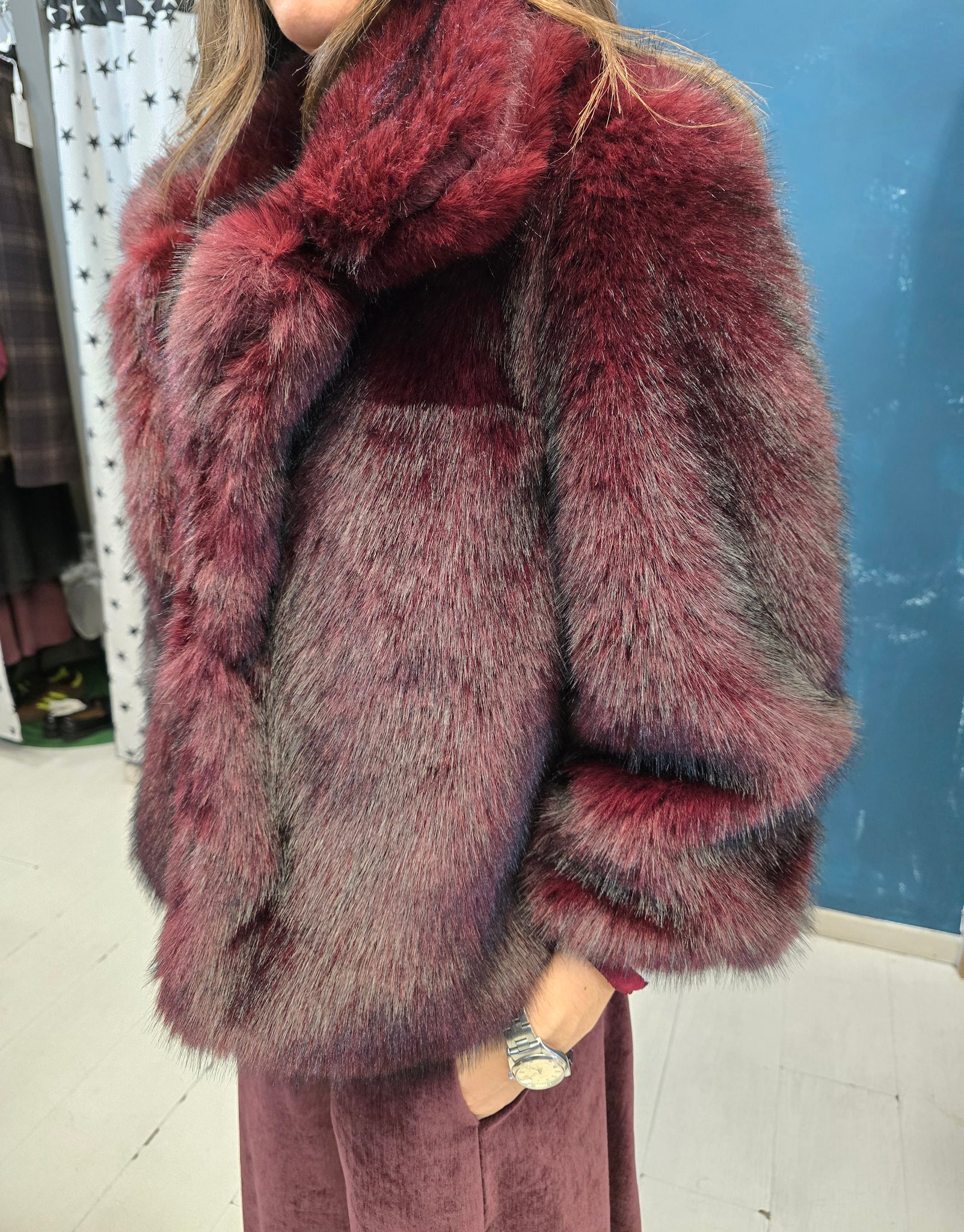 Luxury sostenibile che scalda con stile! Questa ecopelliccia bordeaux è l'alleata perfetta per feste eleganti senza compromessi etici.