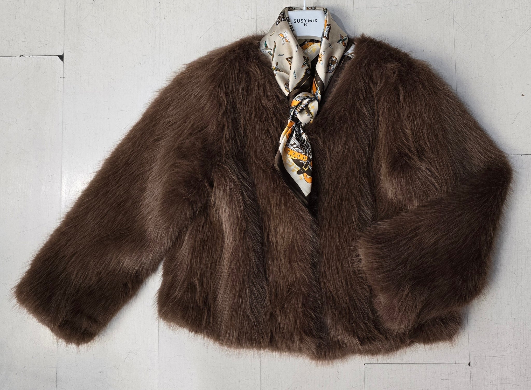 Luxury etico per occasioni speciali! Questa pelliccia ecologica corta con foulard è l'alleata perfetta per serate eleganti sostenibili.