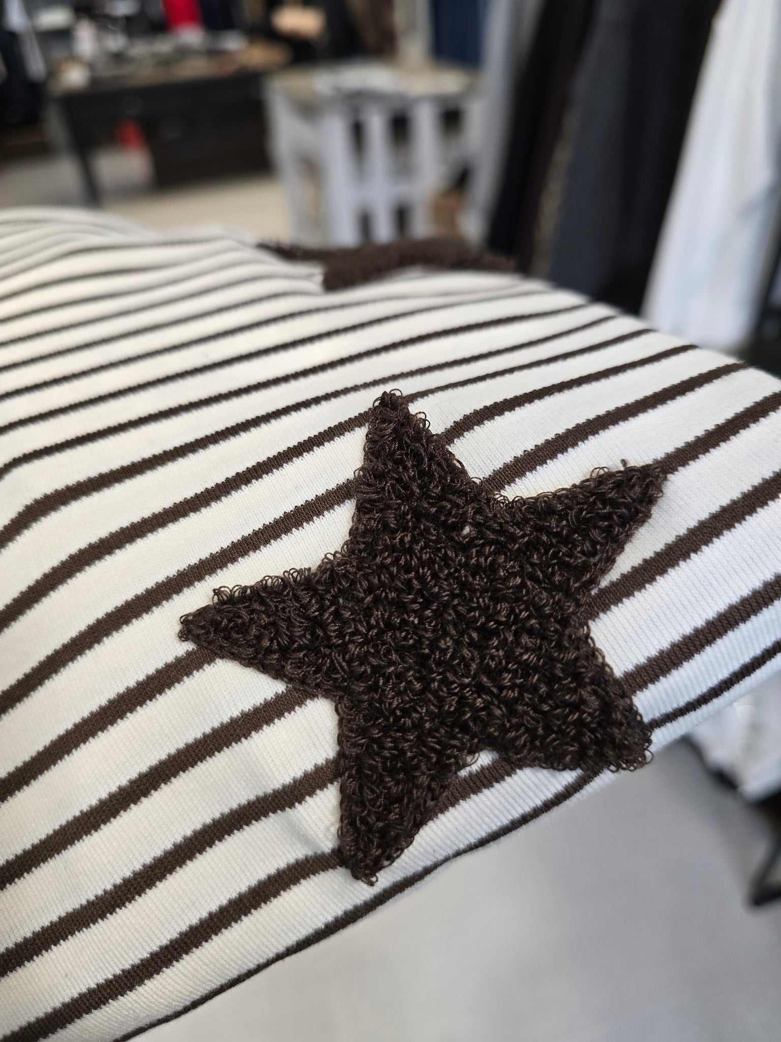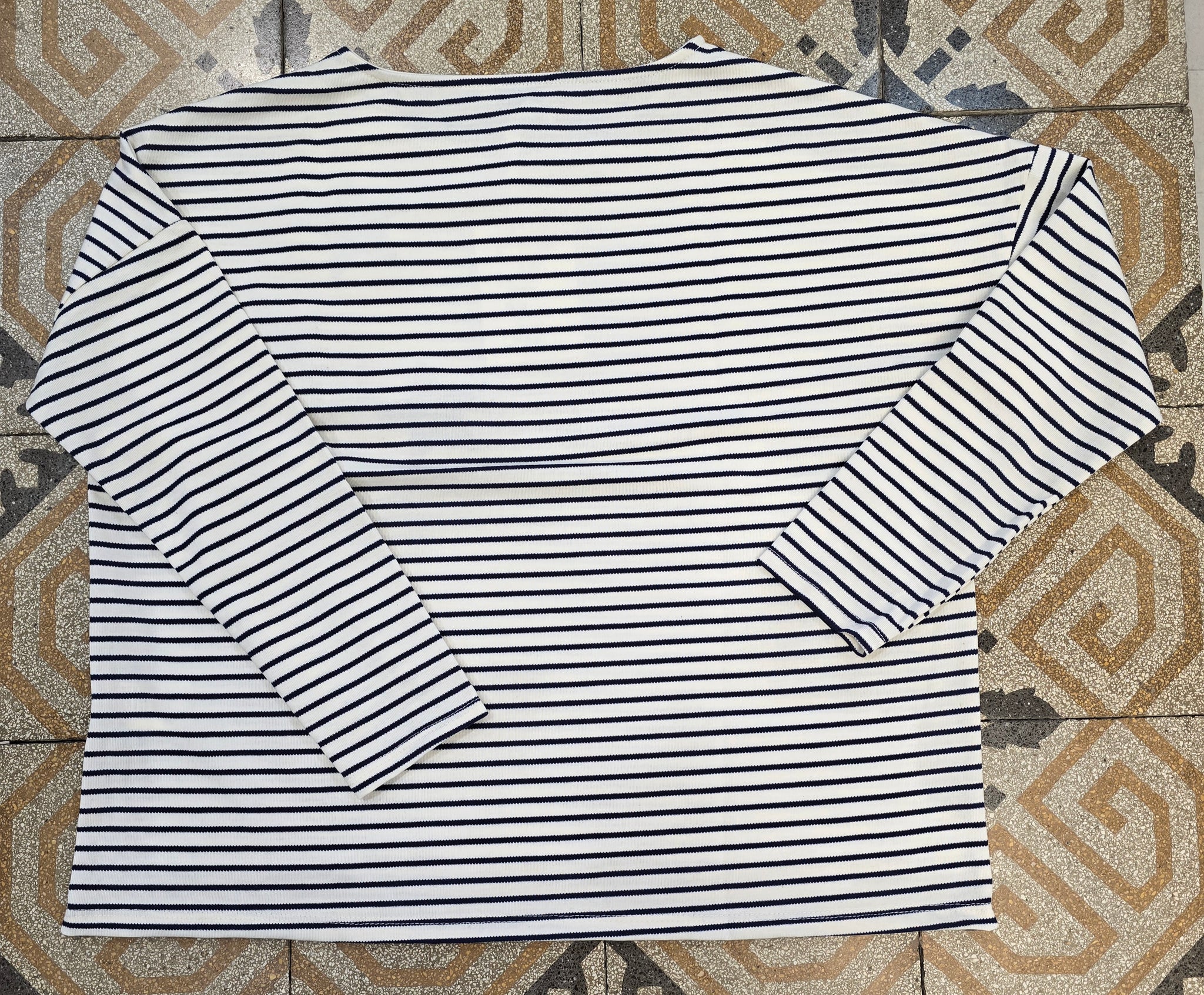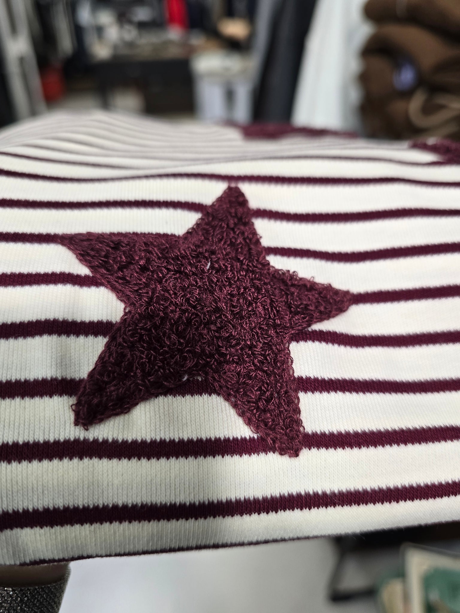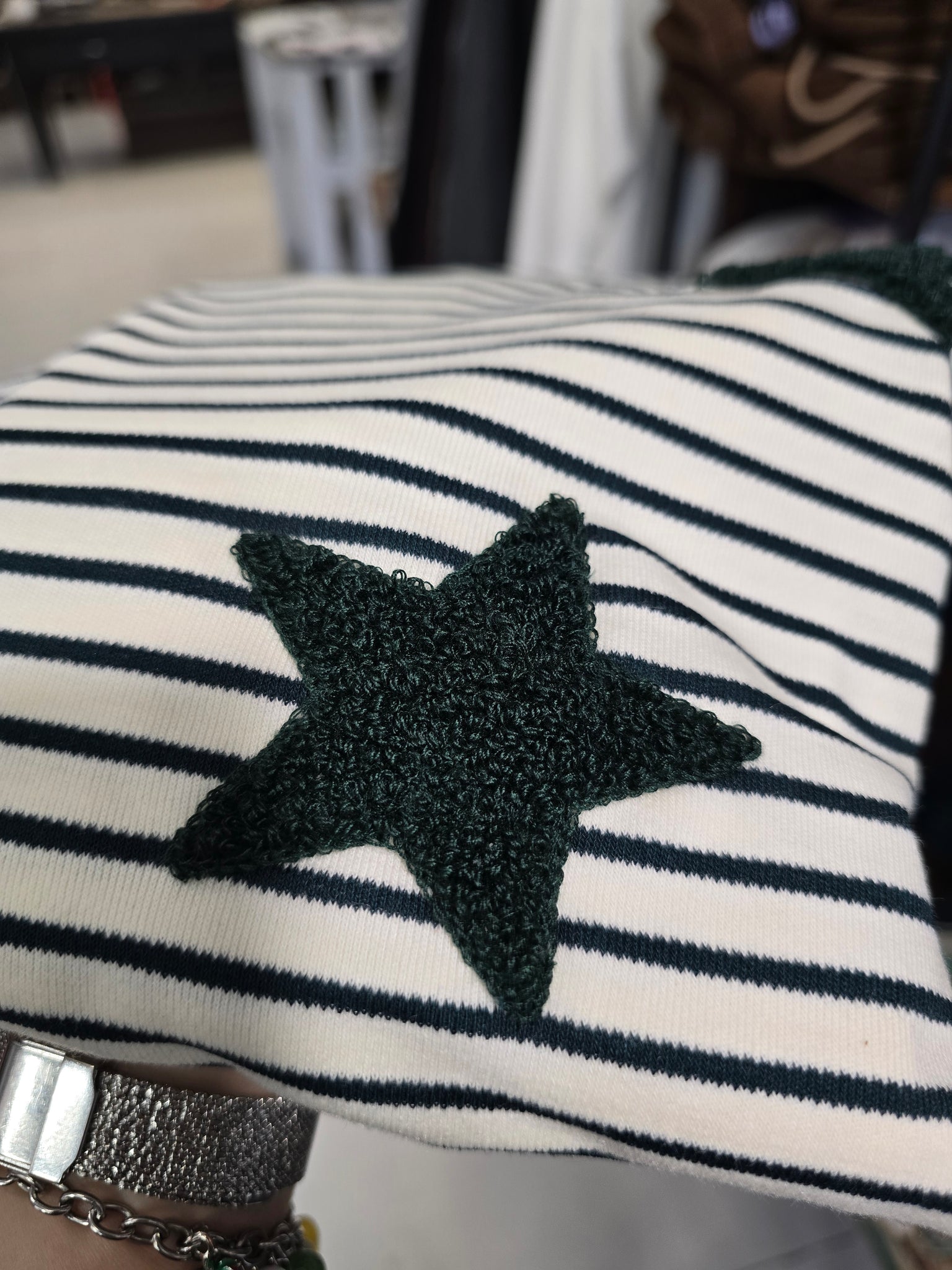 Marinaro stellato che fa sognare! Questa felpa rigata con scollo barca e stelle ricamate è perfetta per look casual poetici e caratterizzati.