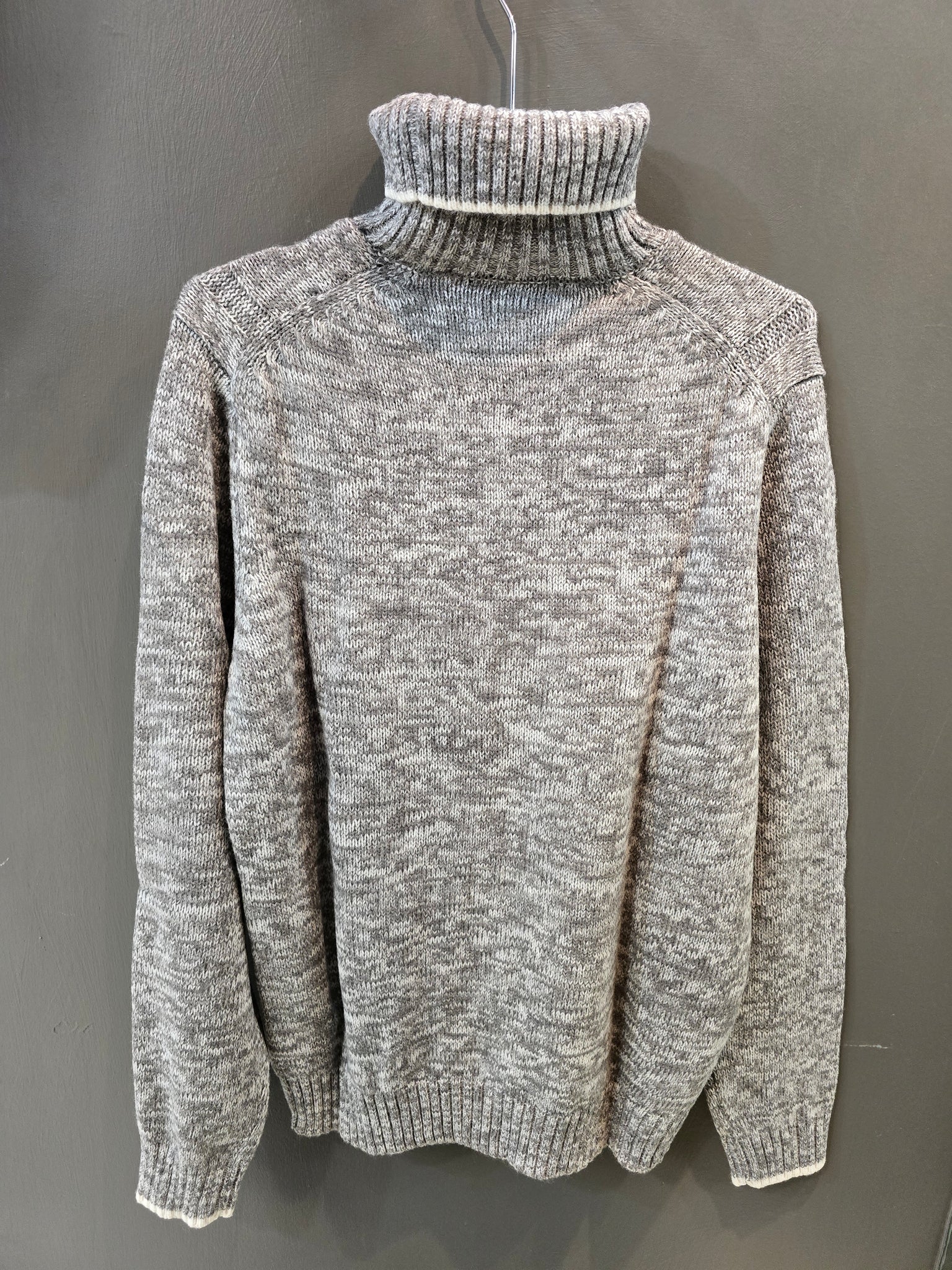 Calore elegante con lavorazione artigianale! Questa maglia collo alto con treccia larga melange e 30% lana è l'essenziale luxury per l'inverno.