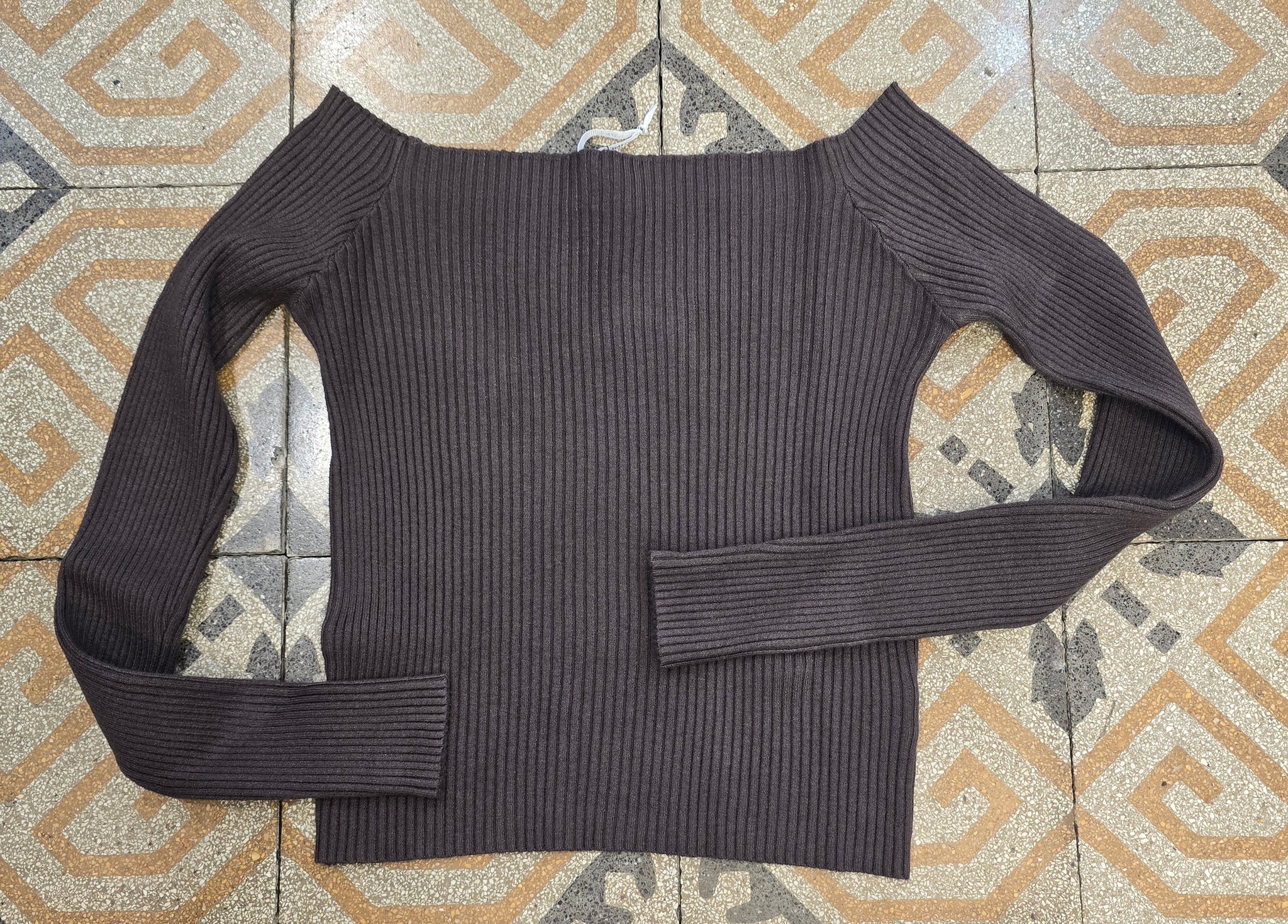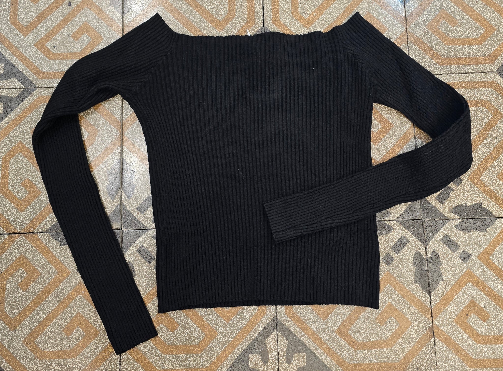 Femminilità trendy che esalta le spalle! Questa maglia a costine corta con scollo barca è perfetta per look moderni e slancianti.
