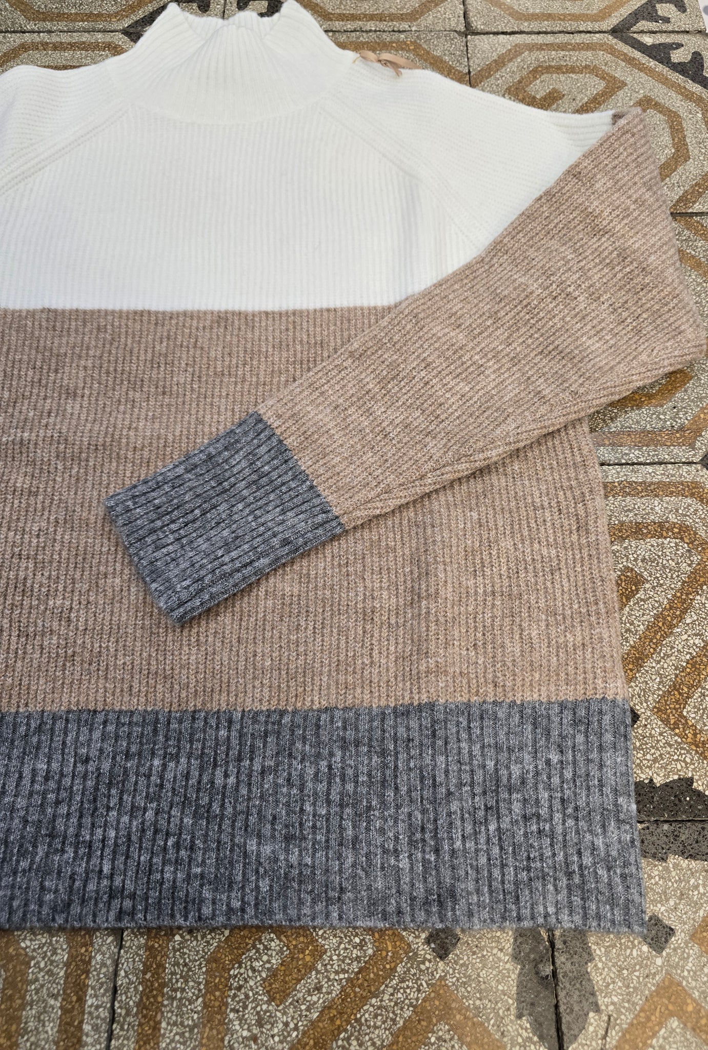 Protezione grafic che scalda! Questa maglia dolcevita righe grandi panna grigio cammello è perfetta per look casual caldi e grafici.