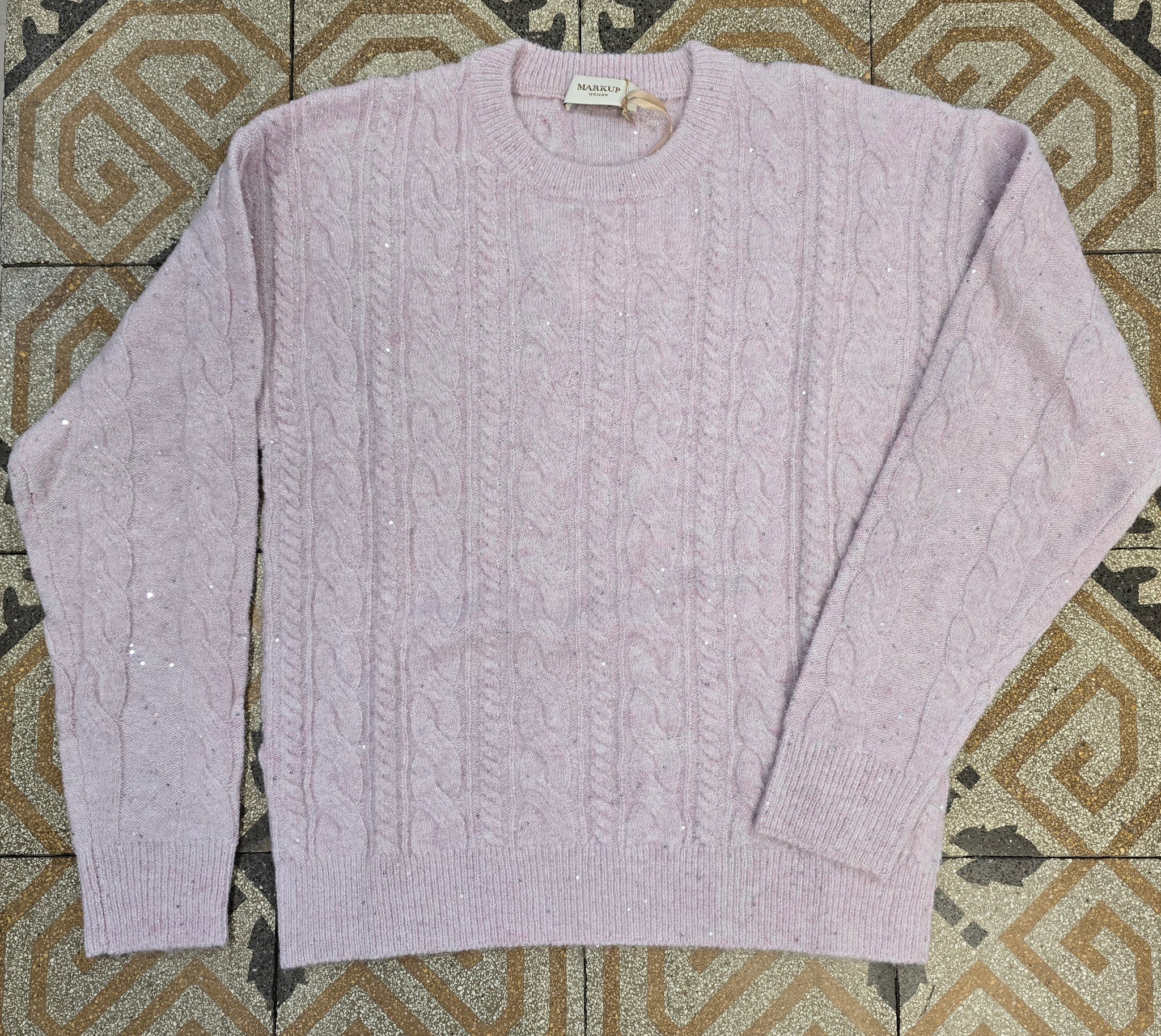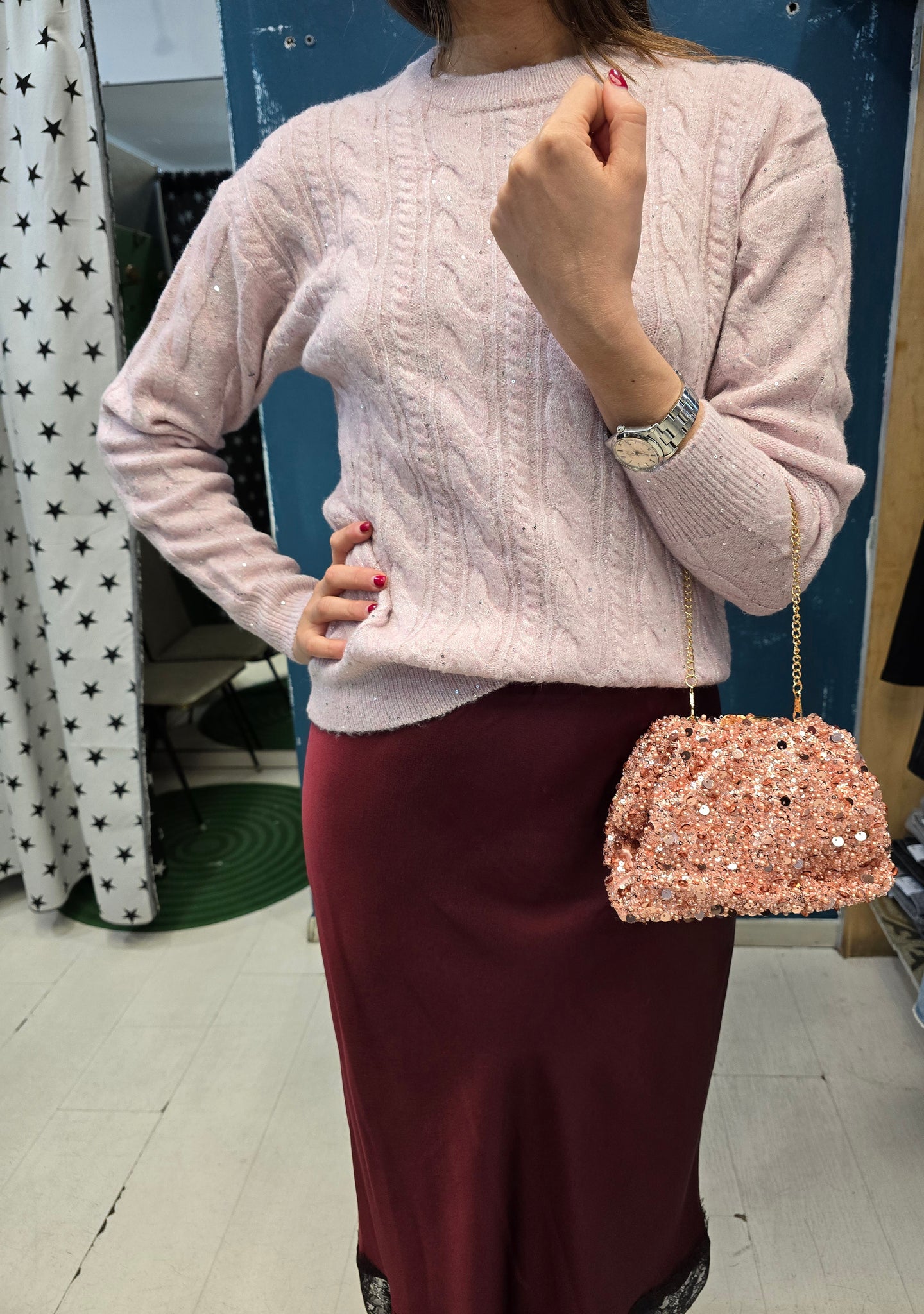 Artigianalità brillante che conquista! Questa maglia filo paillettes rosa chiaro con trecce è perfetta per look casual luminosi e texturizzati.