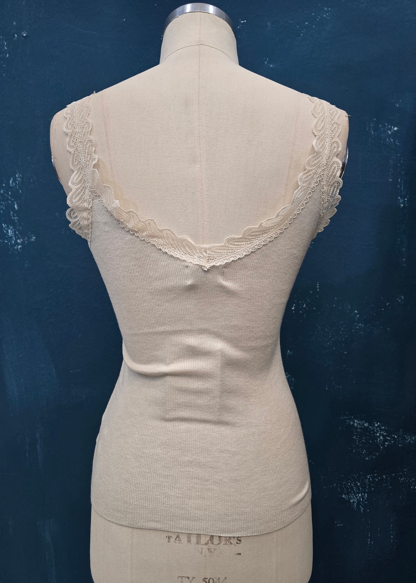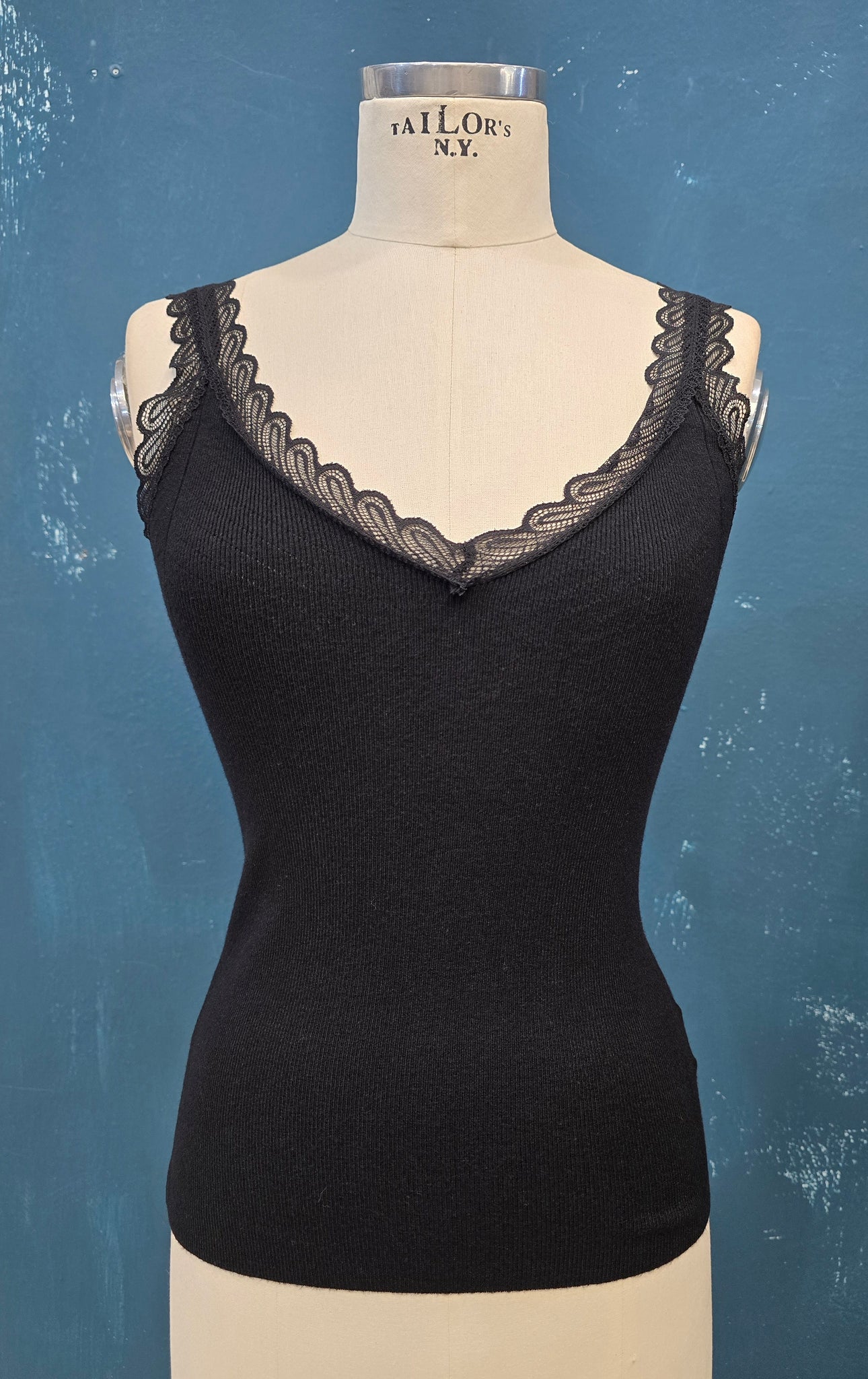 Essential femminile che non manca mai! Questa canotta 50% viscosa con costine e pizzo è l'indispensabile delicato per look casual romantici e stratificati.