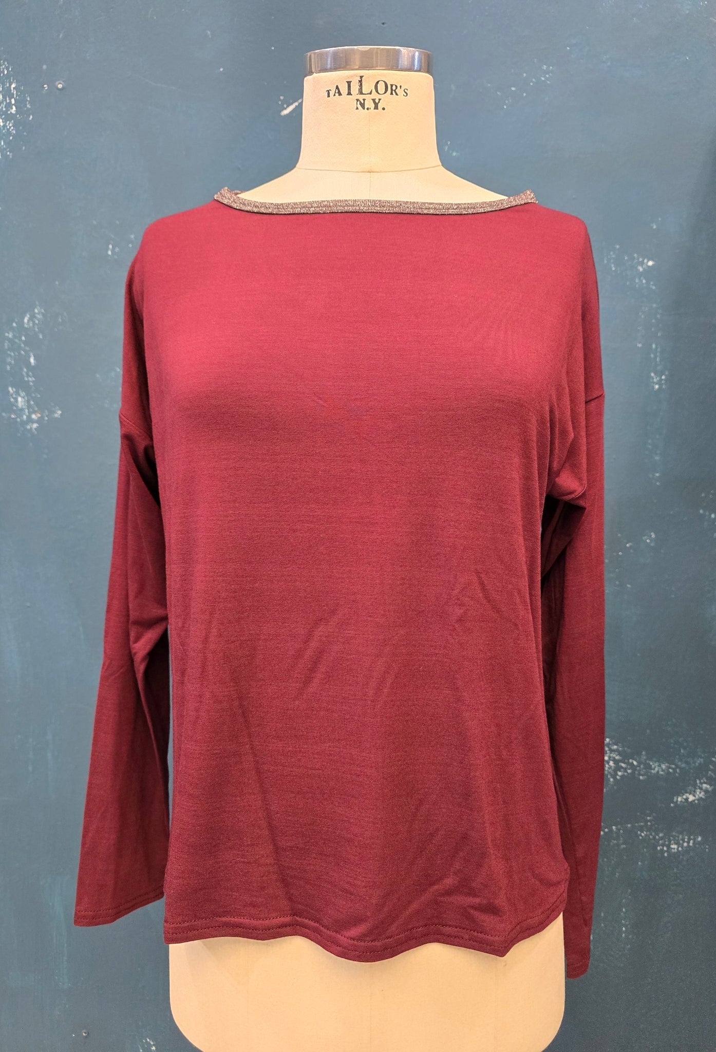 Essential luxury con dettaglio prezioso! Questa t-shirt viscosa manica lunga con bordatura lurex è l'indispensabile elegante per look formali raffinati.