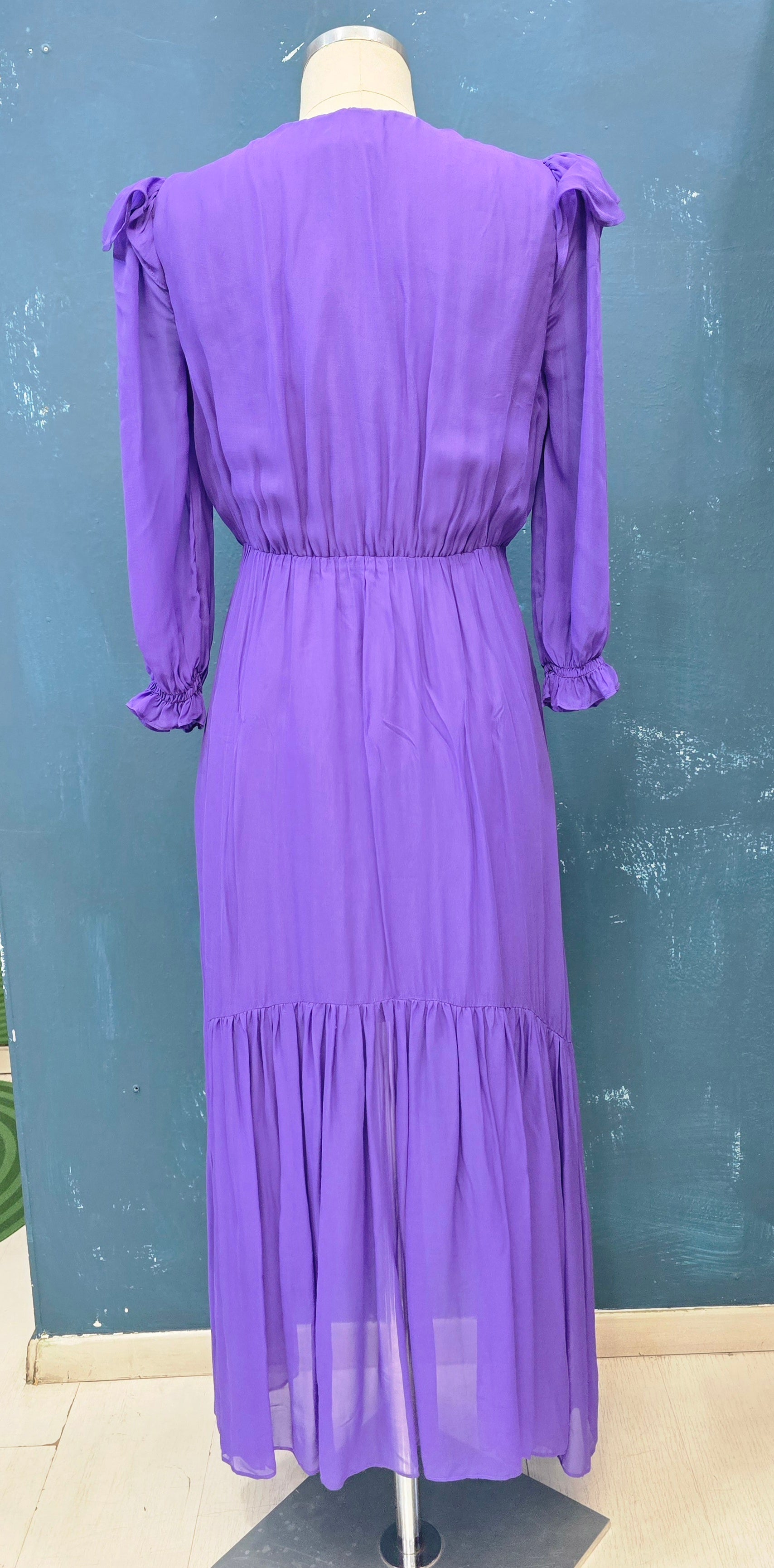 Abito in tessuto crepe viola con balza decorativa, taglia 42.