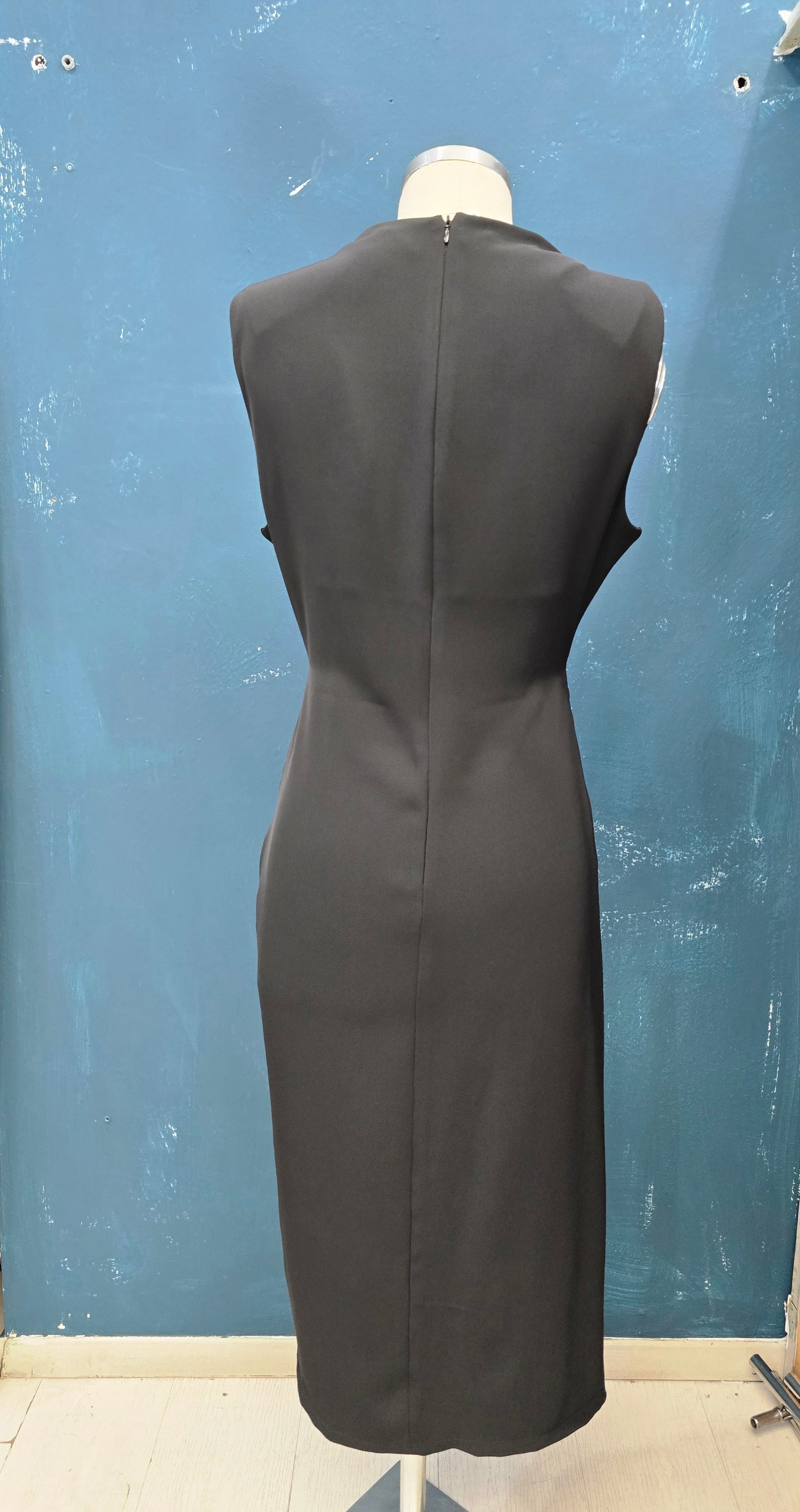 Abito smanicato in tessuto crepe nero con drappeggio davanti e spacco laterale.