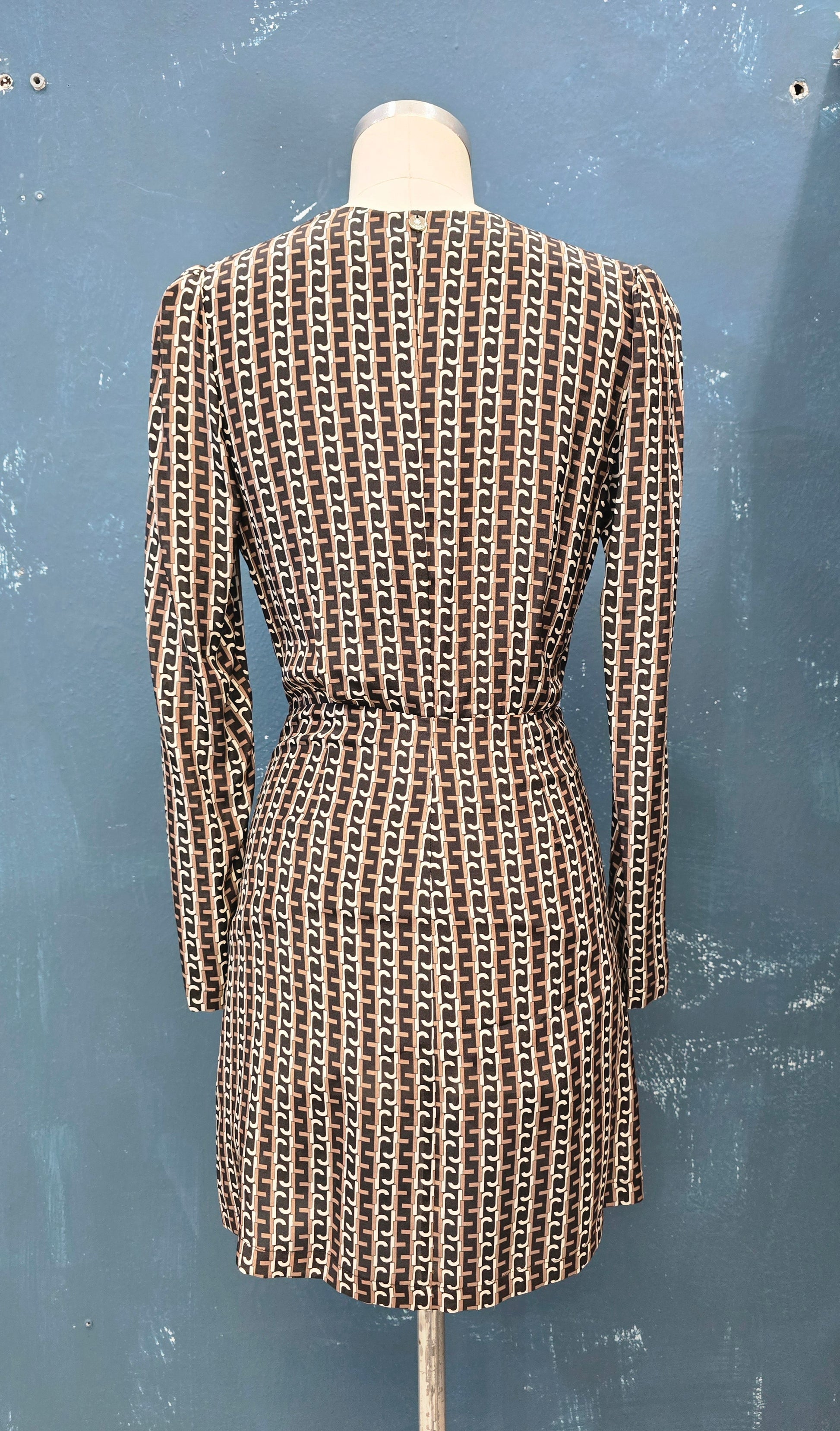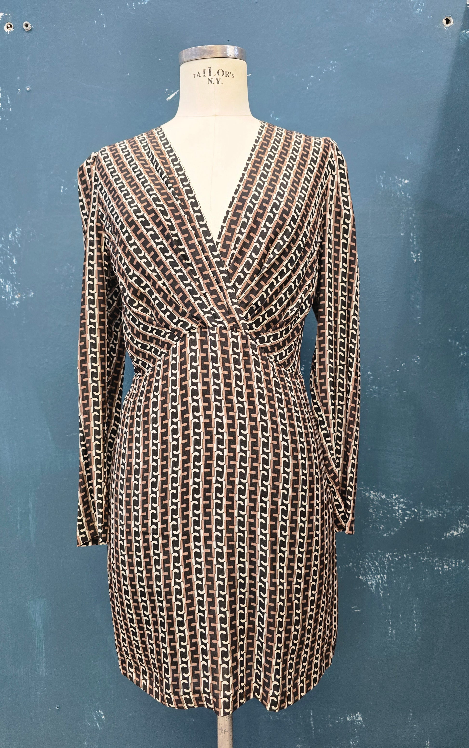 Abito in pura seta a fantasia con scollo a V tagliato sotto il seno, toni nero marrone e bianco, taglia 42.
