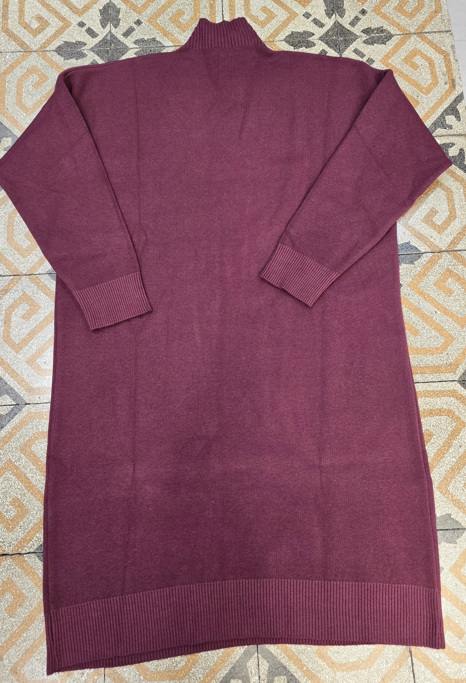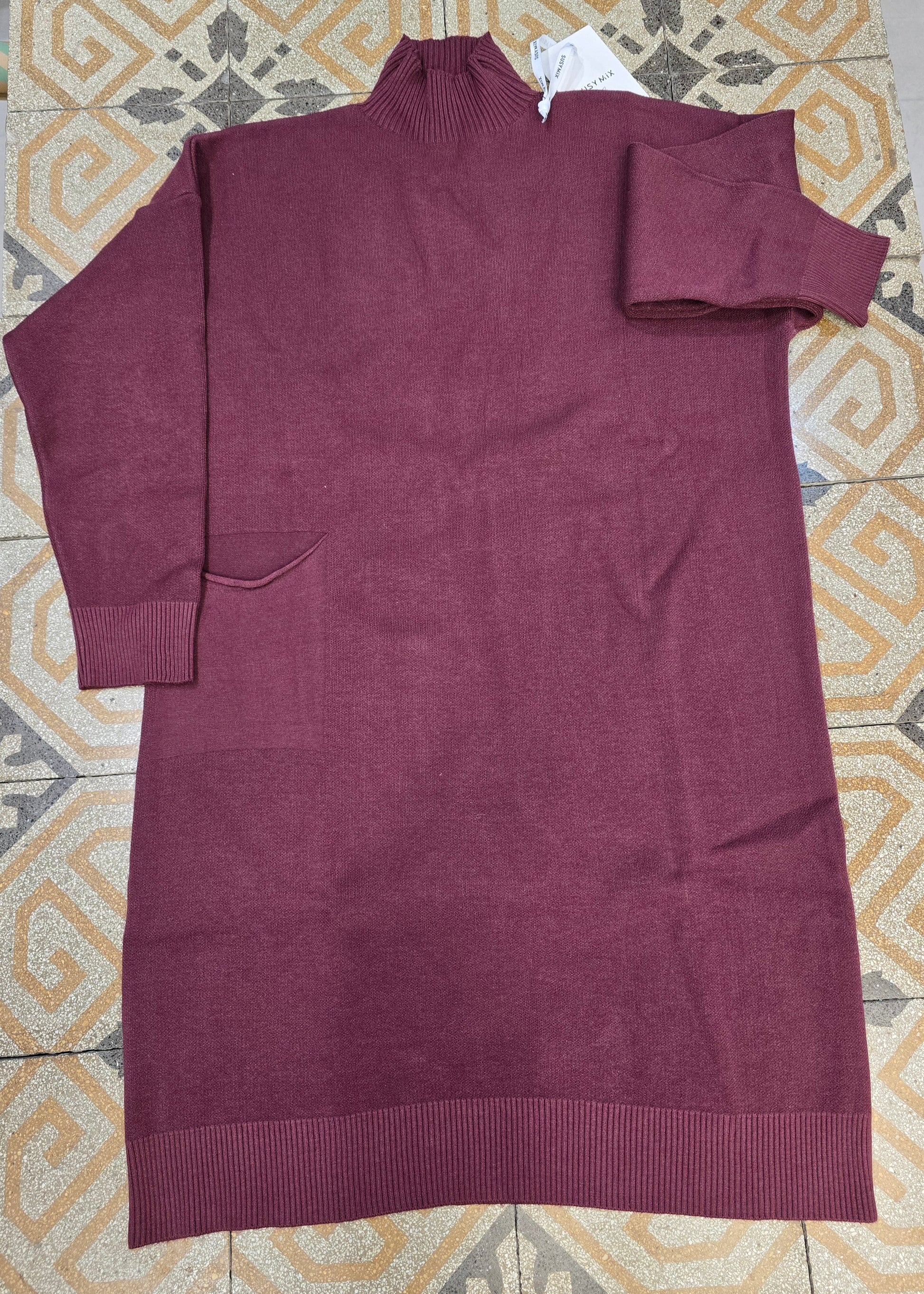 Abito maglia in viscosa calda modello in taglia unica ad ovetto con collo dolcevita dettaglio tasca laterale lunghezza al ginocchio circa disponibile nei colori moda in bordeaux e nel marrone