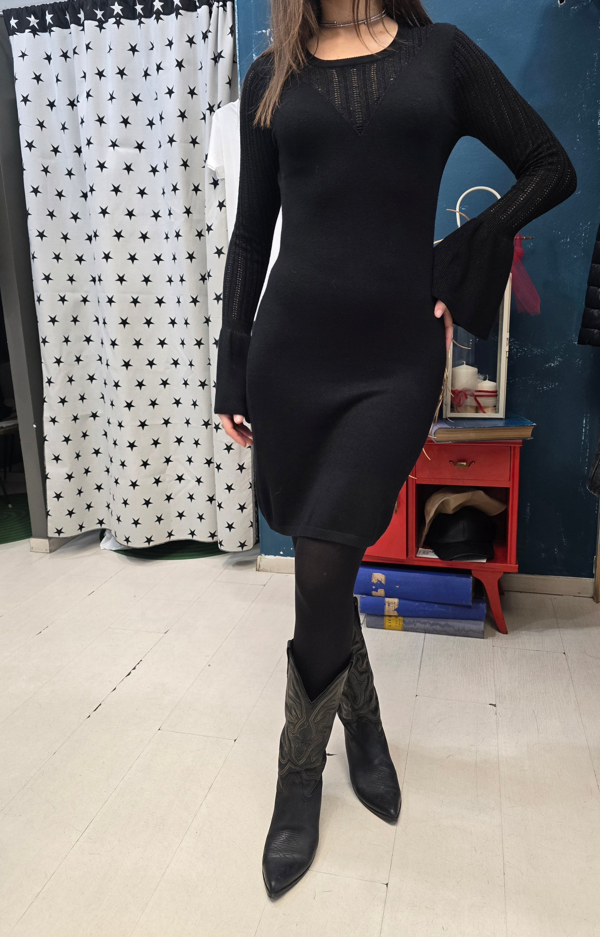 Abito tubino in maglia viscosa nero al ginocchio con manica traforata e gala.