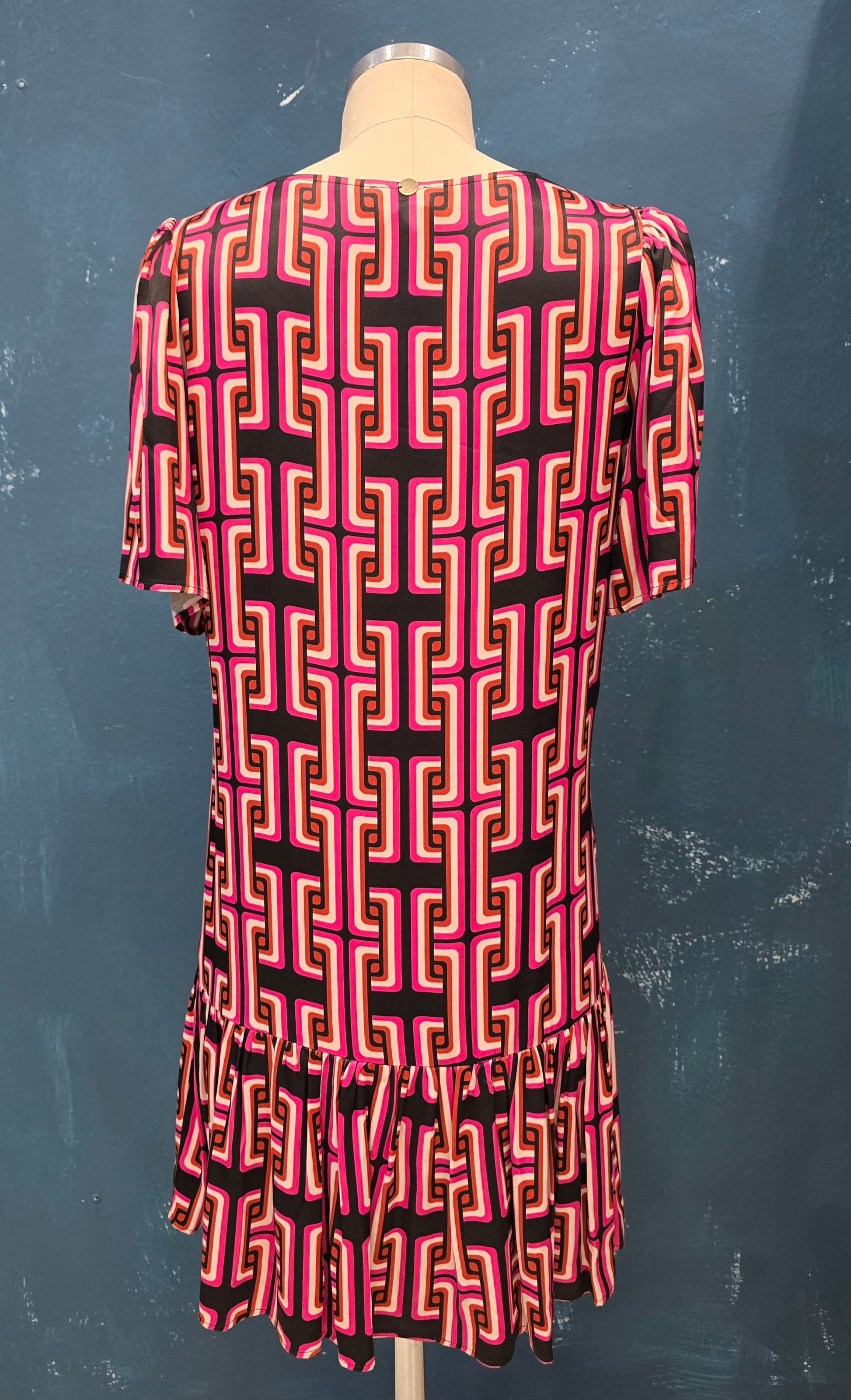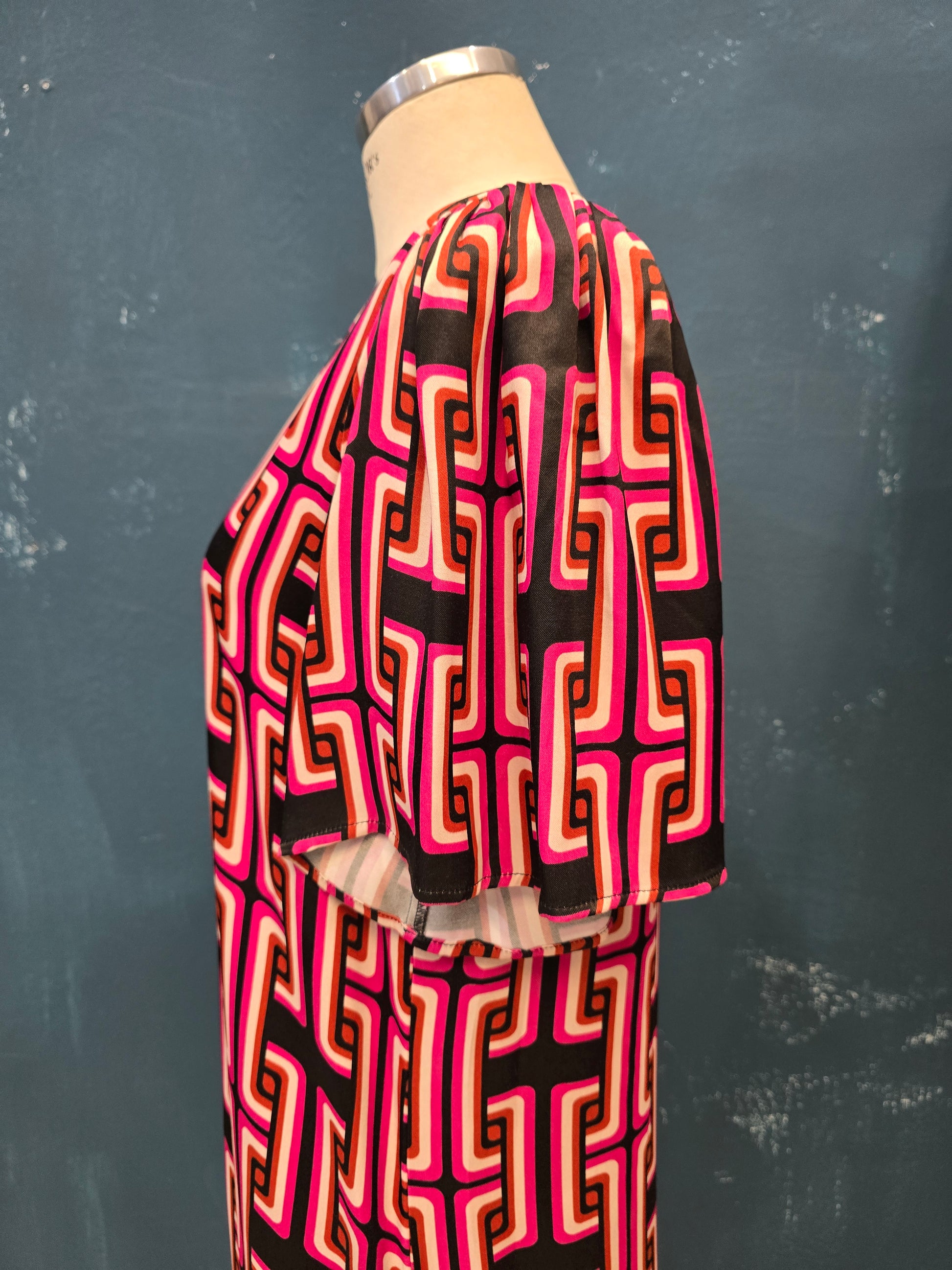Abito tunica in raso con fantasia optical, mezza manica e gala in fondo, taglia 42.