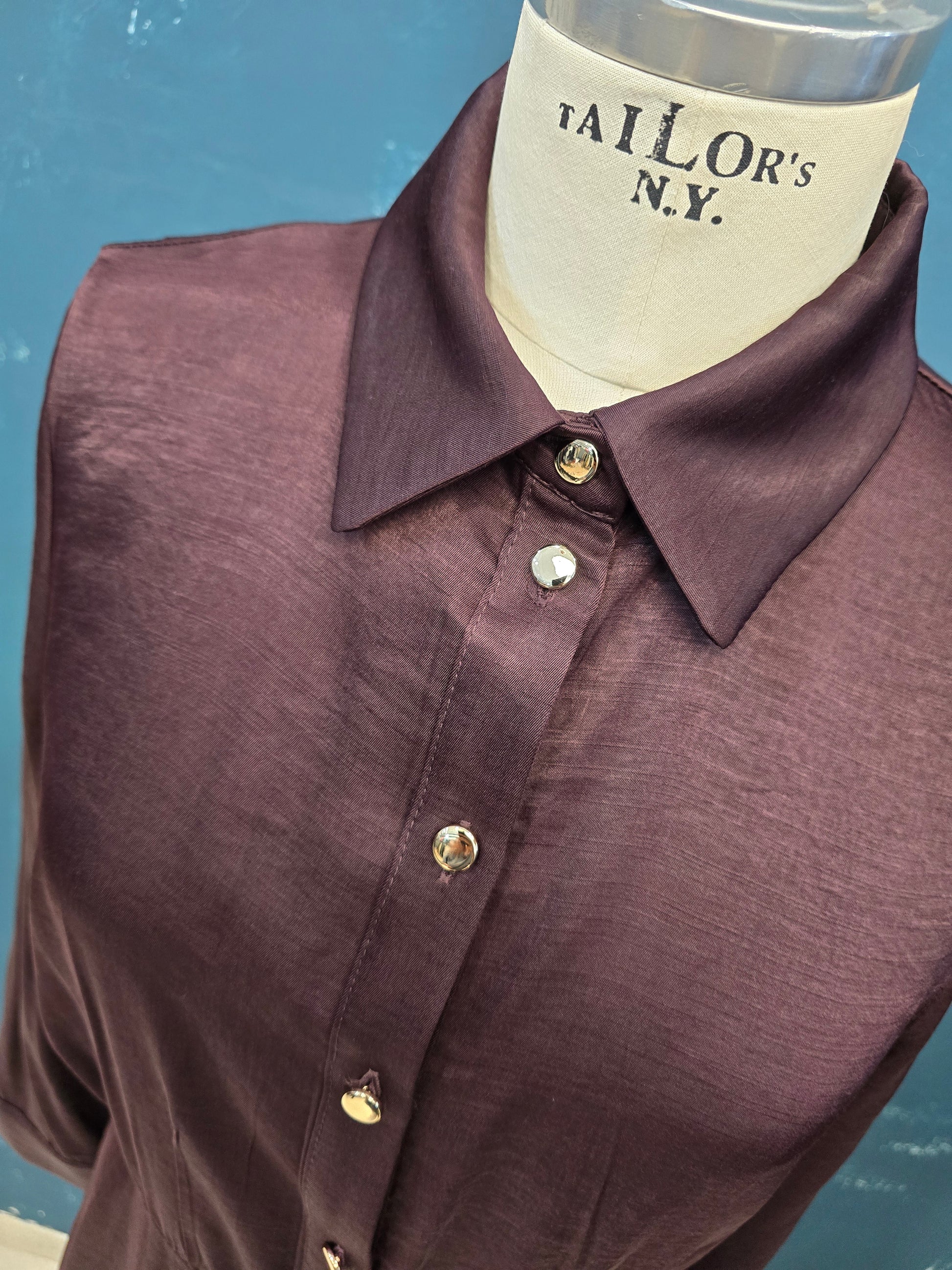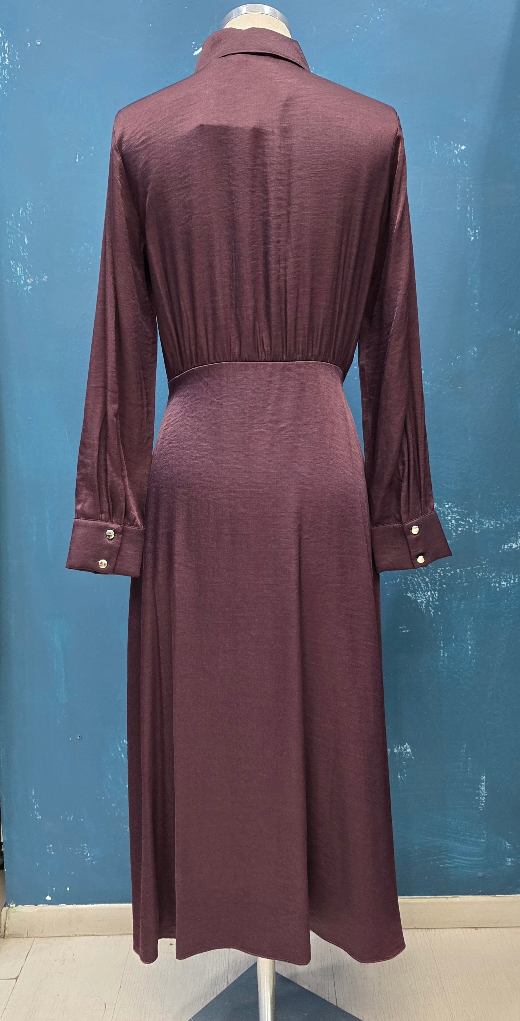 Abito lungo chemisier in raso melanzana con bottoni dorati eleganti.