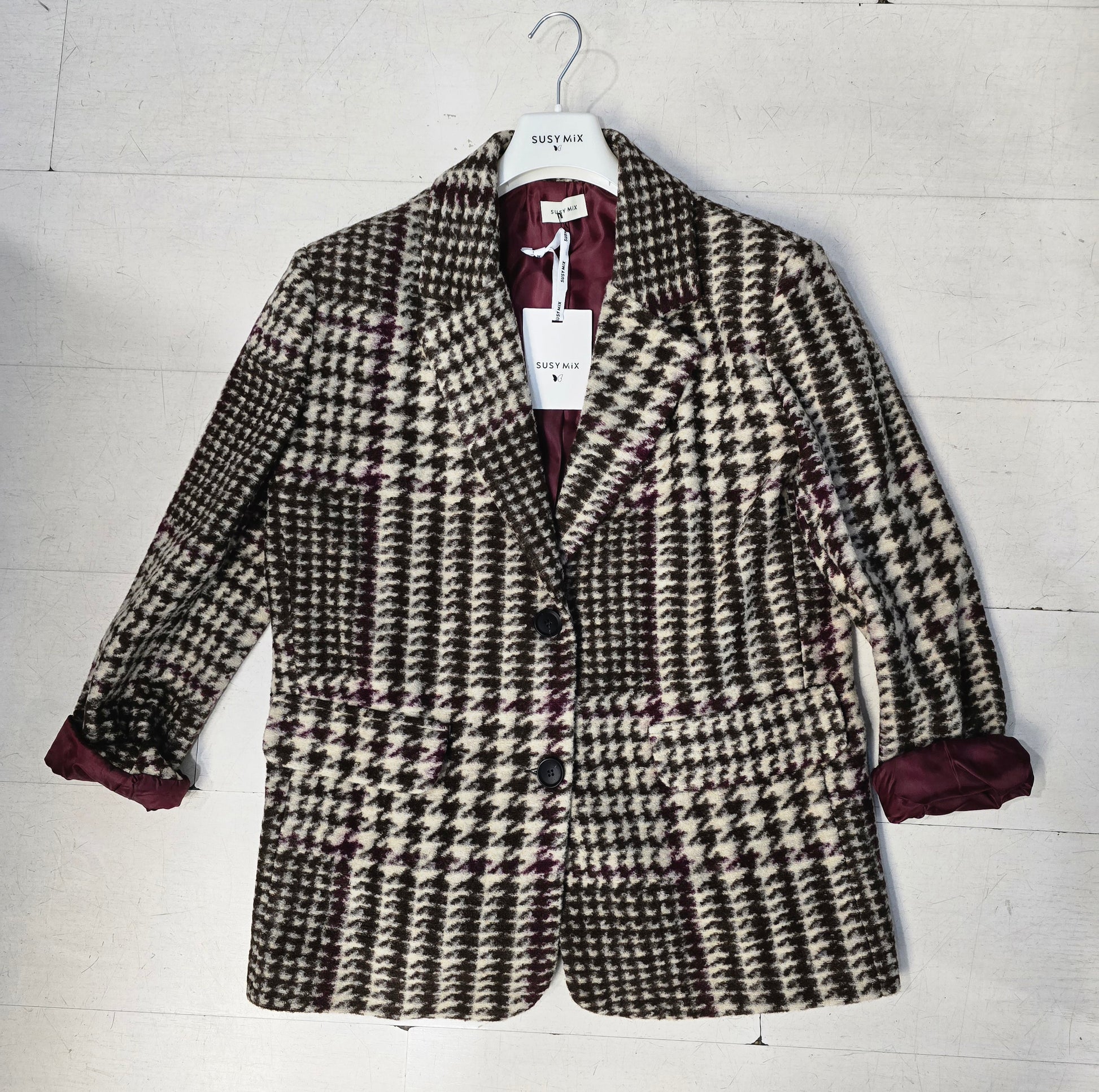 Blazer donna in pannetto pesante a fantasia piè de pull modello in taglia unica over ma non troppo toni del marrone fodera bordeaux a contrasto