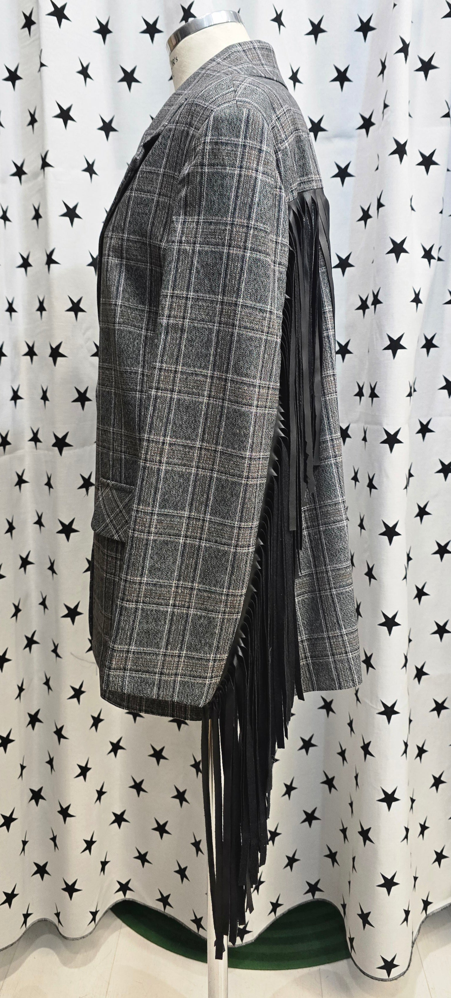 Blazer over check nero e grigio con frange in ecopelle applicate.