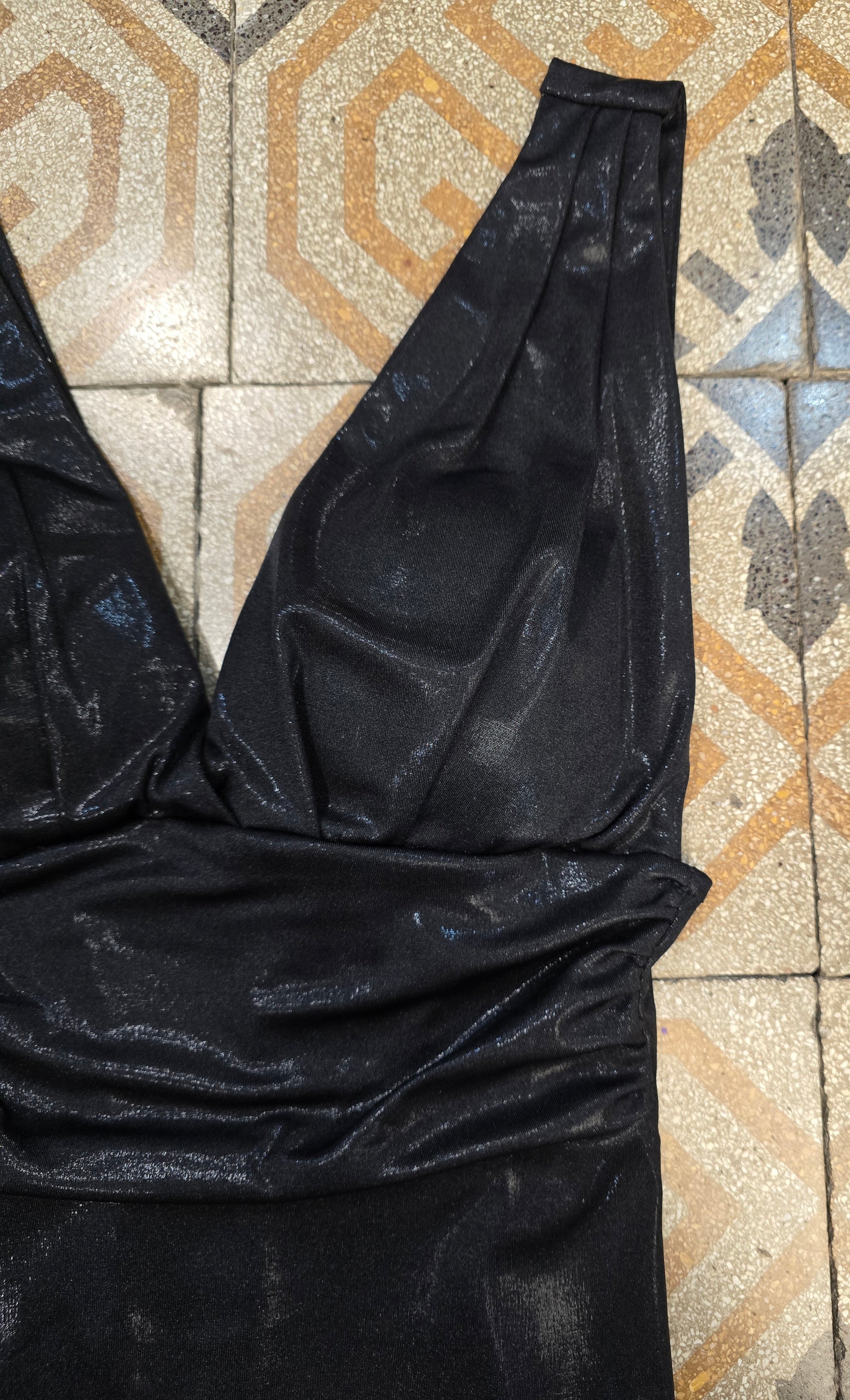 Body donna colore nero in tessuto lucido elasticizzato modello smanicato con coppe imbottite scollato a V davanti e dietro in taglia unica con vestibilità aderente