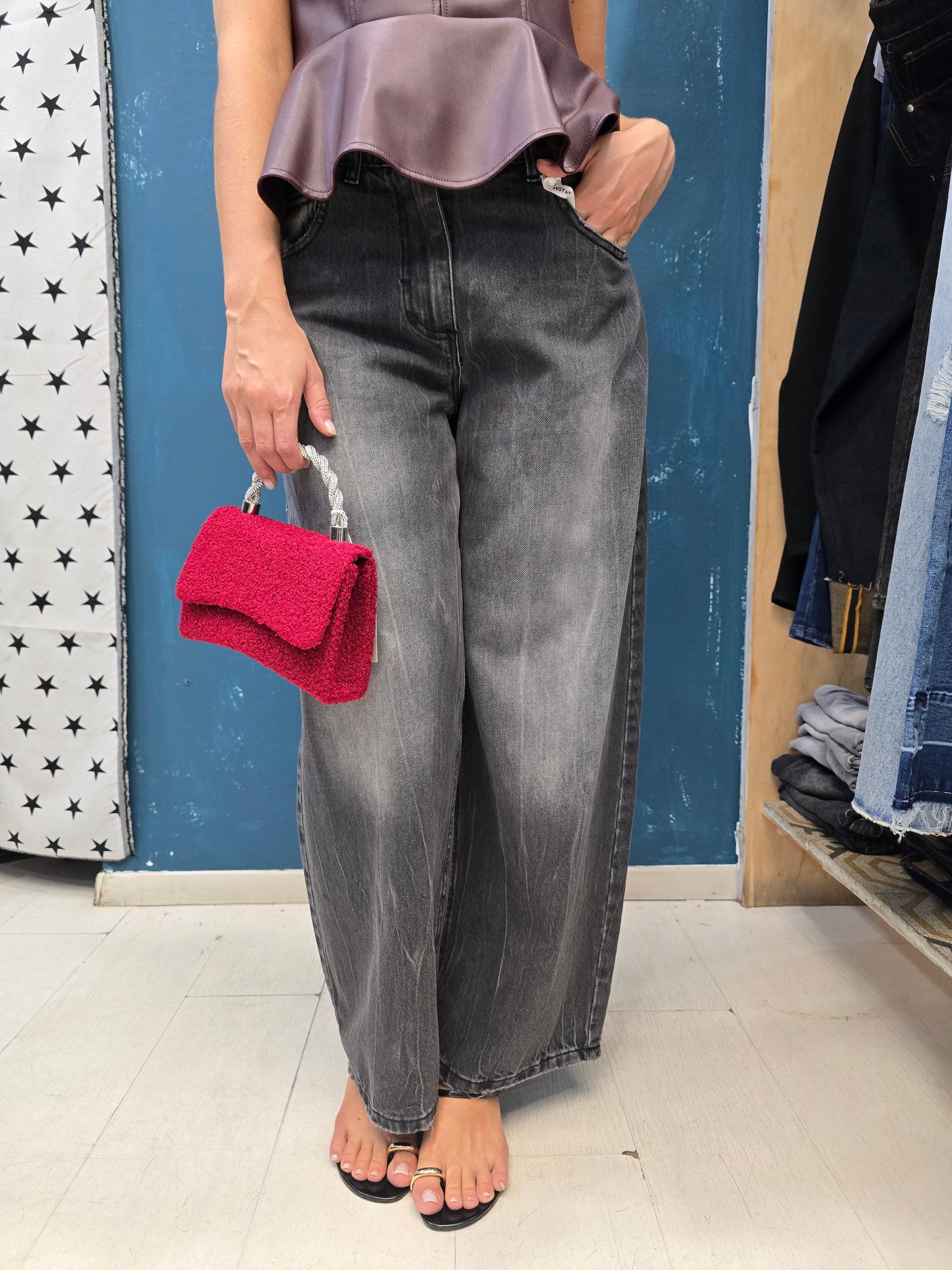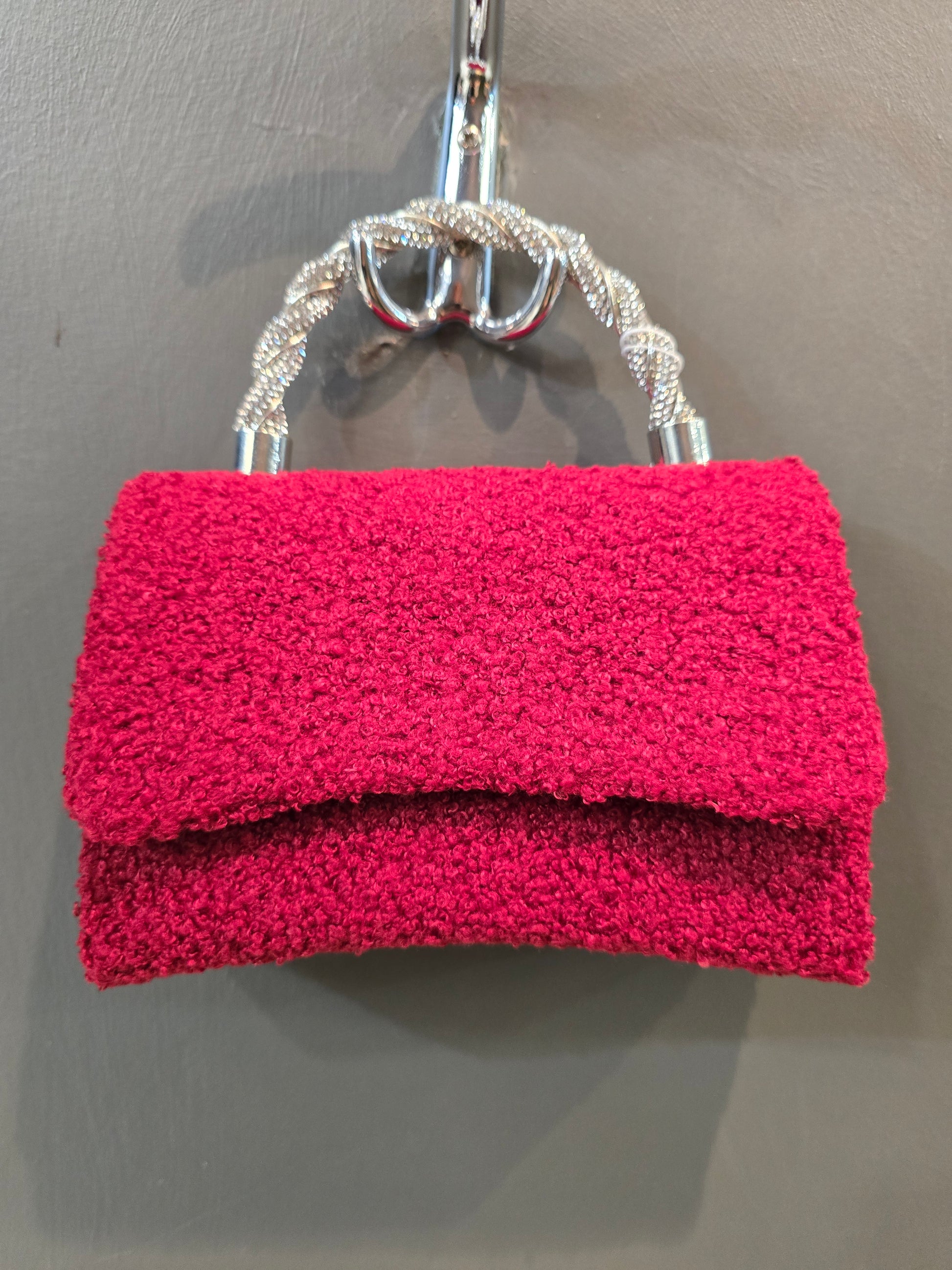 Borsa mini in tessuto bouclè bordeaux rigida con manico strass e tracolla catena argentata.