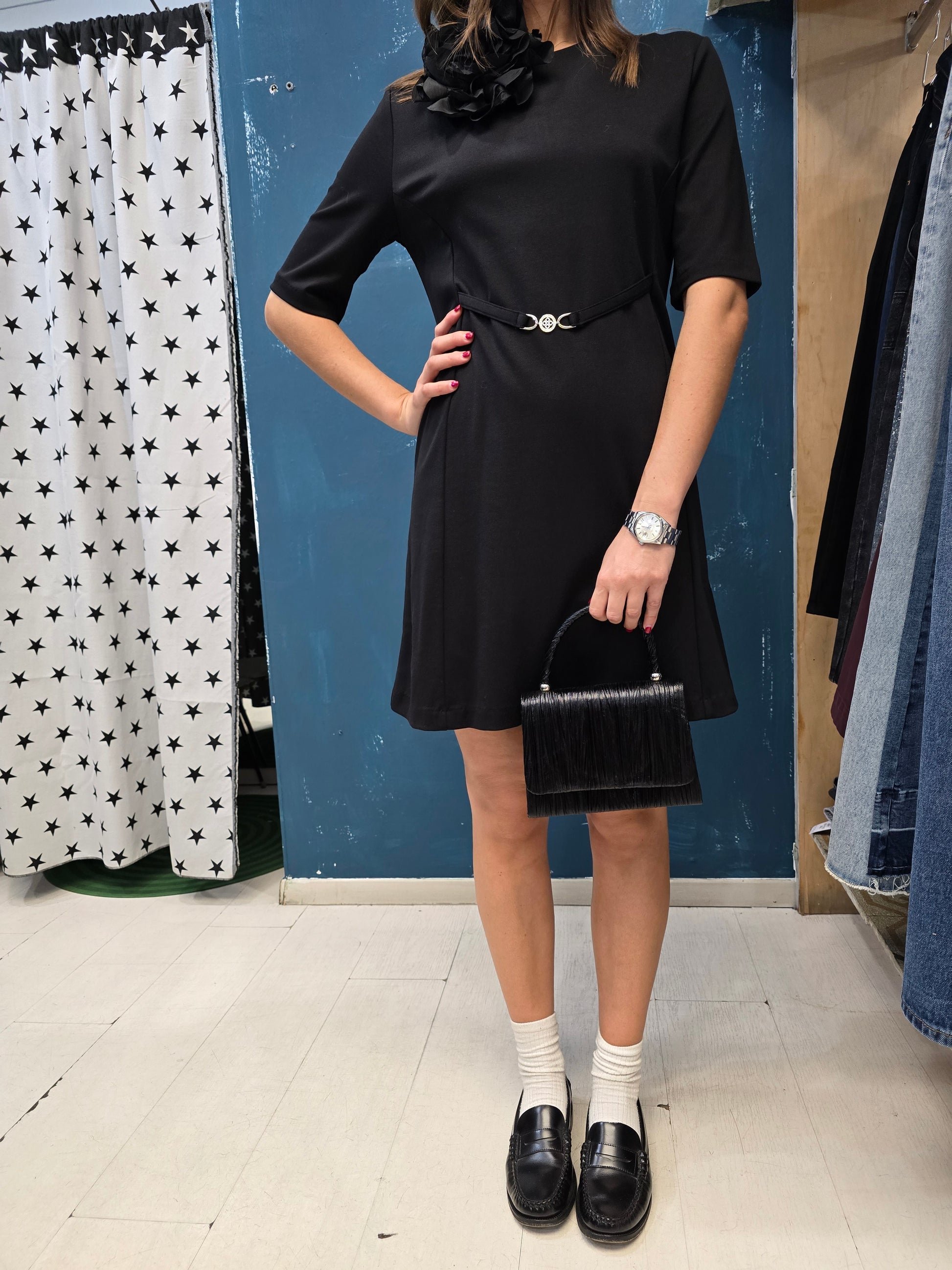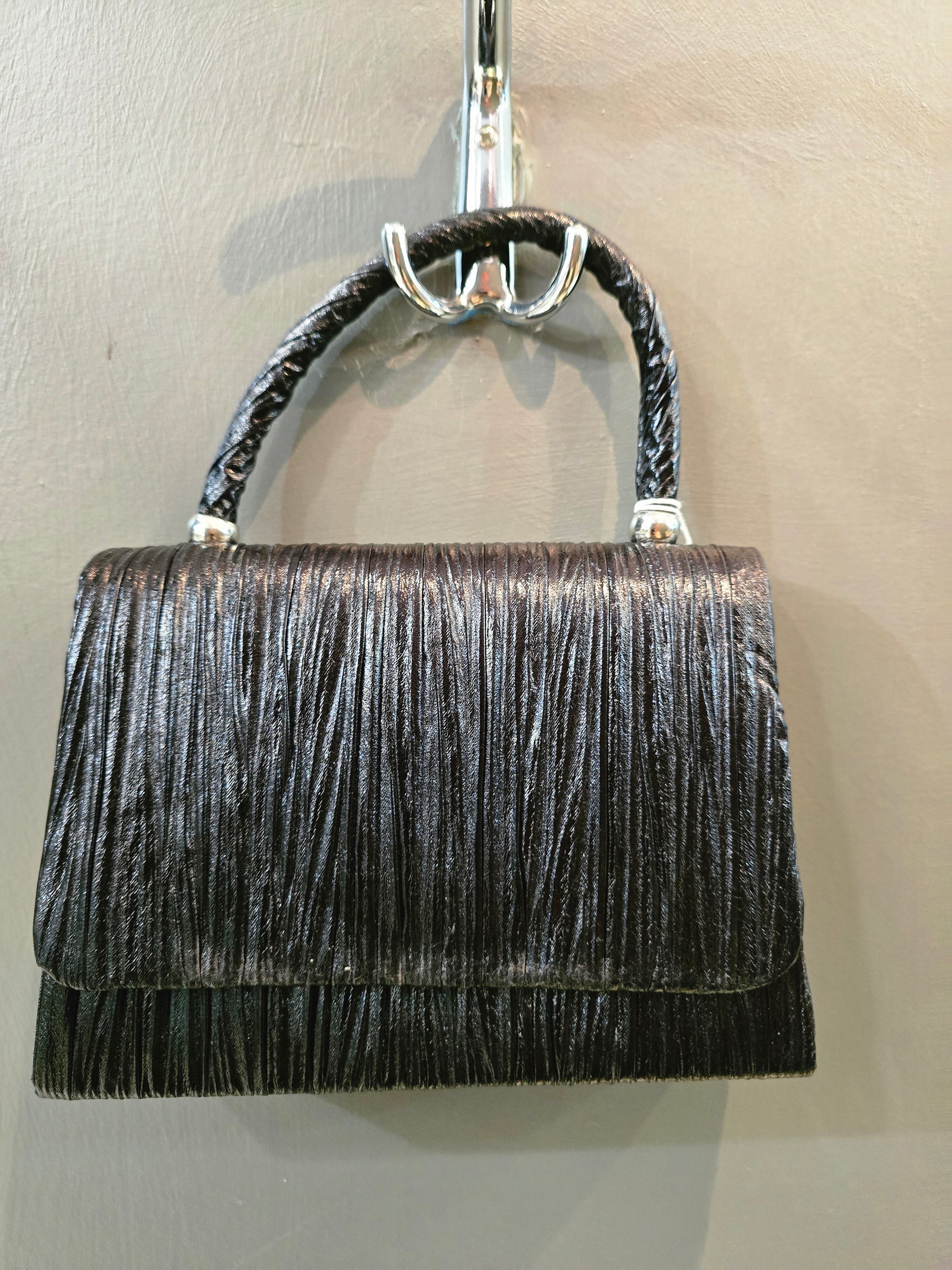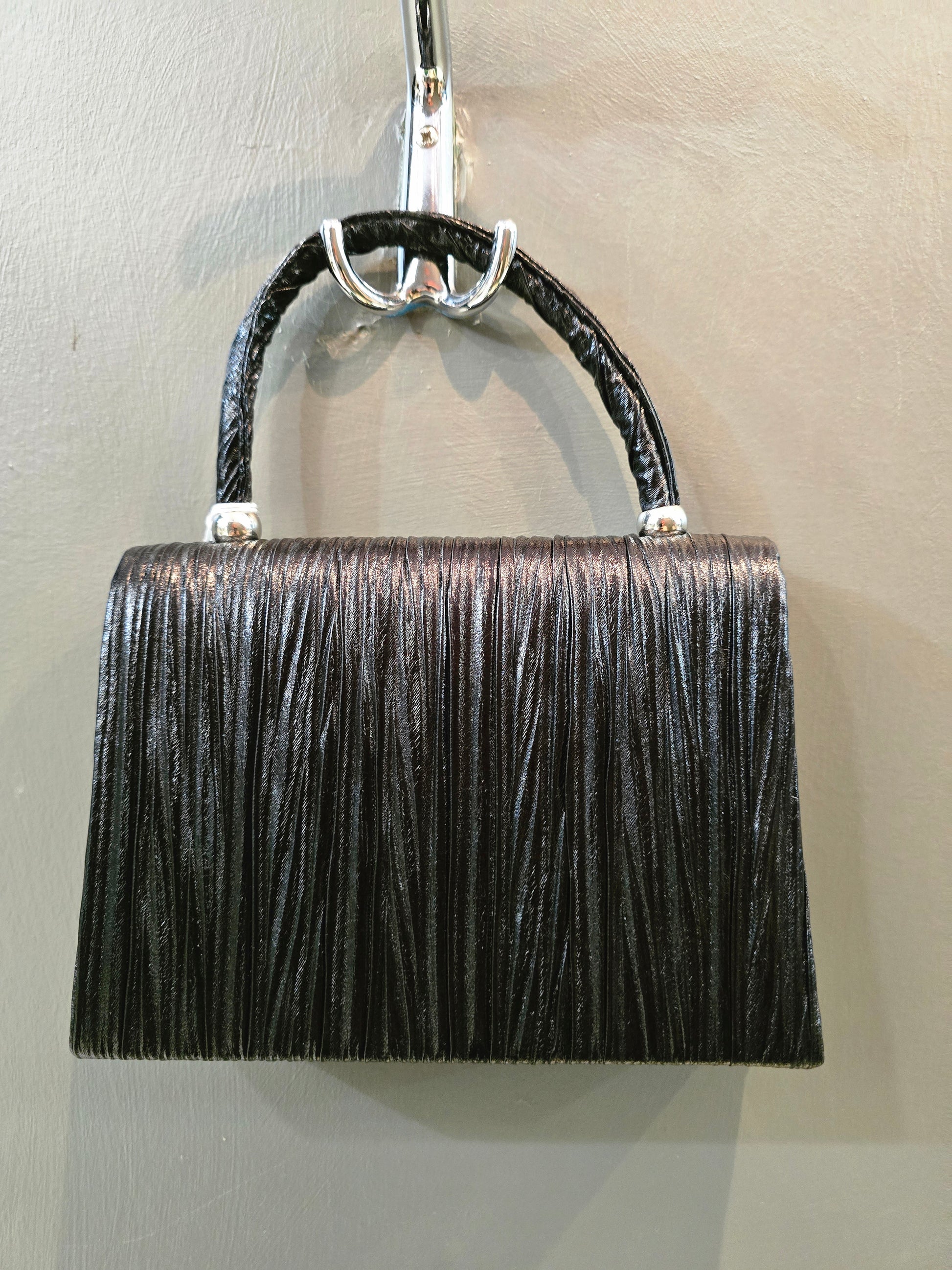 Borsa mini in ecopelle goffrata nera con manico rigido e tracolla catenina argento.