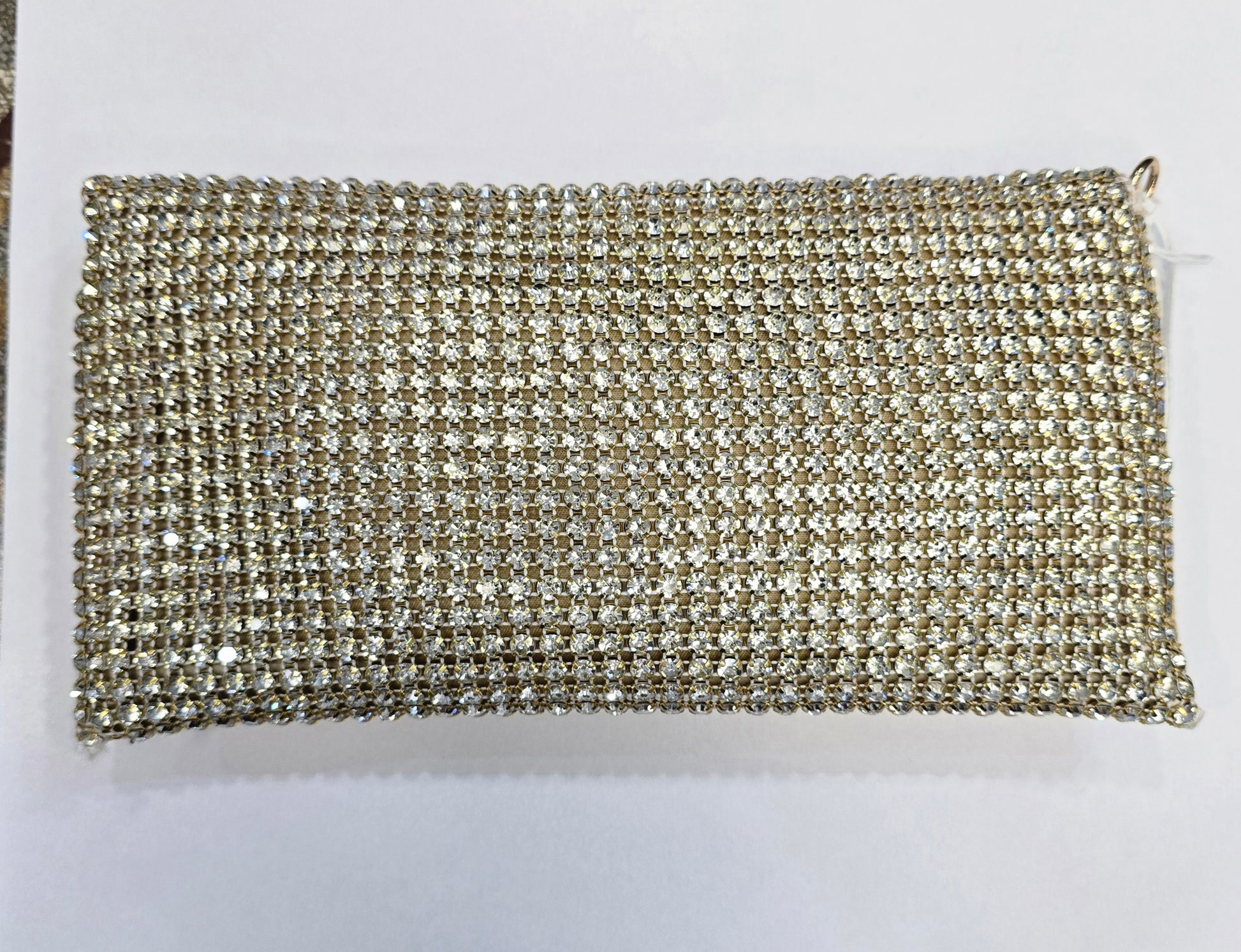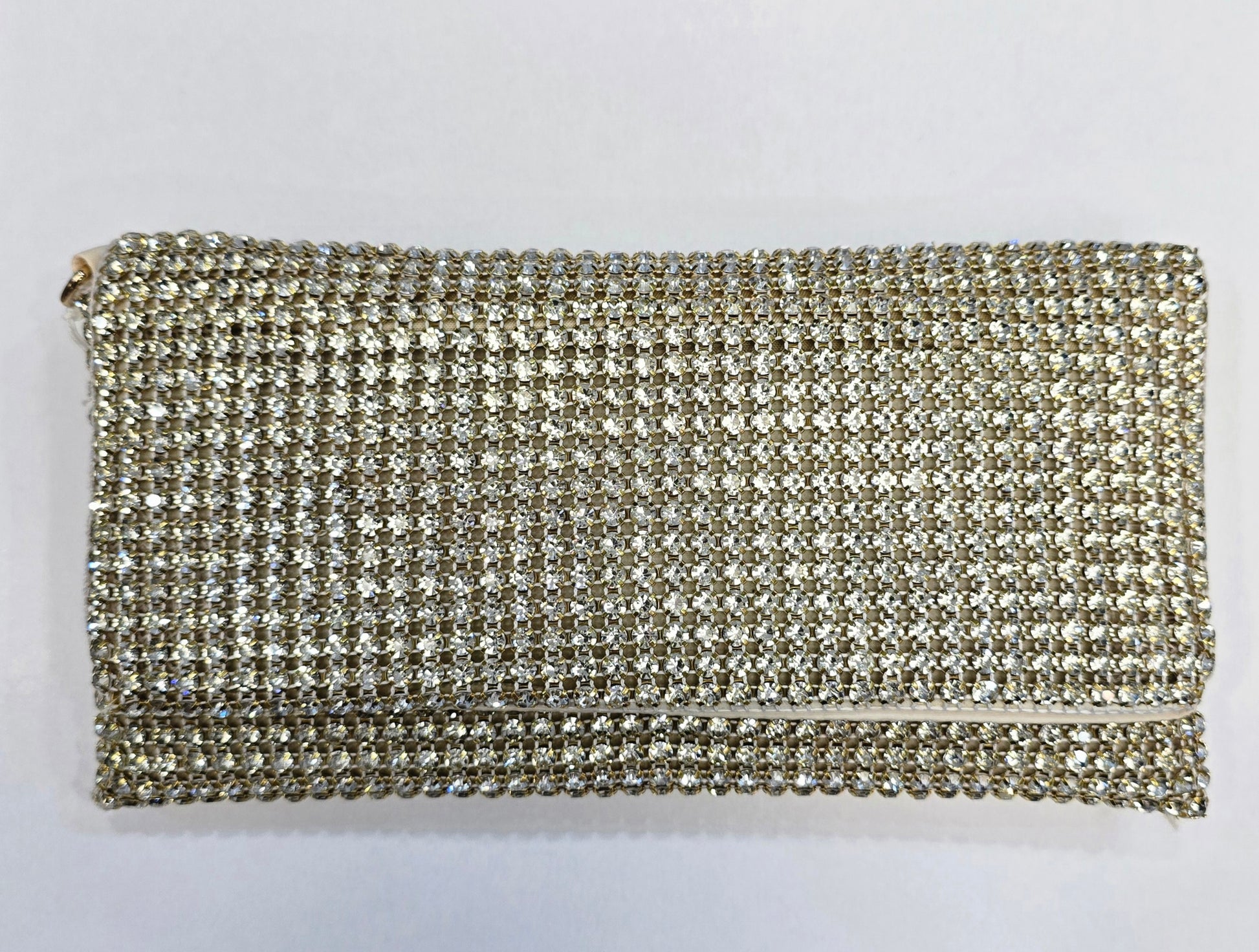 Borsa piccola in strass modello rettangolare a busta con tracolla catena dorata.