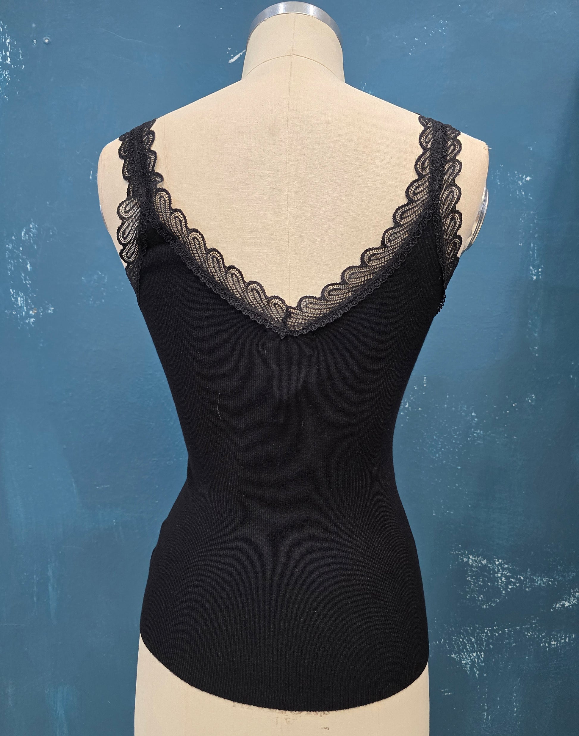 Canotta in 50% viscosa a costine con spallini e scollatura in pizzo, taglia unica.