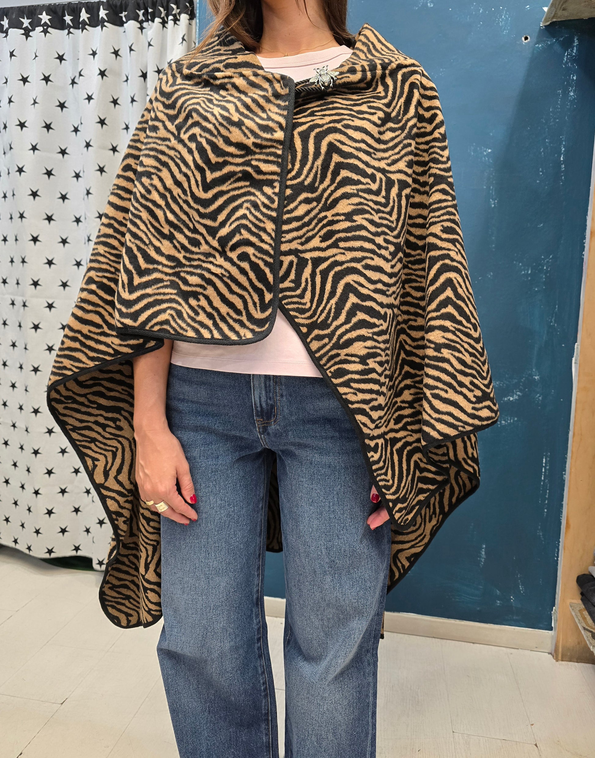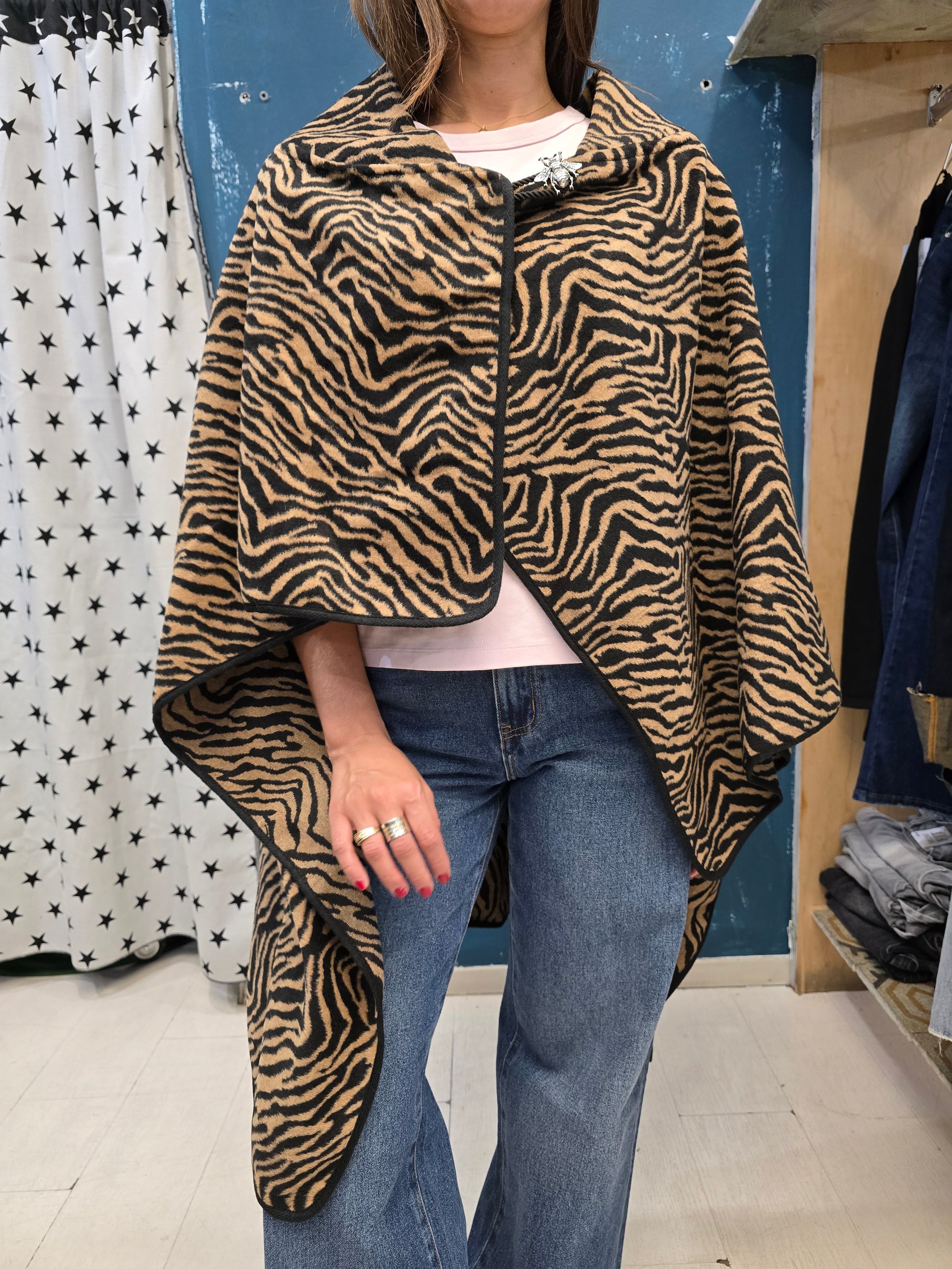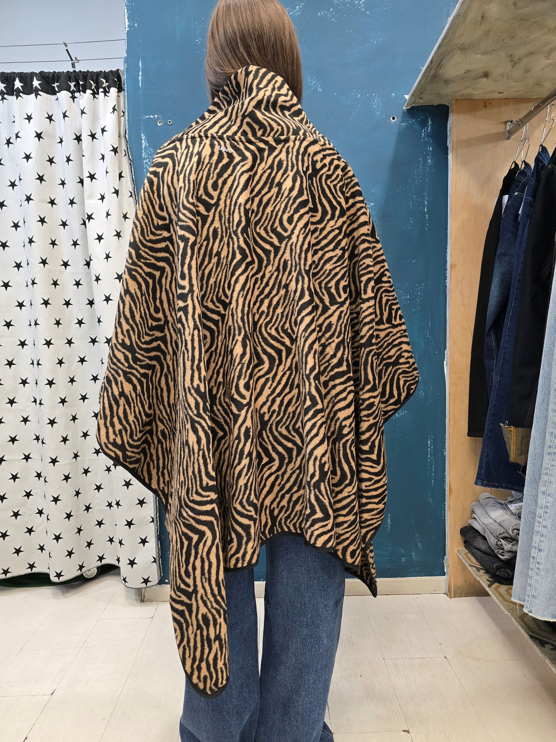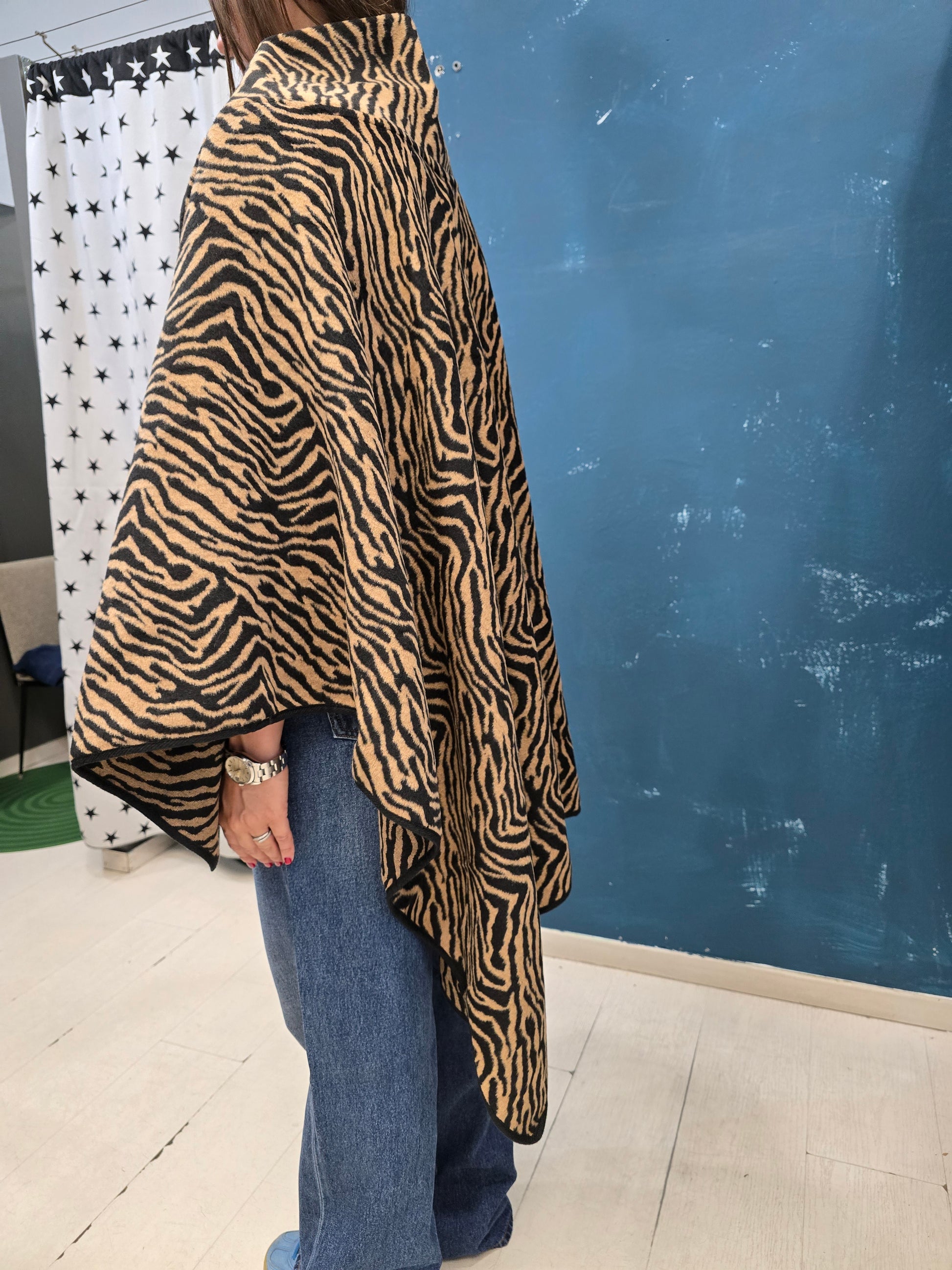 Cappa in pannetto zebrato corta davanti e lunga dietro con allaccio a bottone.