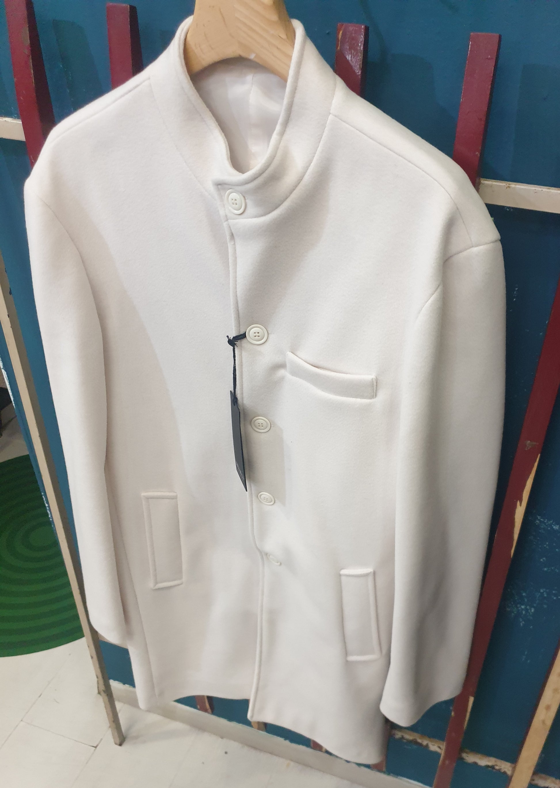 Cappotto in pannetto bianco modello con il collo alla coreana lunghezza al ginocchio circa
