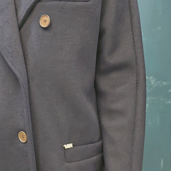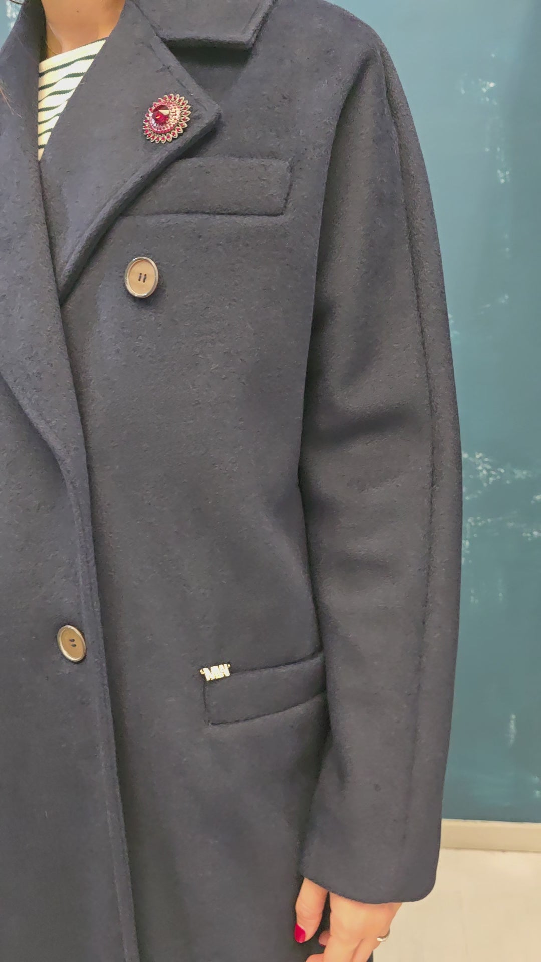 Cappotto doppiopetto lungo in panno blu over con spilla decorativa nel reverse.