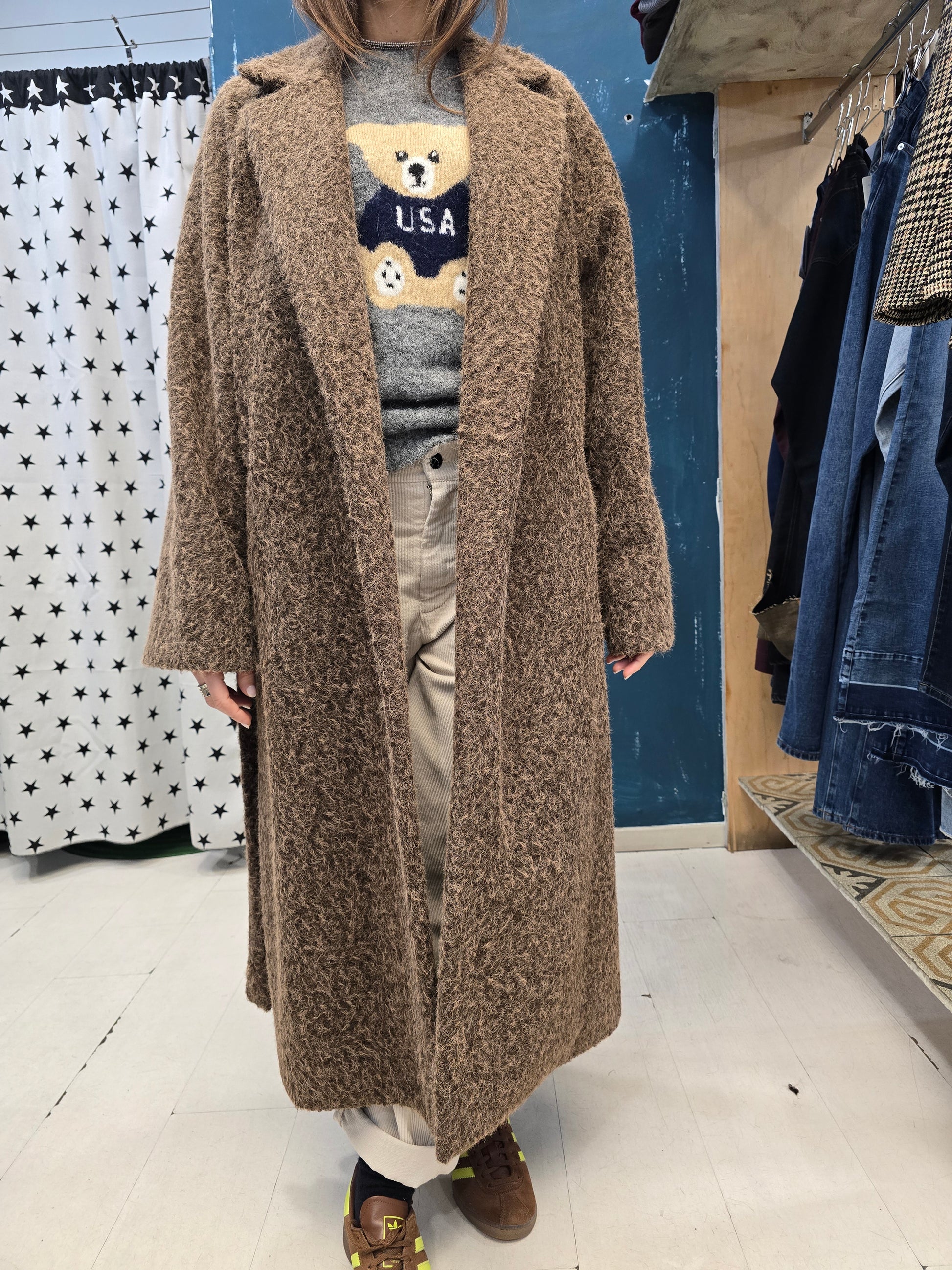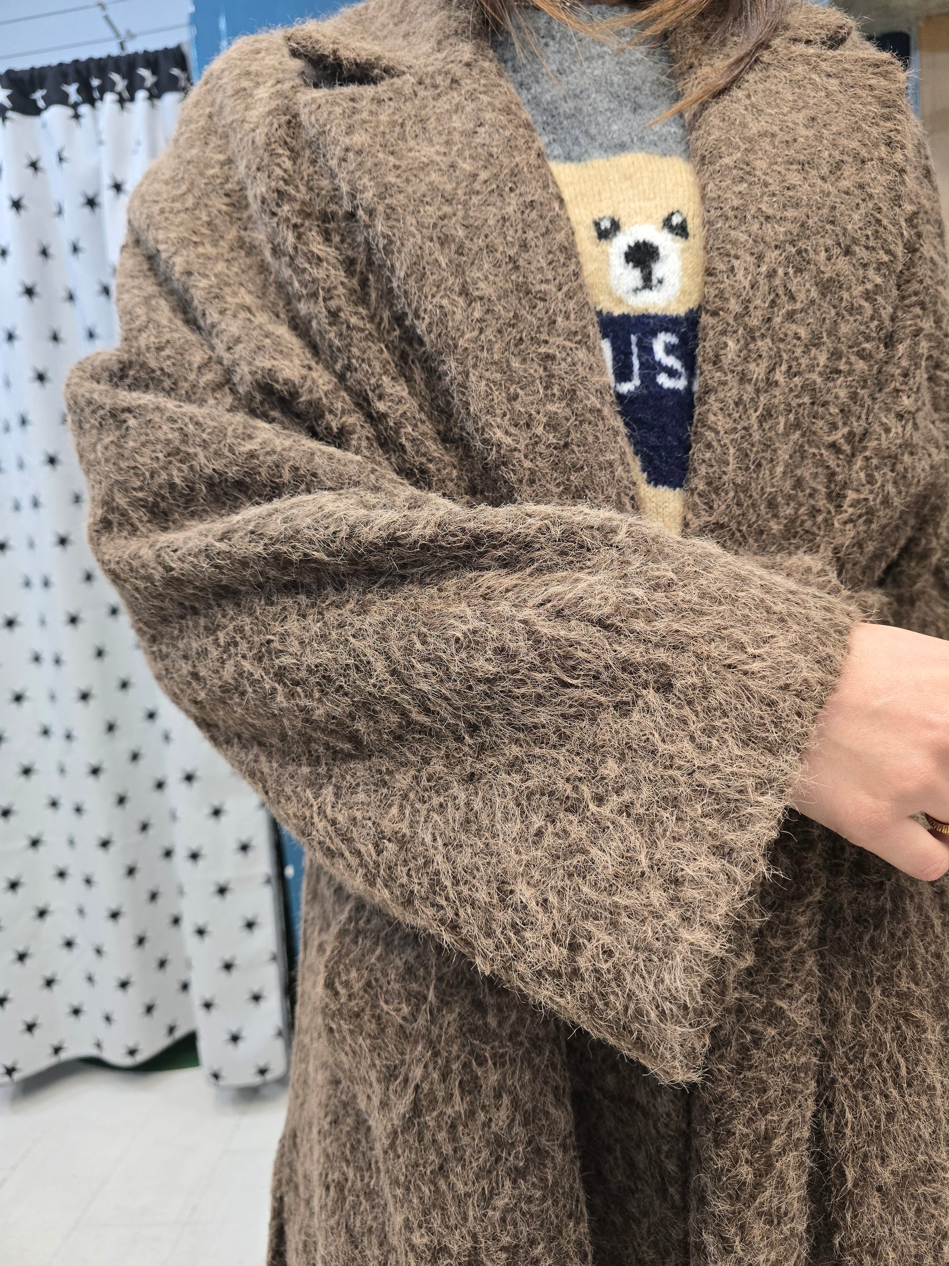 Cappotto lungo modello con spacchi laterali e allacciatura in vita manica larga a kimono in pannetto peloso