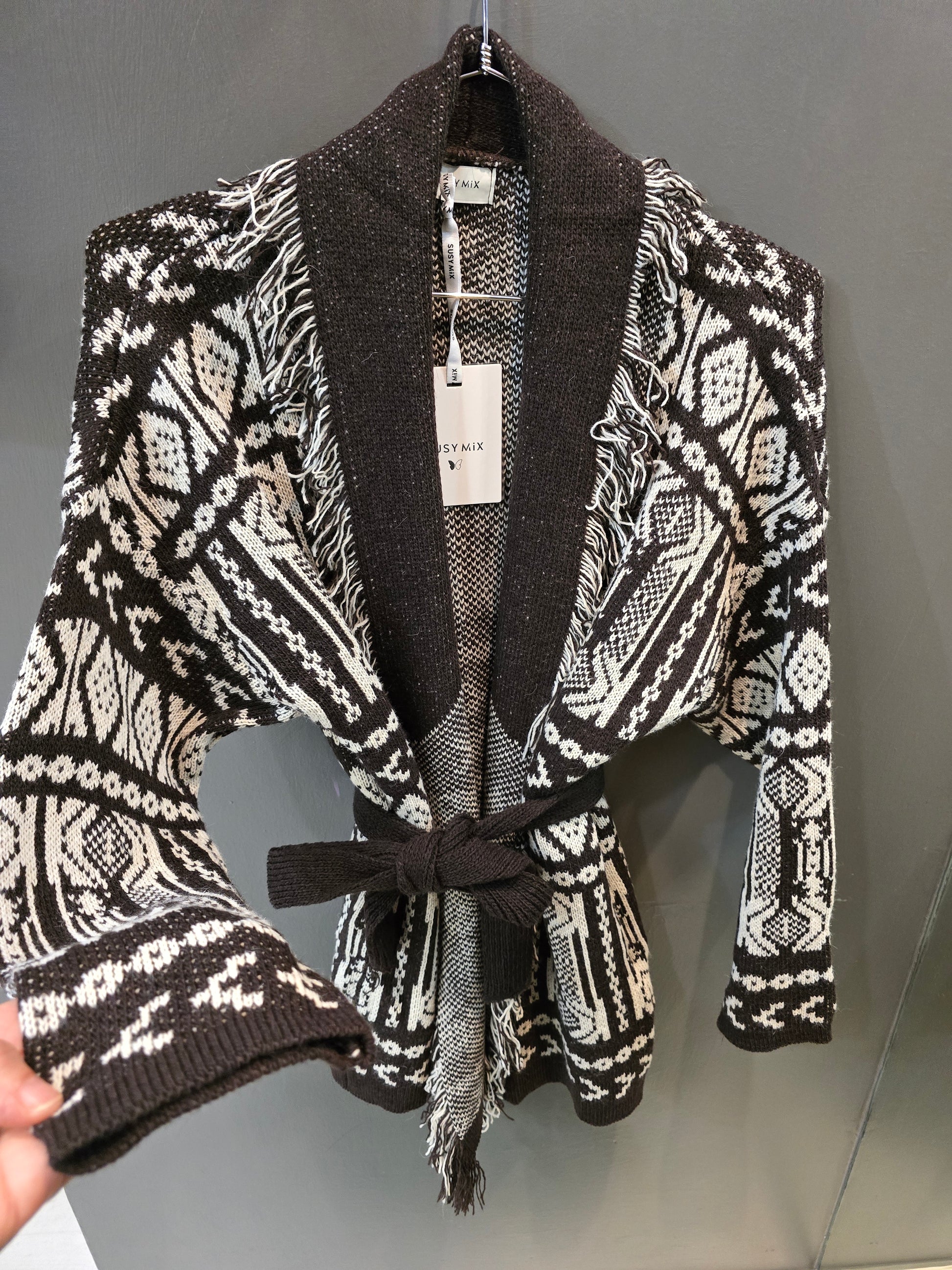Cardigan in maglia sfrangiato con disegni geometrici avorio e marrone, da legare con cintura.