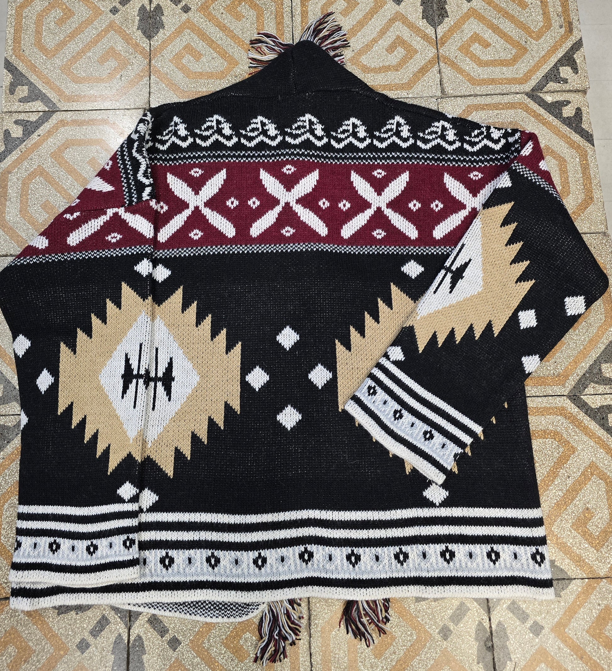 Cardigan in maglia doppia a fantasia geometrica nei colori bordeaux beige nero bianco modello con frange nell'apertura davanti in taglia unica con vestibilità comoda molto caldo da usare come giacca