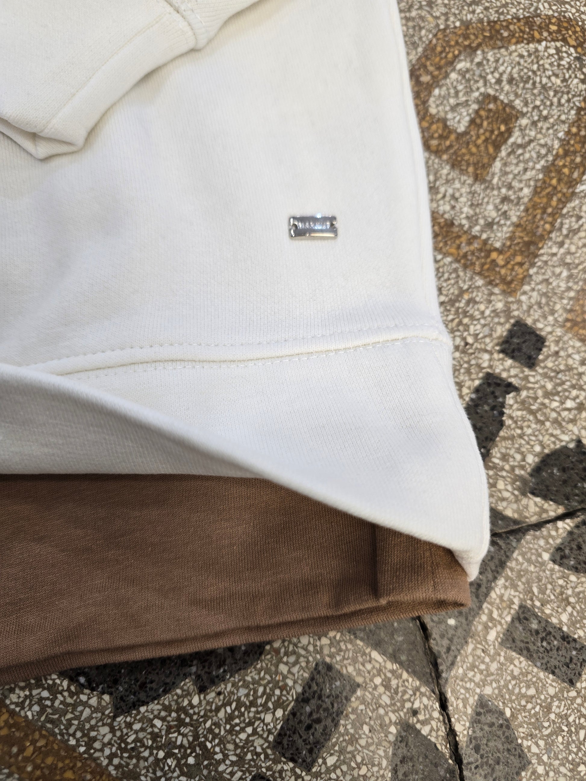 Felpa Cotone Felpato Paricollo Inserti Contrasto Collo Cinturino Avorio