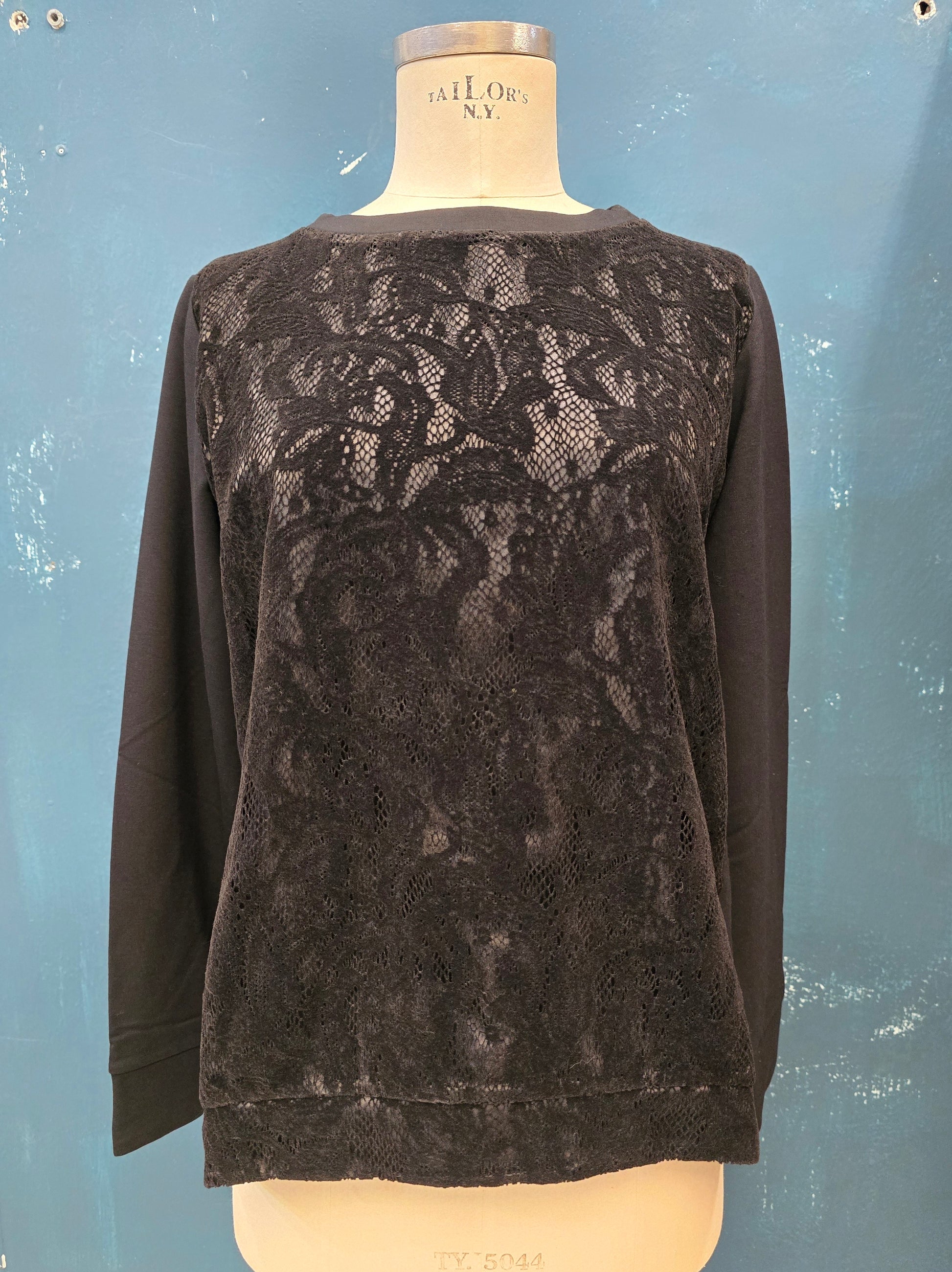 Felpa Cotone Leggermente Felpato Paricollo Pizzo Velluto Davanti Nero Taglia S