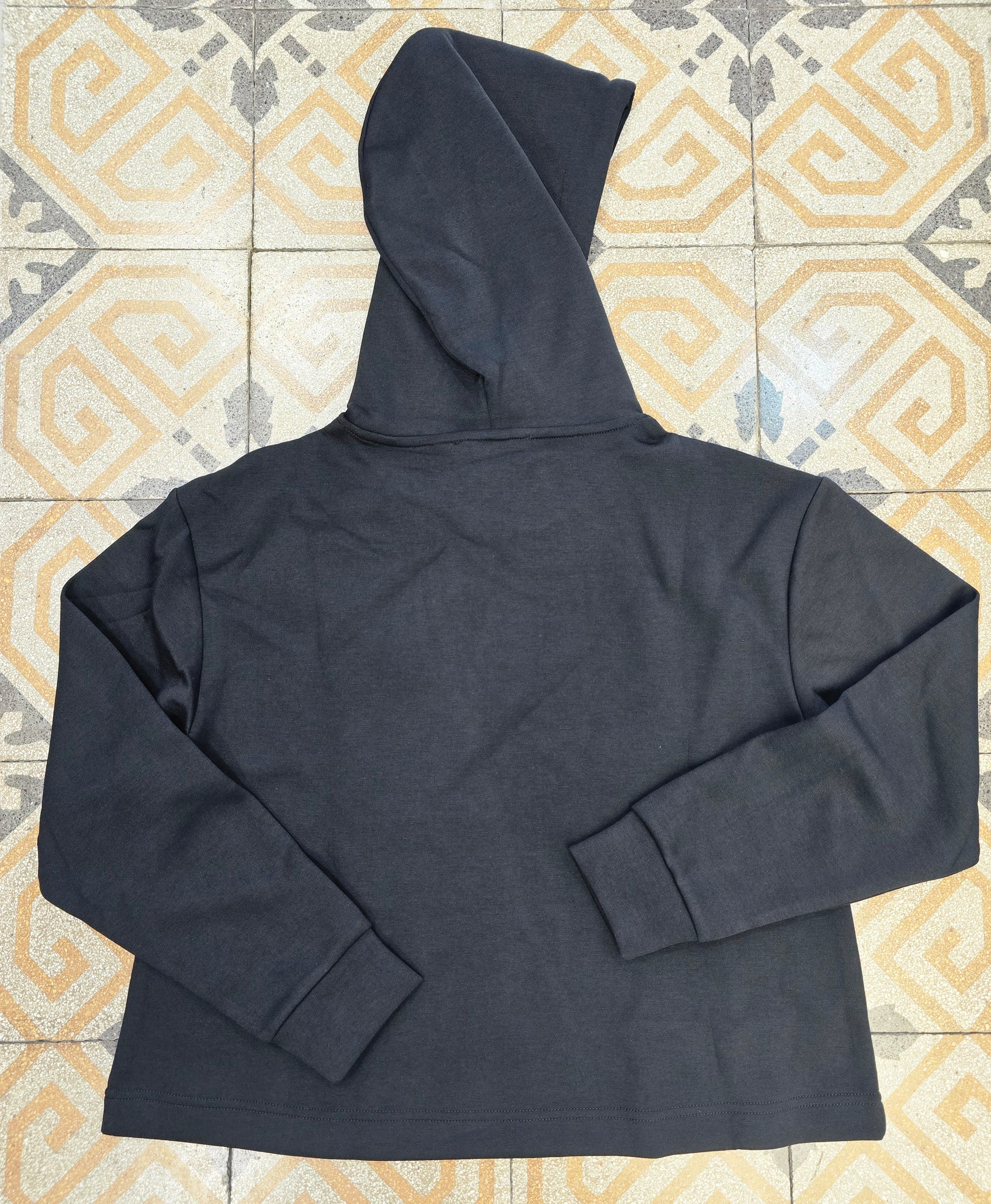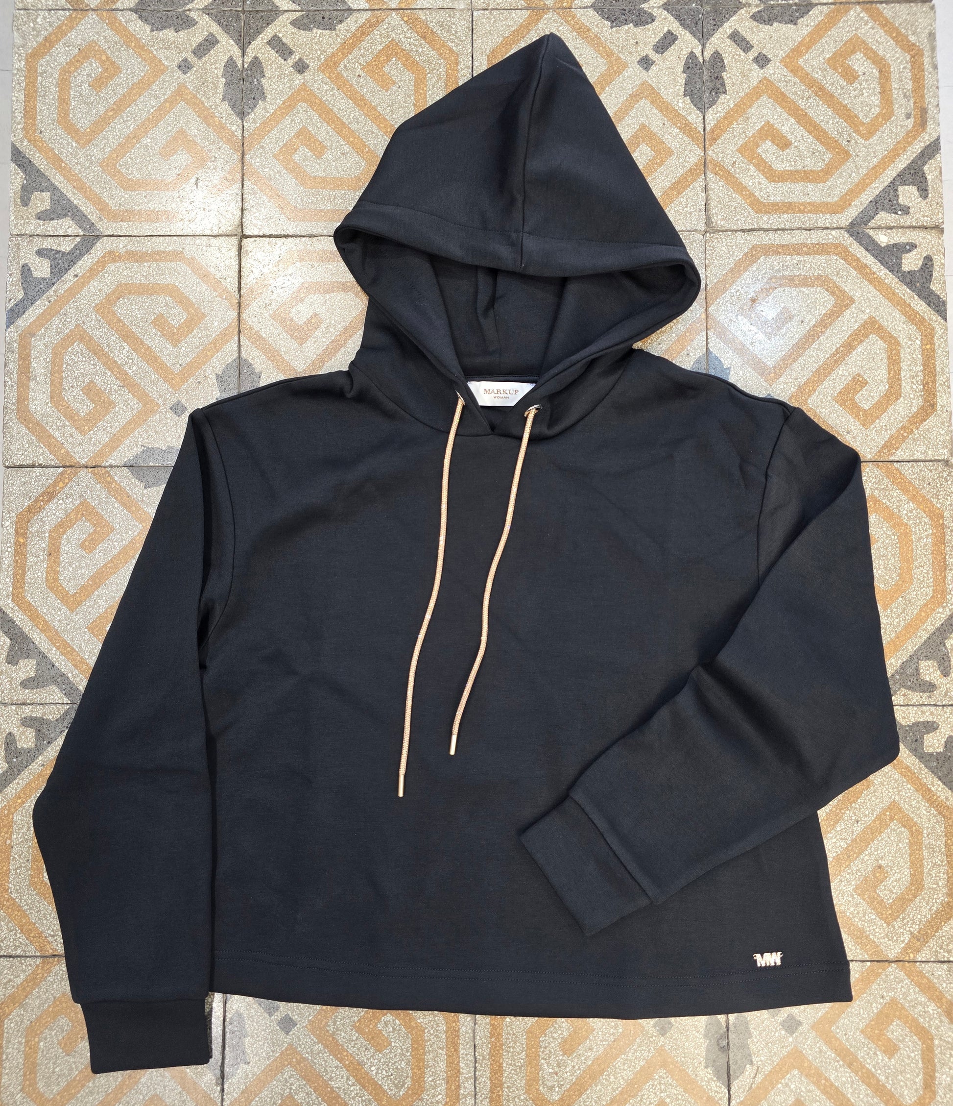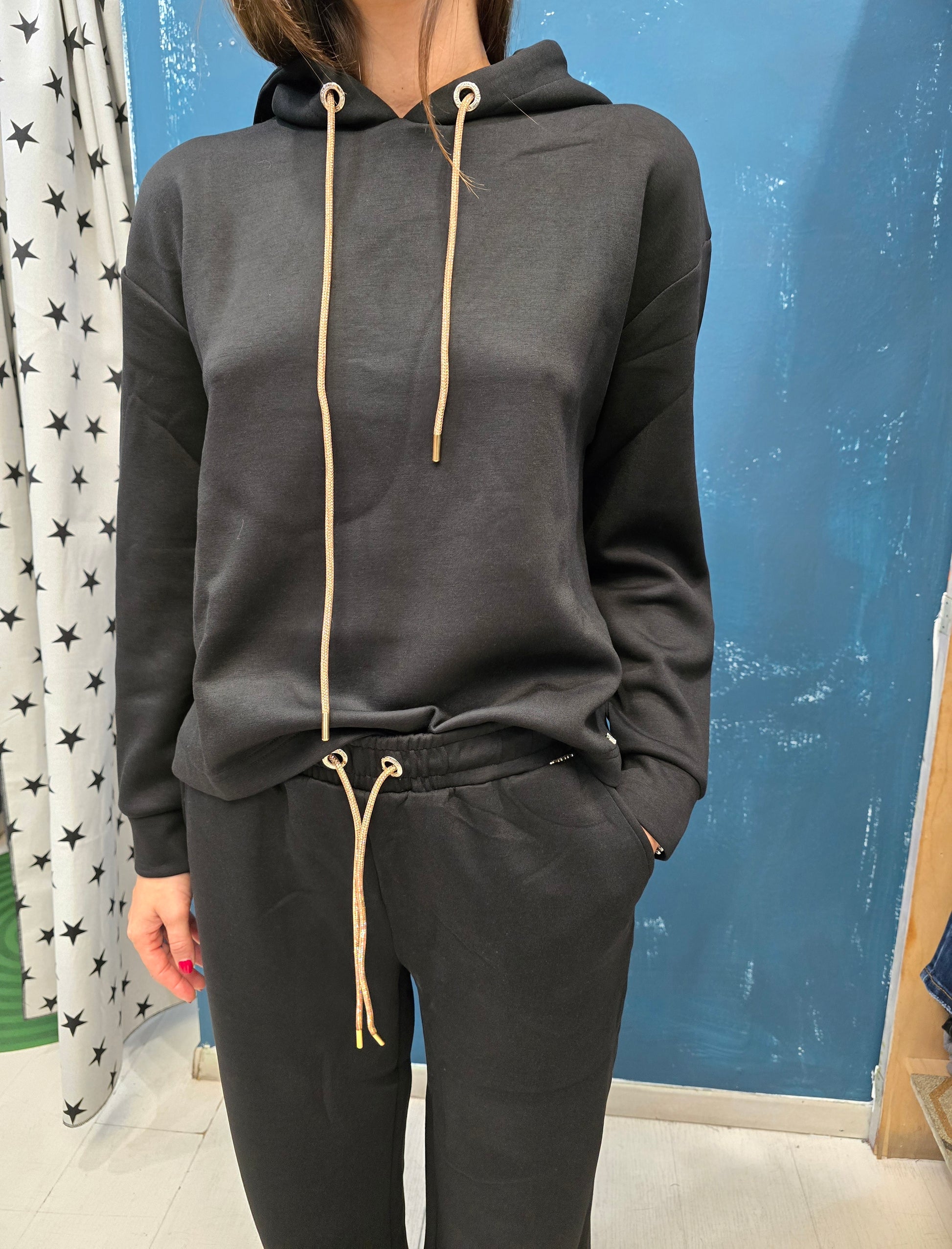 Felpa con cappuccio in tessuto interlock viscosa con coulisse decorata con strass.