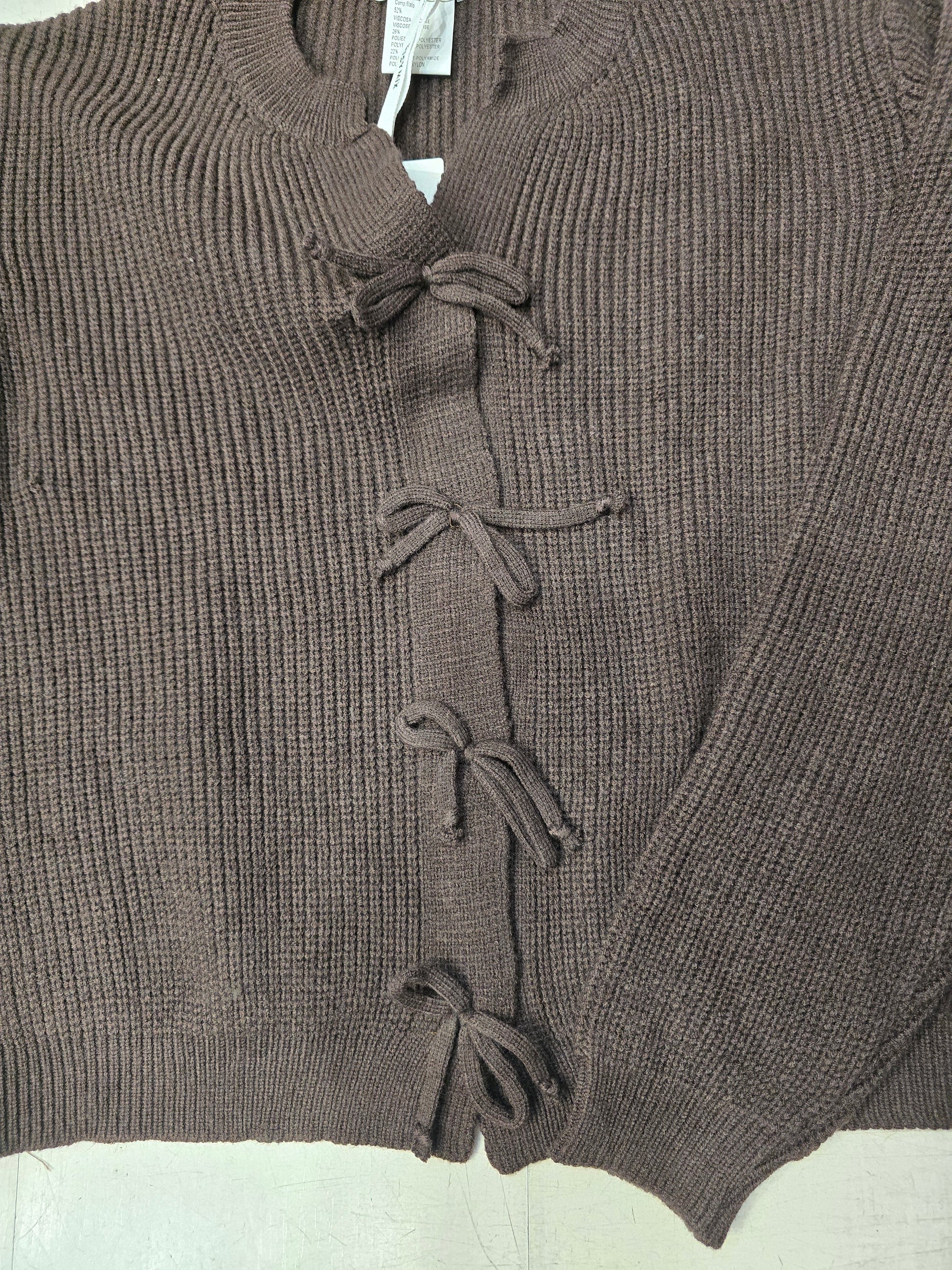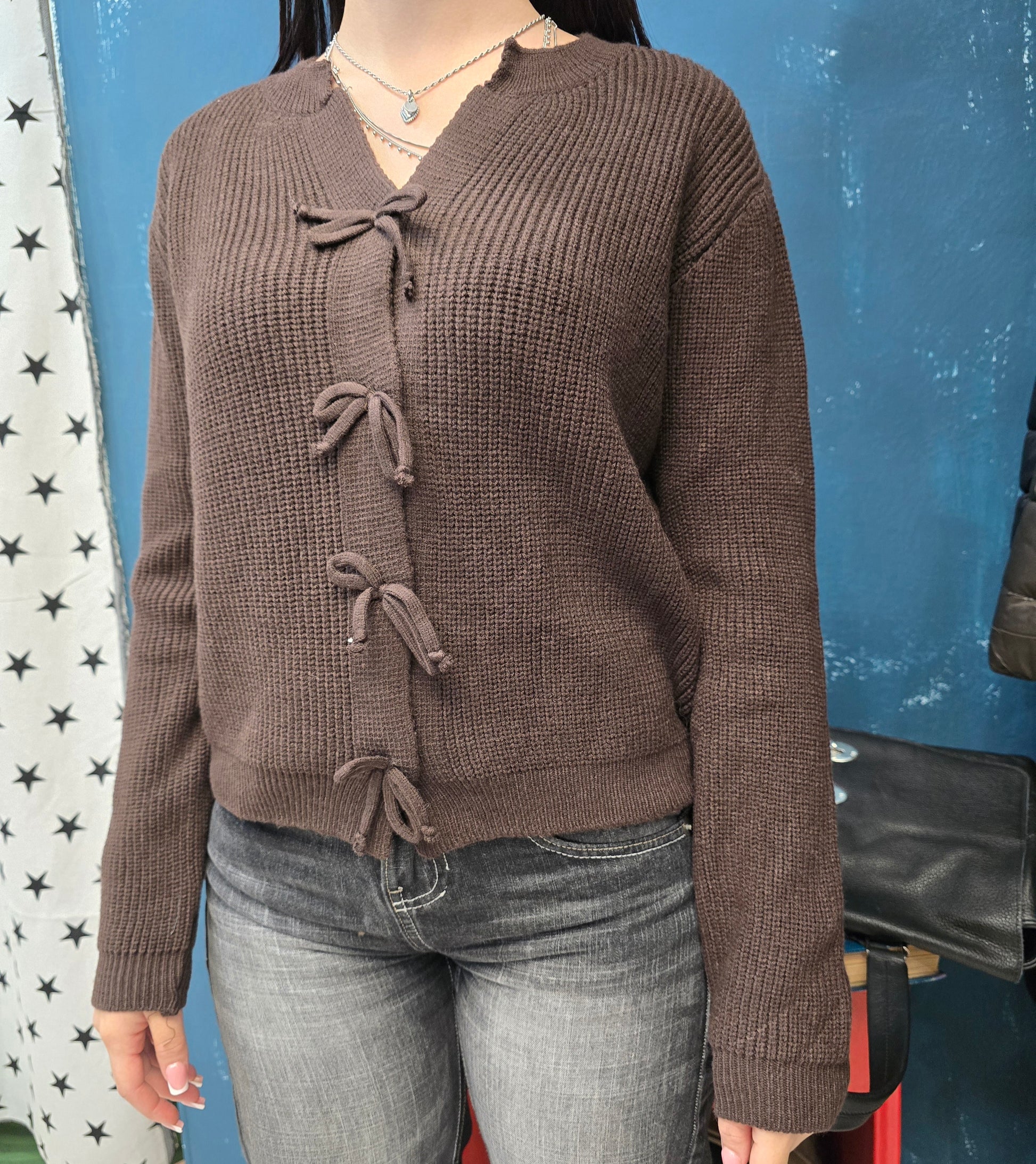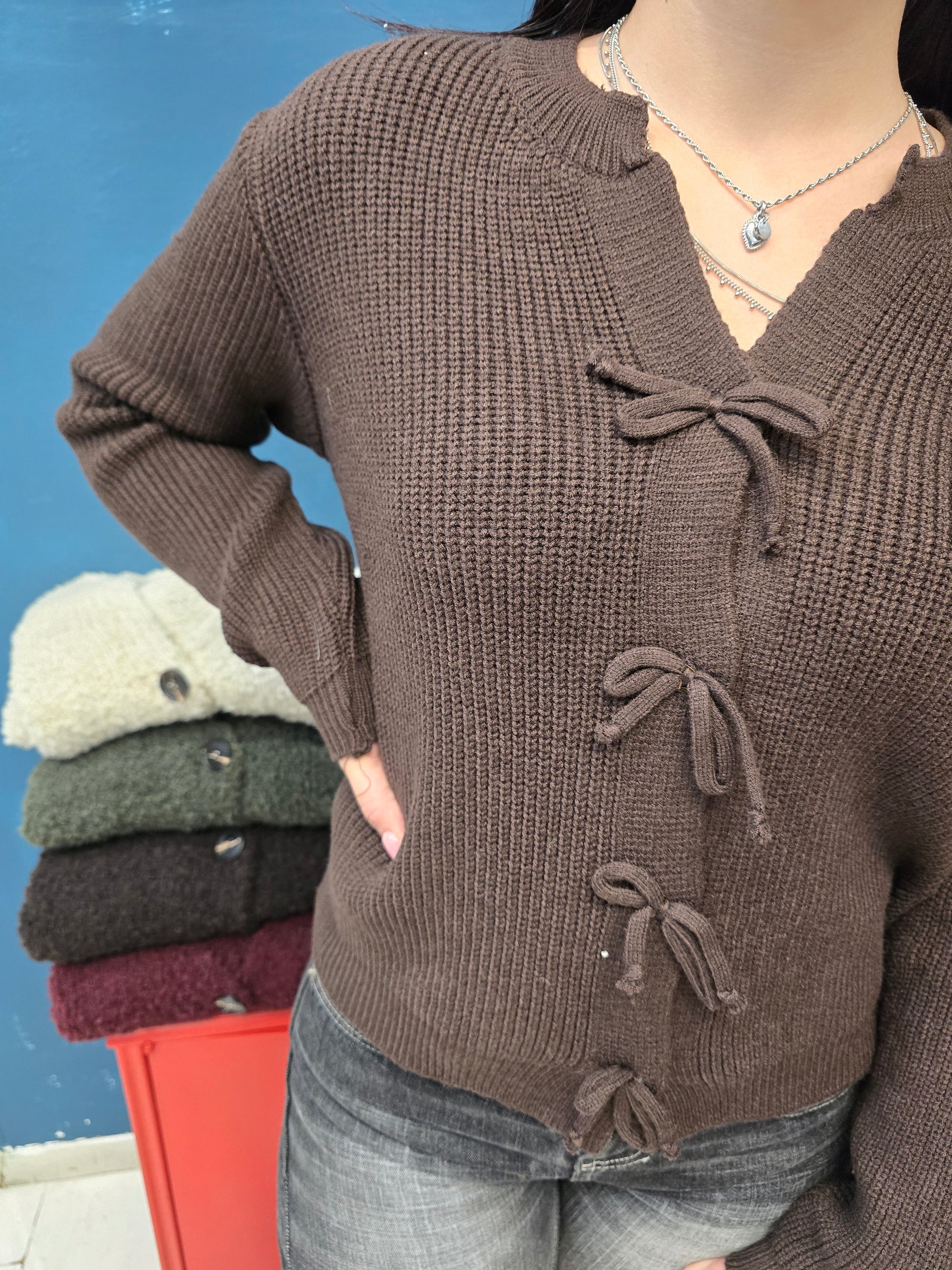 Giacca in maglia a costa inglese modello aperto con chiusura bottoni nascosti e fiocchetti di rifinitura modello in taglia unica con vestibilità regolare colore marrone e avorio