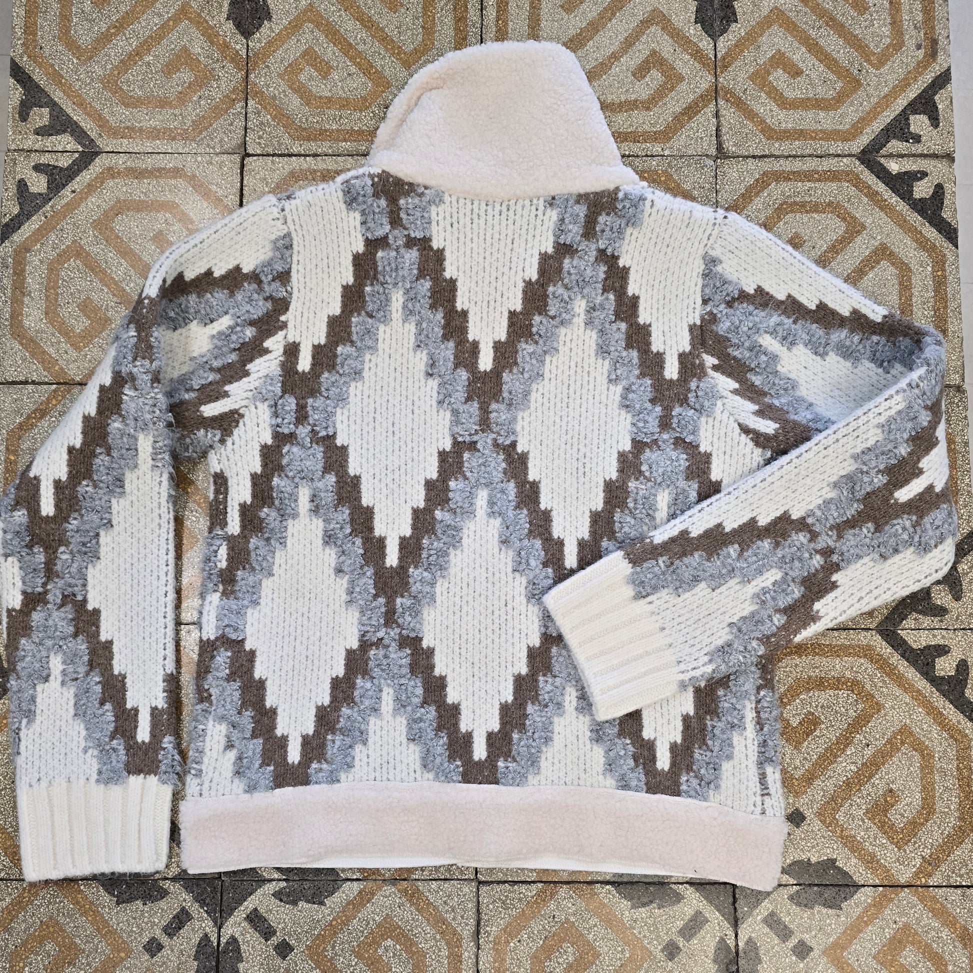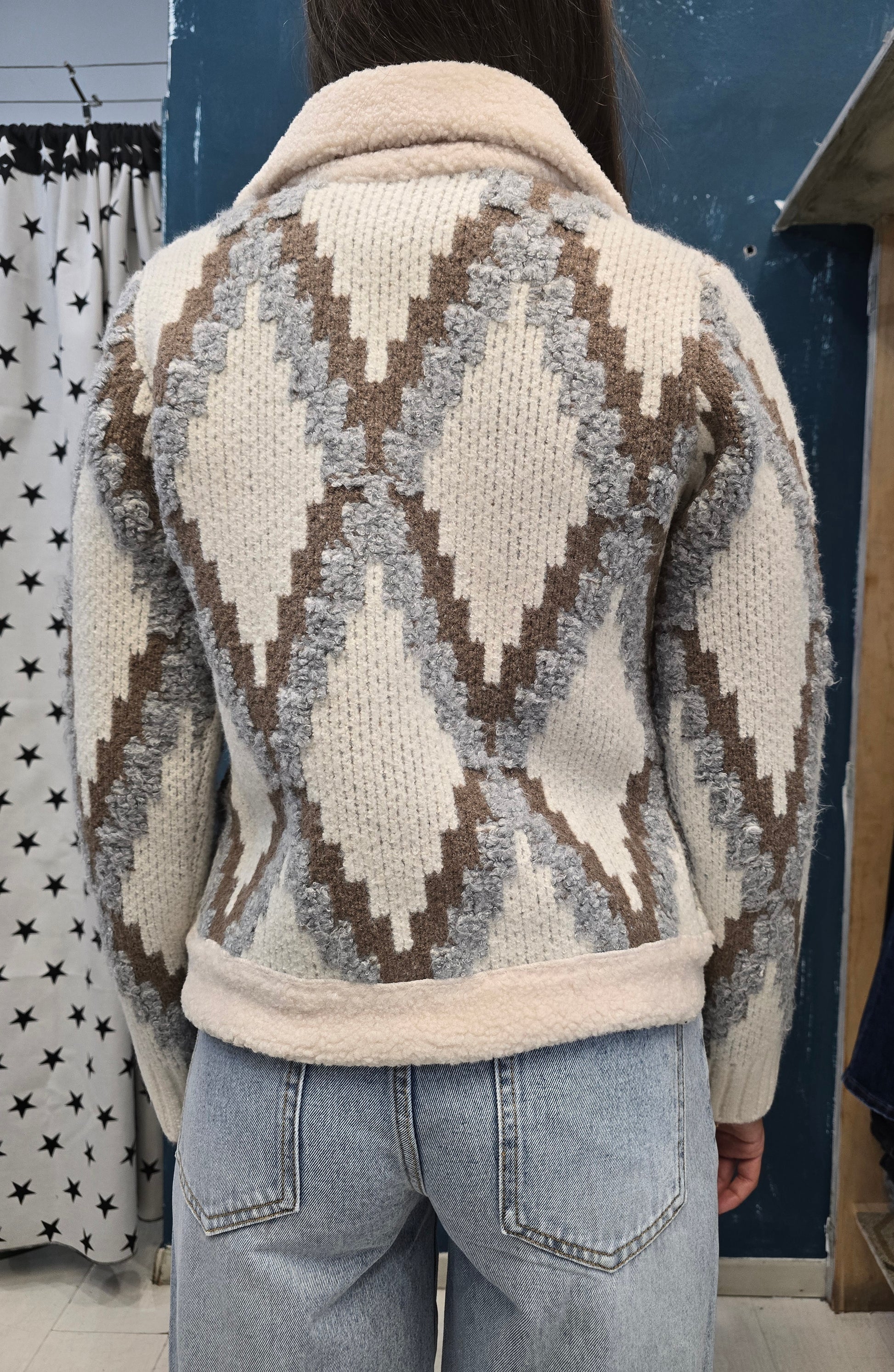 Giubbotto in maglia pesante con lavorazione jacquard e colletto abbottonato.