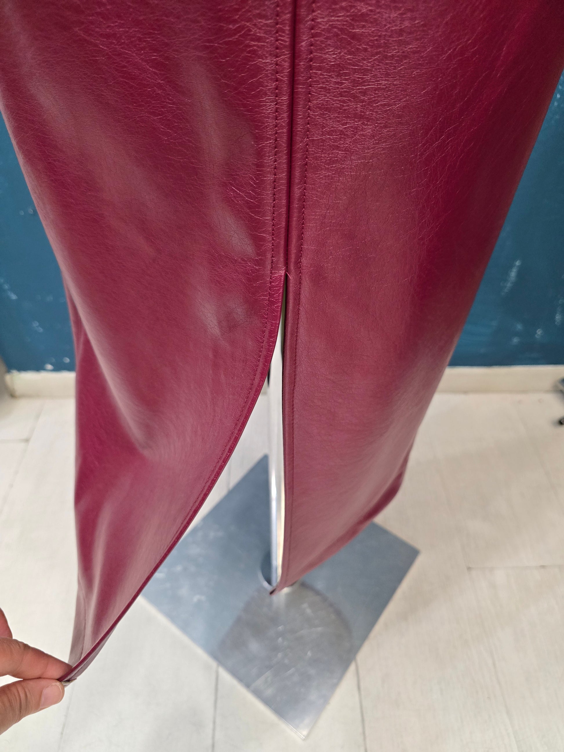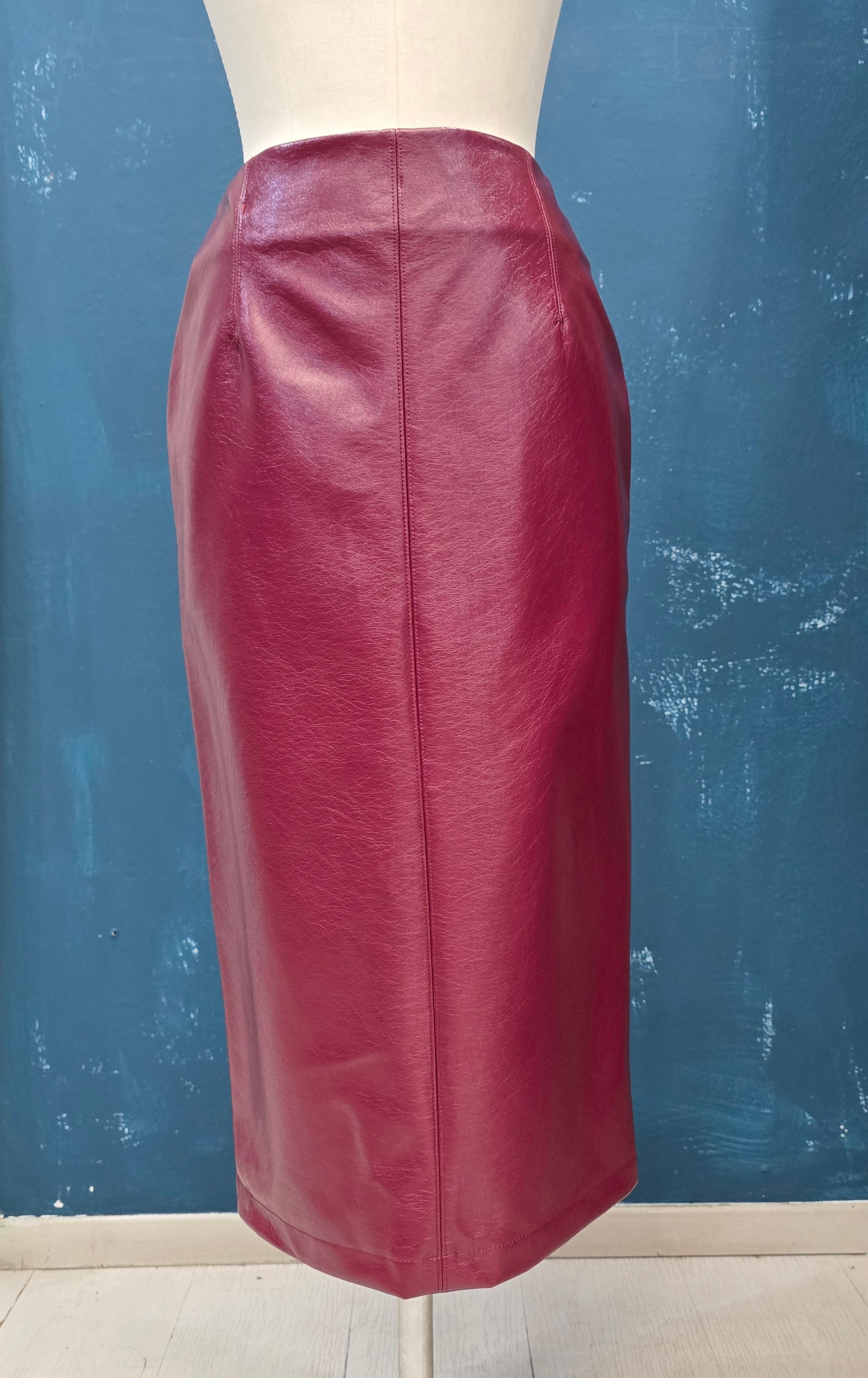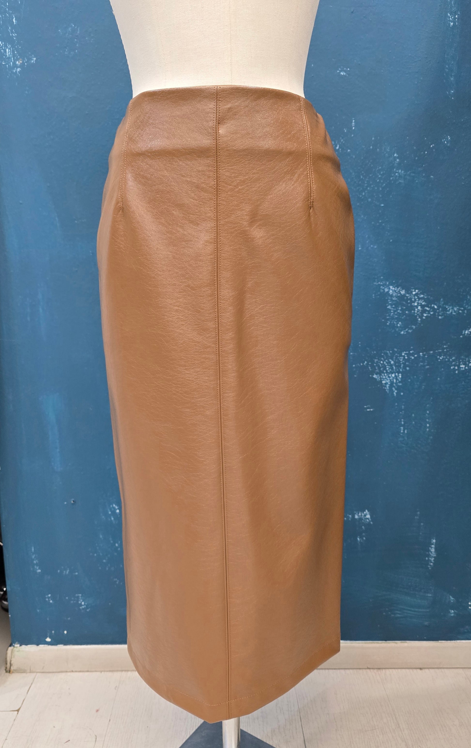 Gonna longuette in ecopelle con spacco posteriore, taglia unica.