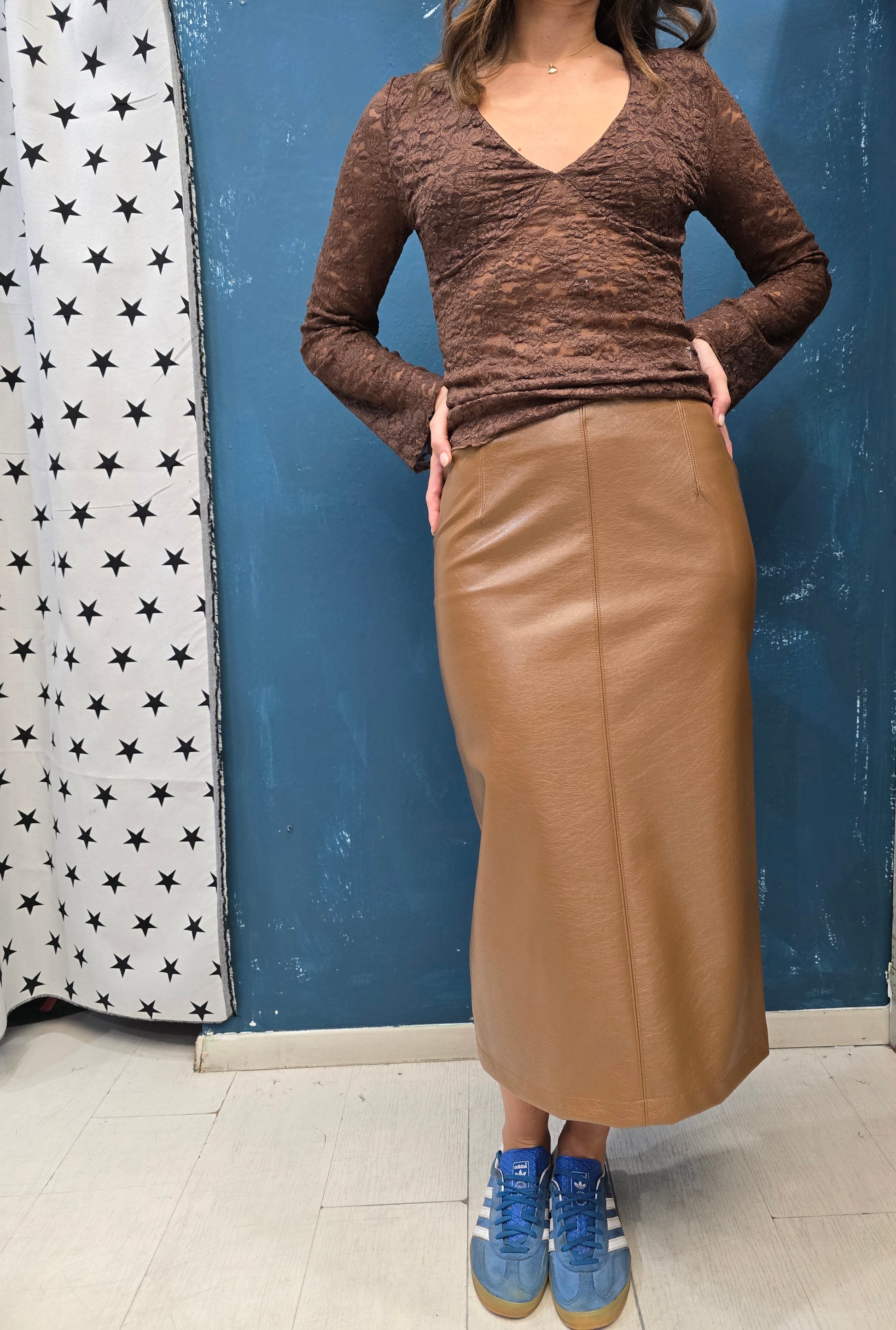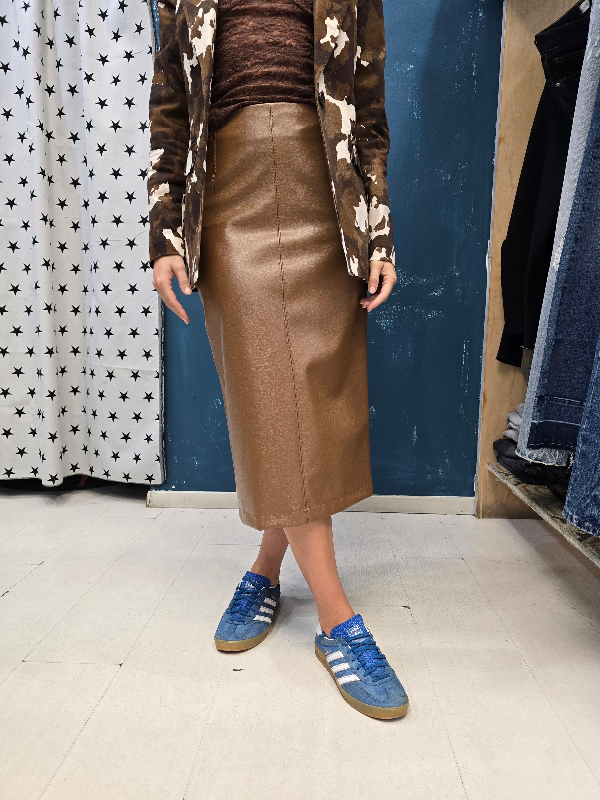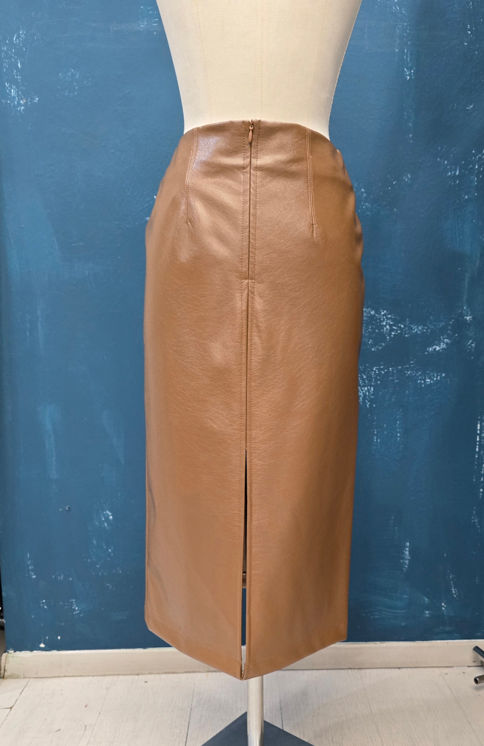 Gonna longuette in ecopelle con spacco posteriore, taglia unica.