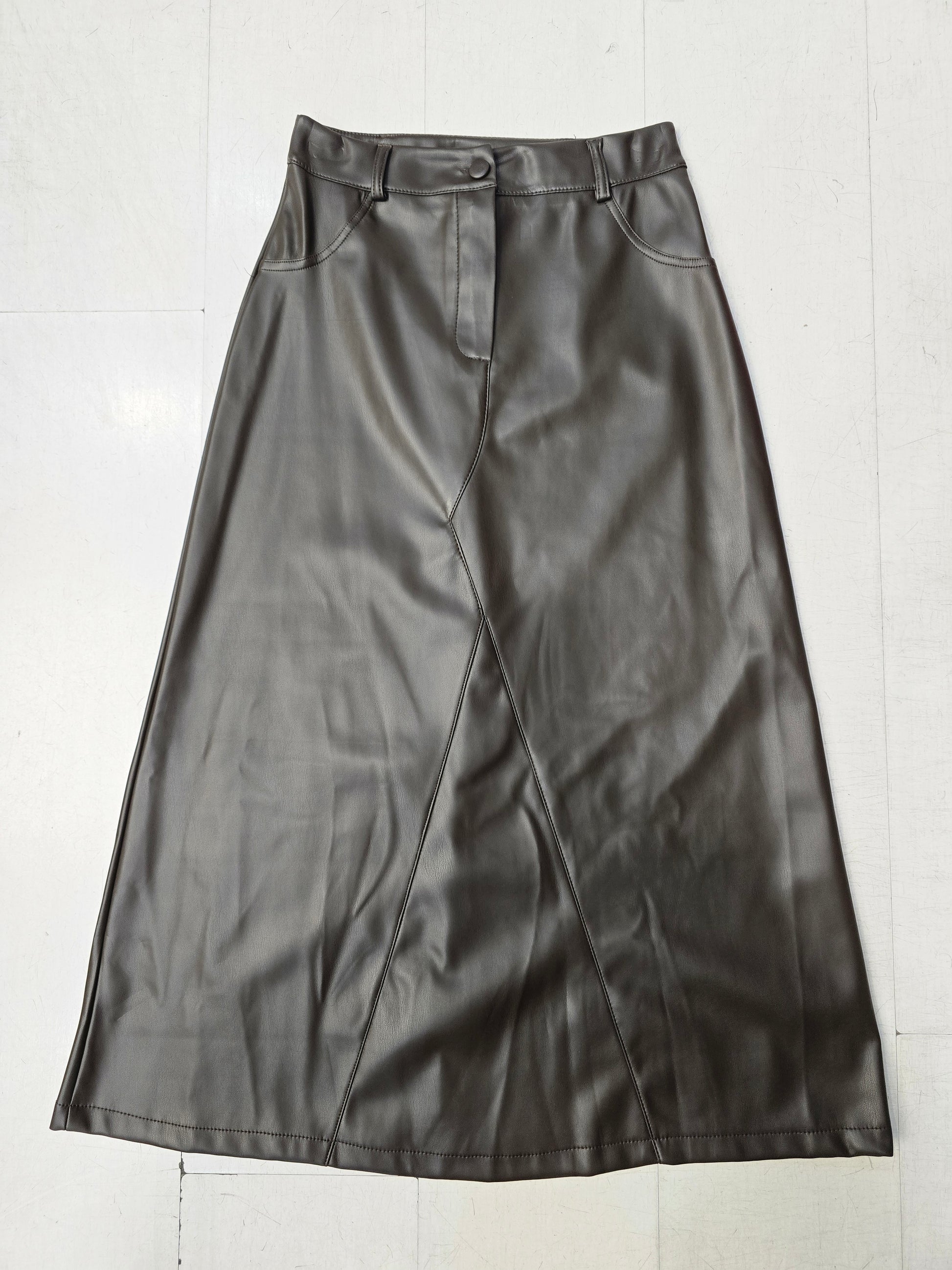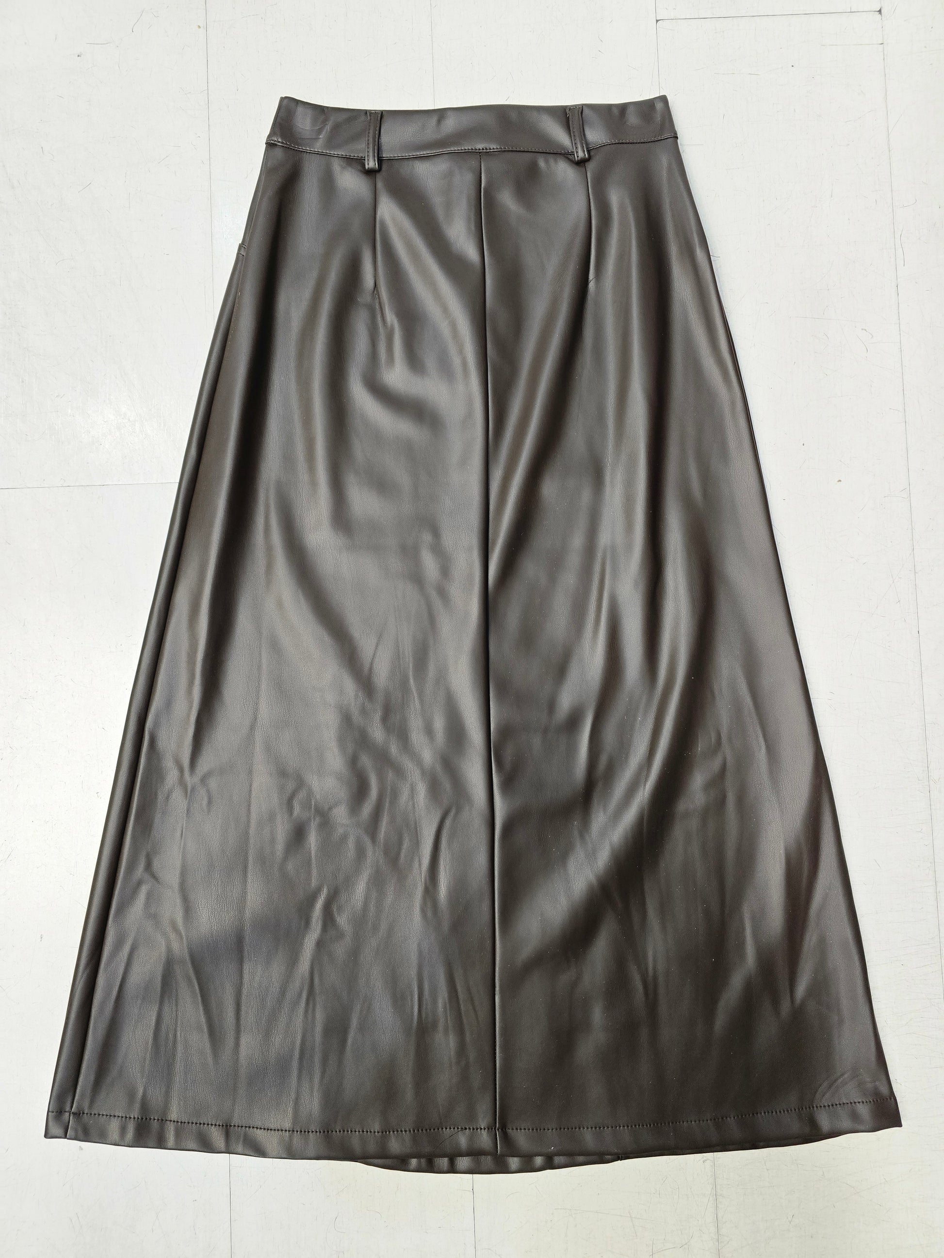 Gonna lunga in ecopelle con taglio svasato, marrone scuro taglia XS.