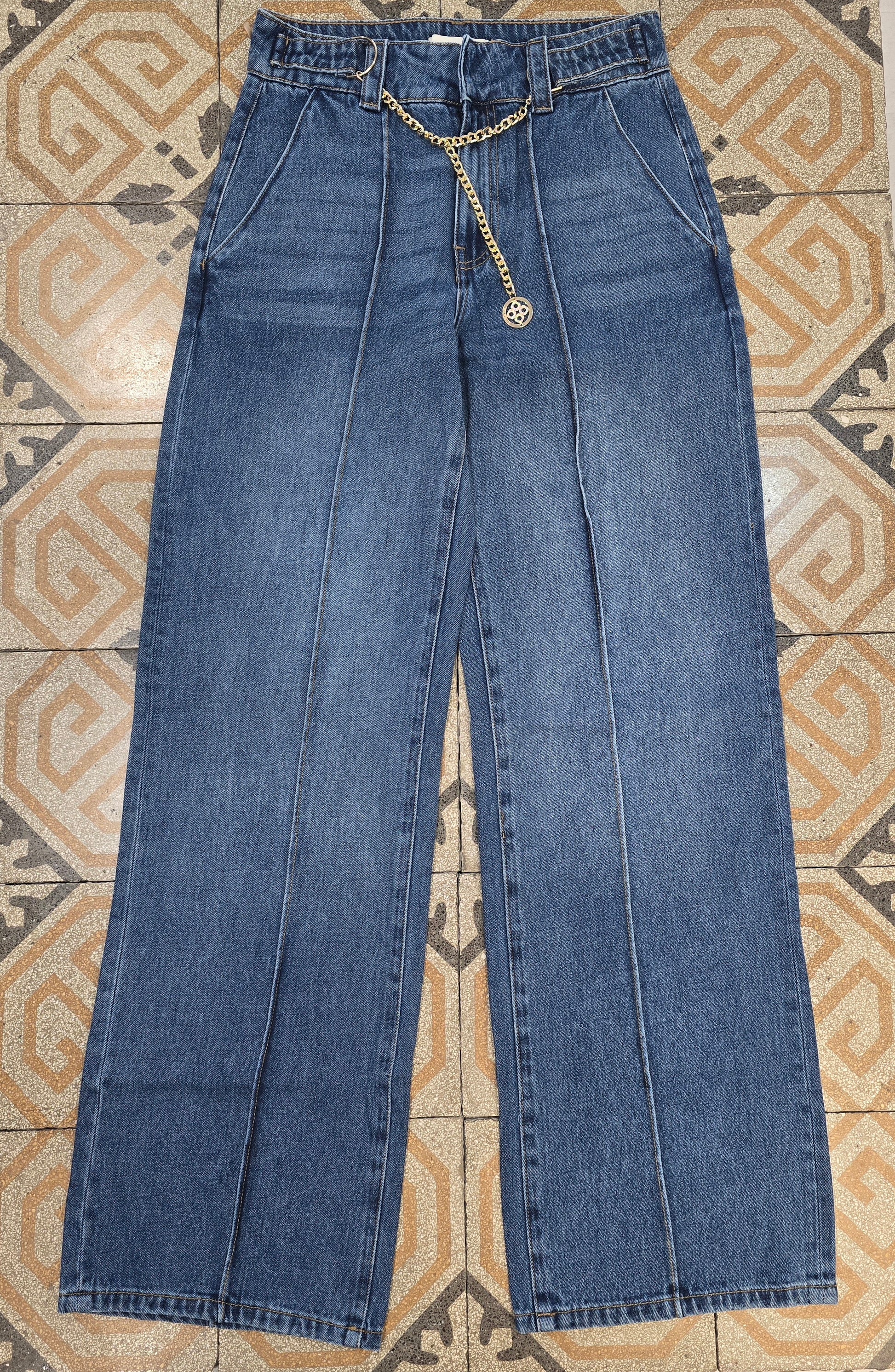 Jeans Tessuto Fermo Wide Leg Cintura Catena Dorata Blu Medio