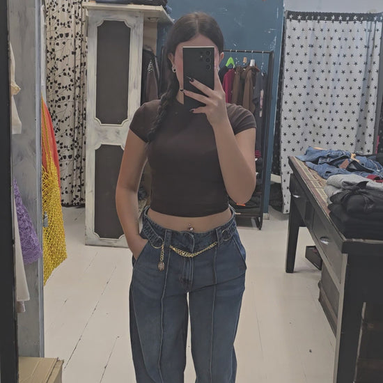Jeans wide leg in tessuto fermo blu medio con cintura catena dorata e cucitura verticale.
