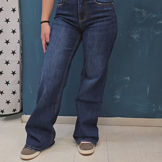 Vintage contemporaneo che allunga! Questi jeans elasticizzati flare blu unito sono perfetti per look casual retro-chic che slanciano la silhouette.