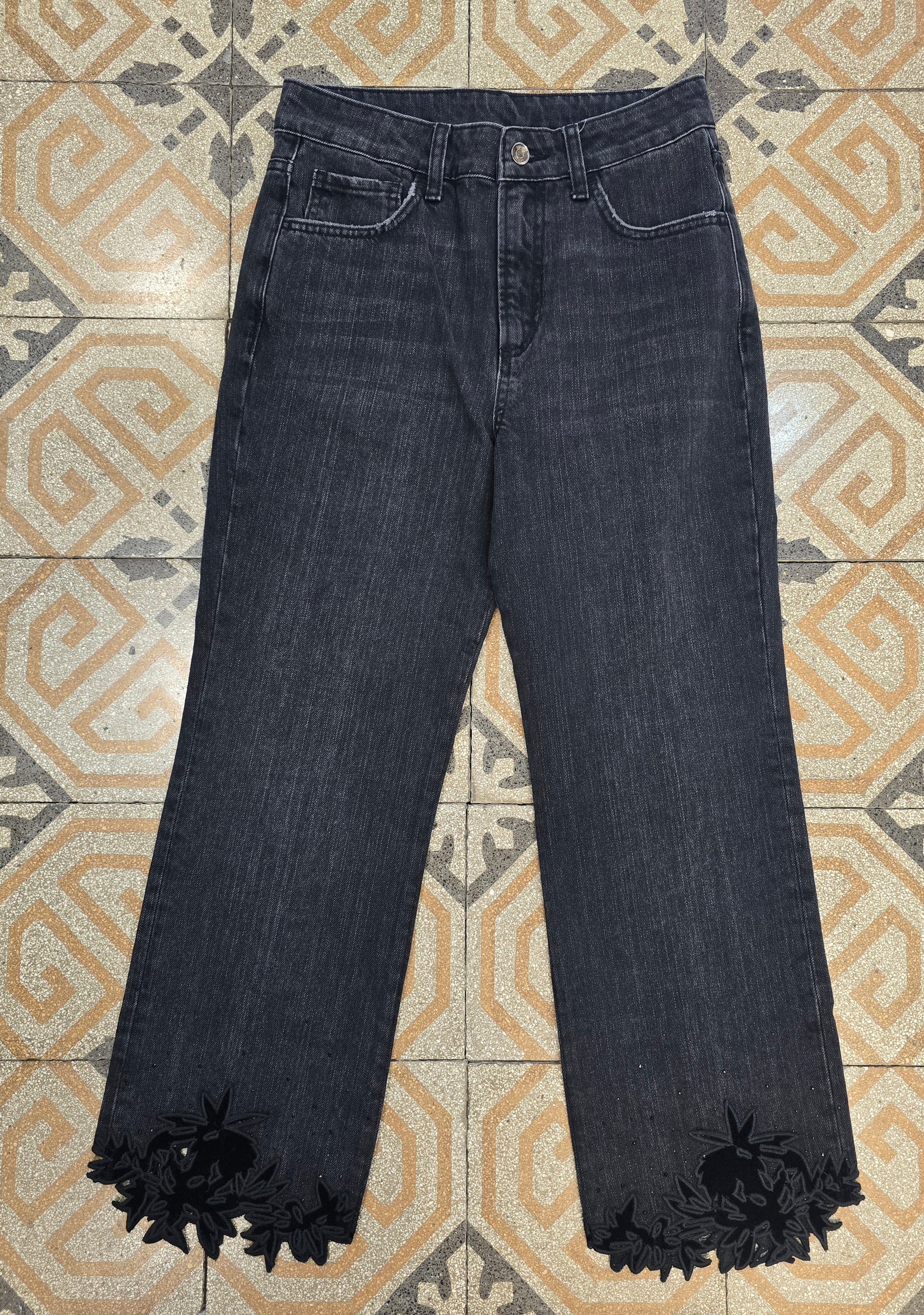 Jeans elasticizzati neri con intaglio decorativo in fondo sull'orlo, taglia 42.