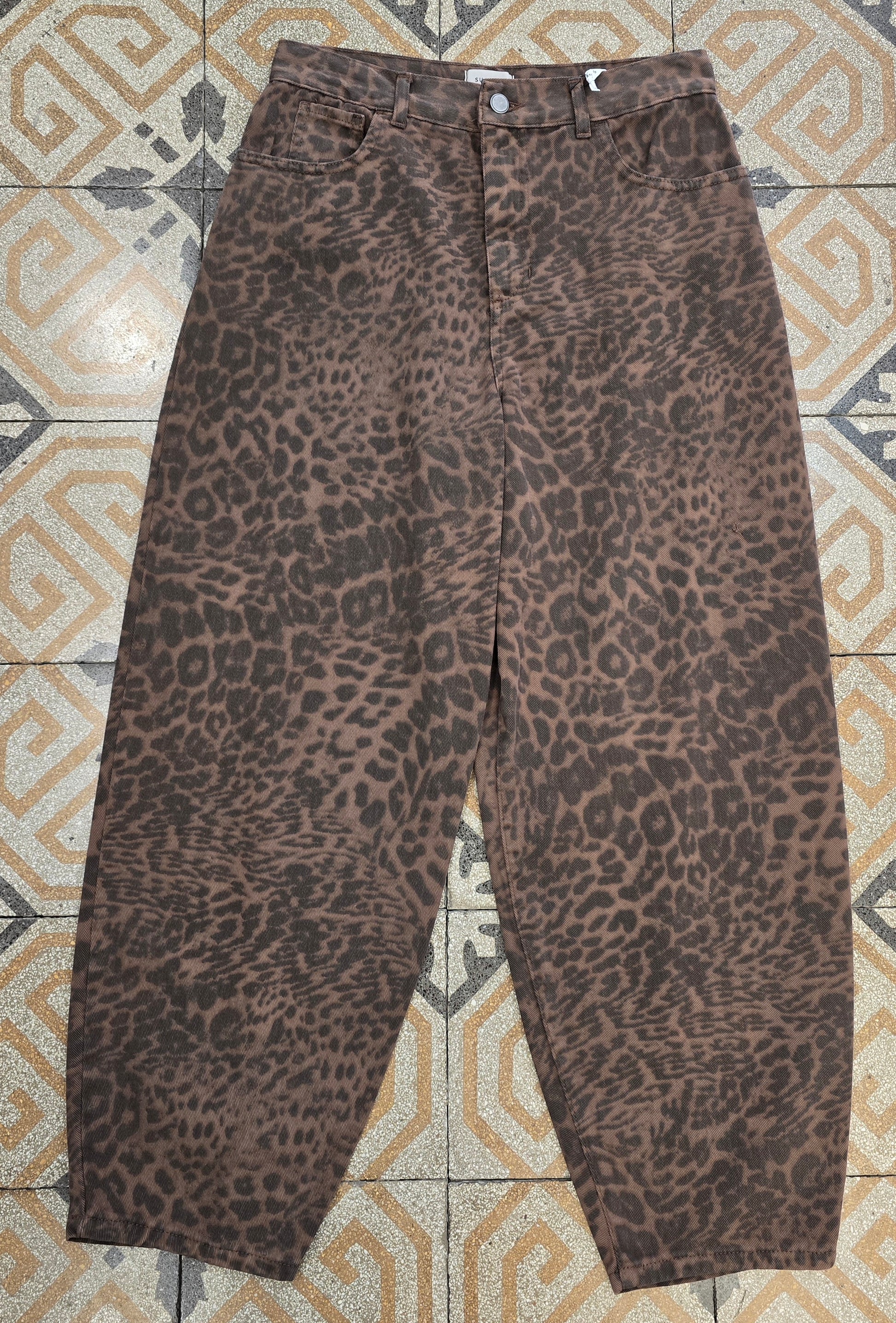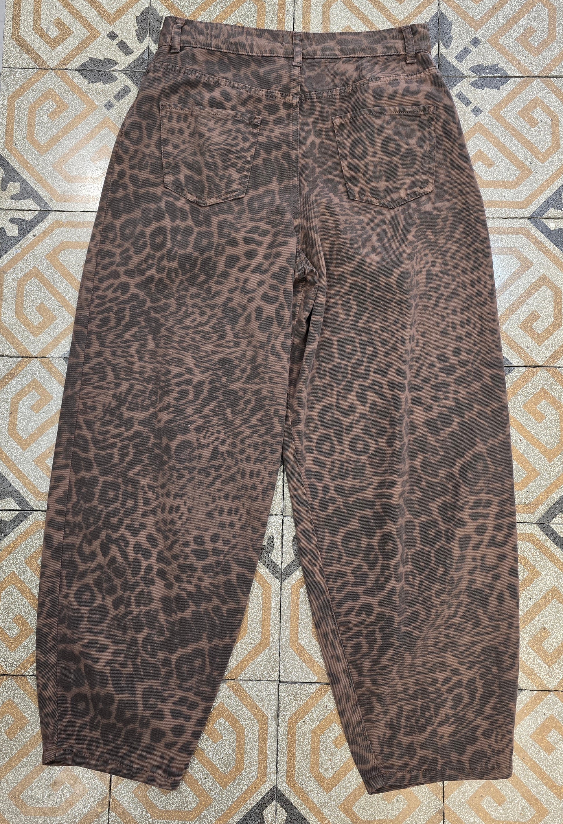 Jeans modello barrel con fantasia animalier, non elasticizzato.